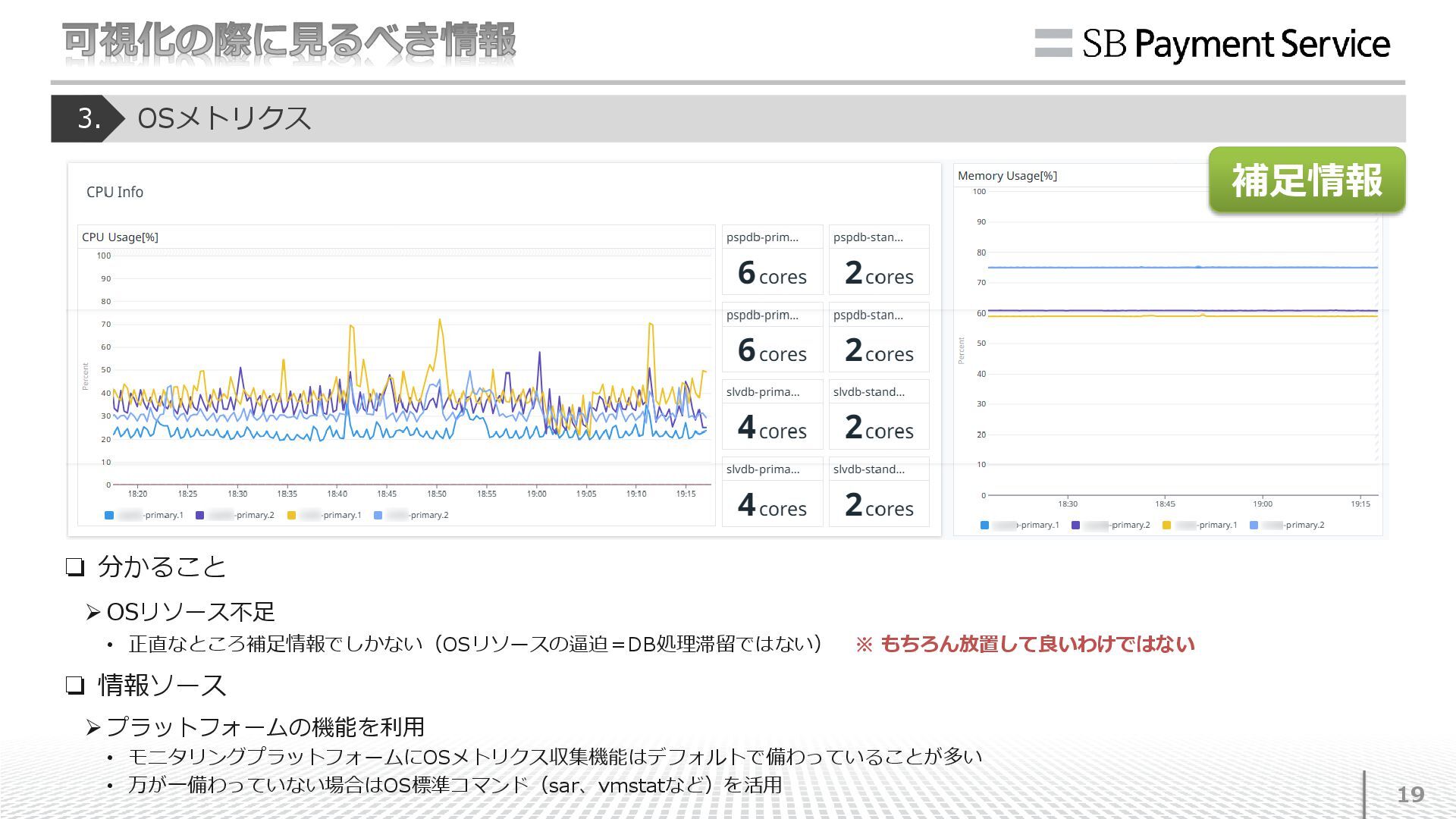 ※ もちろん放置して良いわけではない 補足情報 ❏ 情報ソース ➢ プラットフォームの機能を利用 • モニタリングプラットフォームにOSメトリクス収集機能はデフォルトで備わっていることが多い • 万が一備わっていない場合はOS標準コマンド(sar、vmstatなど)を活用
