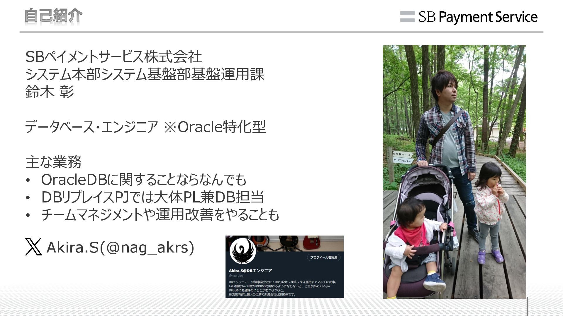 自己紹介 SBペイメントサービス株式会社 システム本部システム基盤部基盤運用課 鈴木 彰 データベース・エンジニア ※Oracle特化型 主な業務 • OracleDBに関することならなんでも
