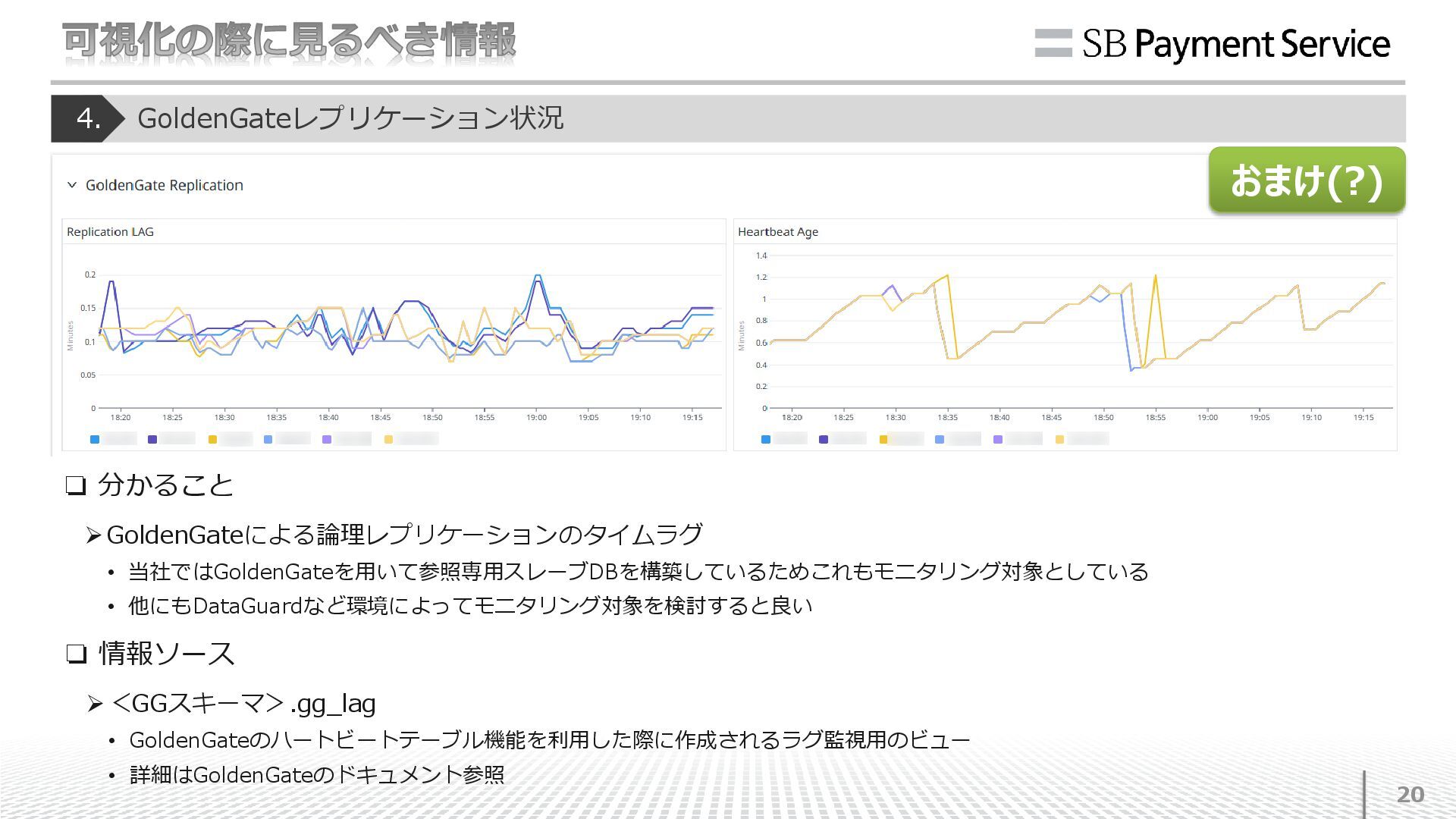 可視化の際に見るべき情報 20 4. GoldenGateレプリケーション状況 ❏ 分かること ➢GoldenGateによる論理レプリケーションのタイムラグ • 当社ではGoldenGateを用いて参照専用スレーブDBを構築しているためこれもモニタリング対象としている •
