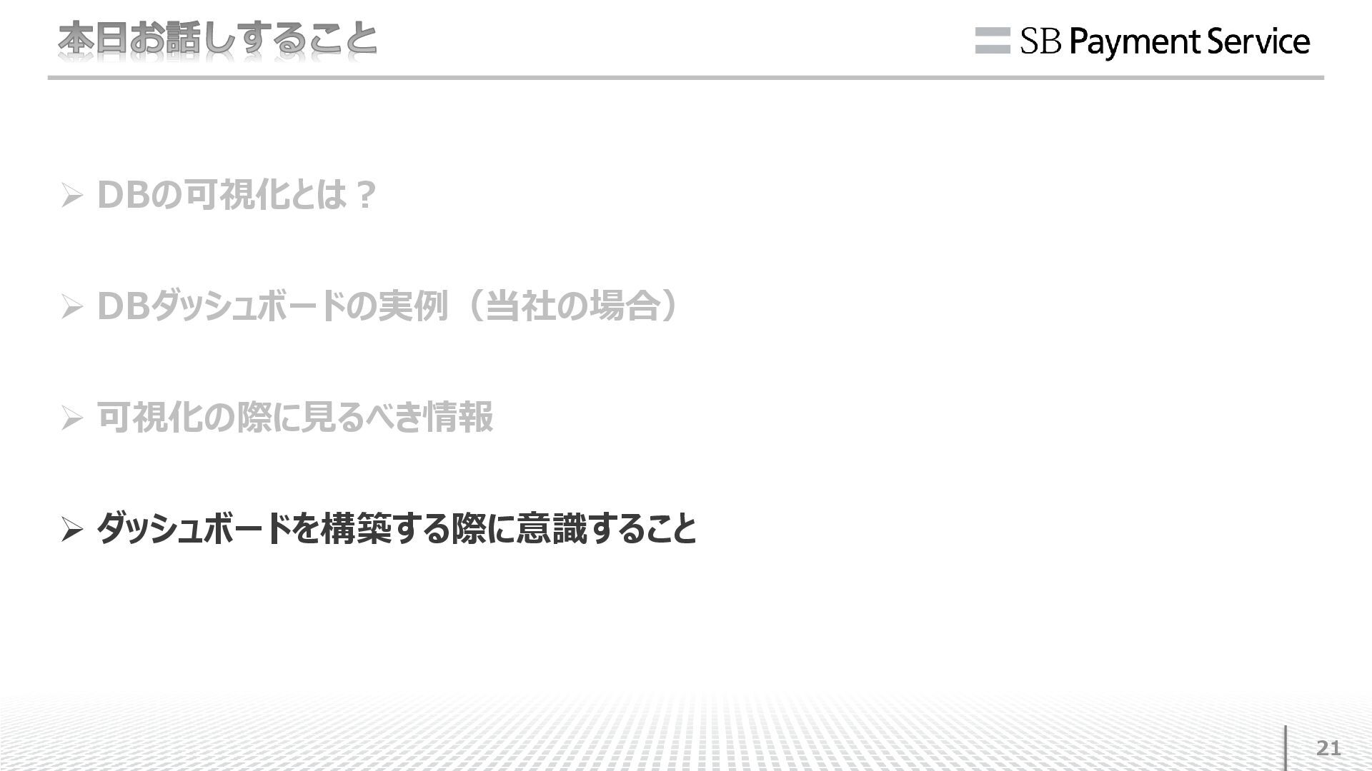 本日お話しすること 21 ➢ DBの可視化とは? ➢ DBダッシュボードの実例(当社の場合) ➢ 可視化の際に見るべき情報 ➢ ダッシュボードを構築する際に意識すること