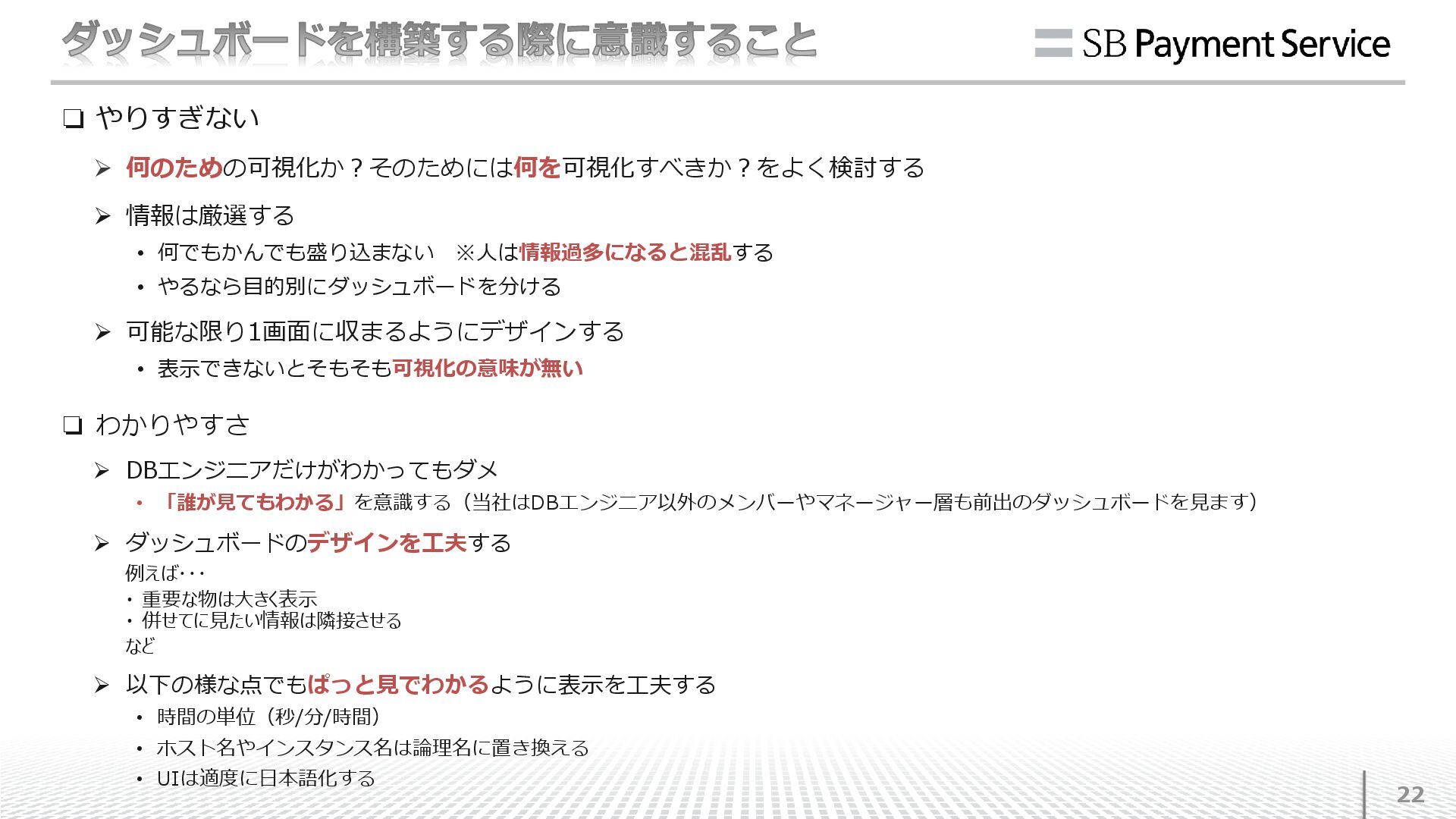 ※人は情報過多になると混乱する • やるなら目的別にダッシュボードを分ける ➢ 可能な限り1画面に収まるようにデザインする • 表示できないとそもそも可視化の意味が無い ❏ わかりやすさ ➢ DBエンジニアだけがわかってもダメ • 「誰が見てもわかる」を意識する(当社はDBエンジニア以外のメンバーやマネージャー層も前出のダッシュボードを見ます) ➢ ダッシュボードのデザインを工夫する 例えば・・・ ・ 重要な物は大きく表示 ・ 併せてに見たい情報は隣接させる など ➢ 以下の様な点でもぱっと見でわかるように表示を工夫する • 時間の単位(秒/分/時間) • ホスト名やインスタンス名は論理名に置き換える • UIは適度に日本語化する