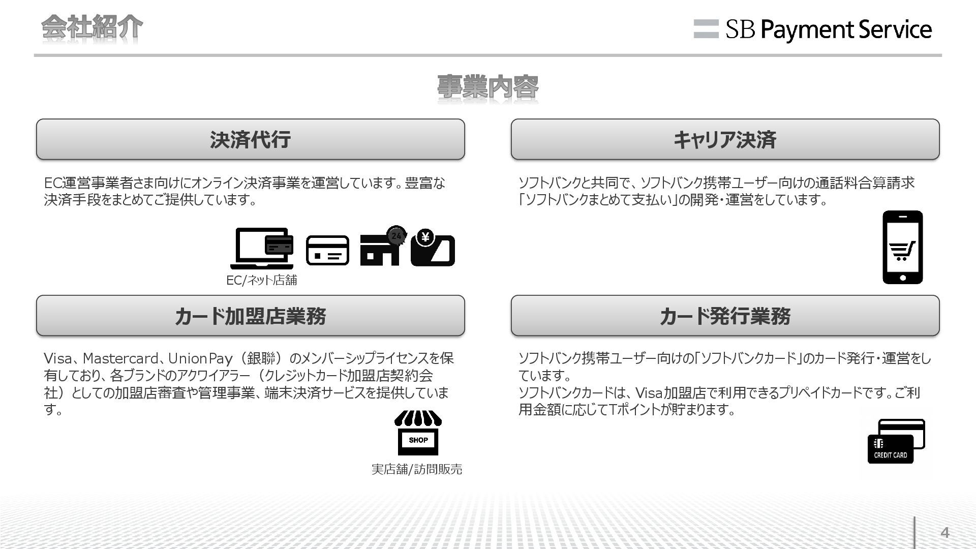 会社紹介 3 インターネット コンテンツ 決済・金融 通信 海外投資 その他 Softbankグループ ソフトバンク傘下の決済分野における中核事業会社