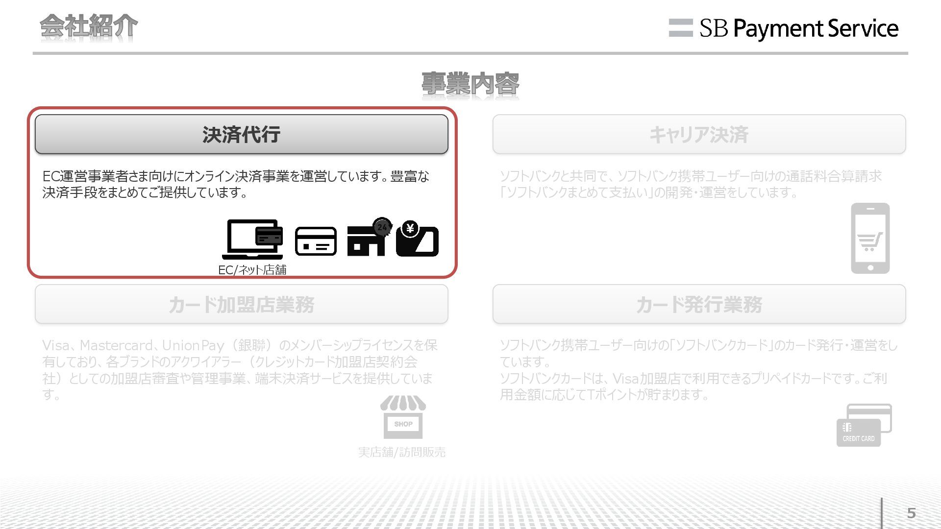 会社紹介 4 ソフトバンク携帯ユーザー向けの「ソフトバンクカード」のカード発行・運営をし ています。 ソフトバンクカードは、Visa加盟店で利用できるプリペイドカードです。ご利 用金額に応じてTポイントが貯まります。 カード発行業務 決済代行 EC運営事業者さま向けにオンライン決済事業を運営しています。豊富な 決済手段をまとめてご提供しています。