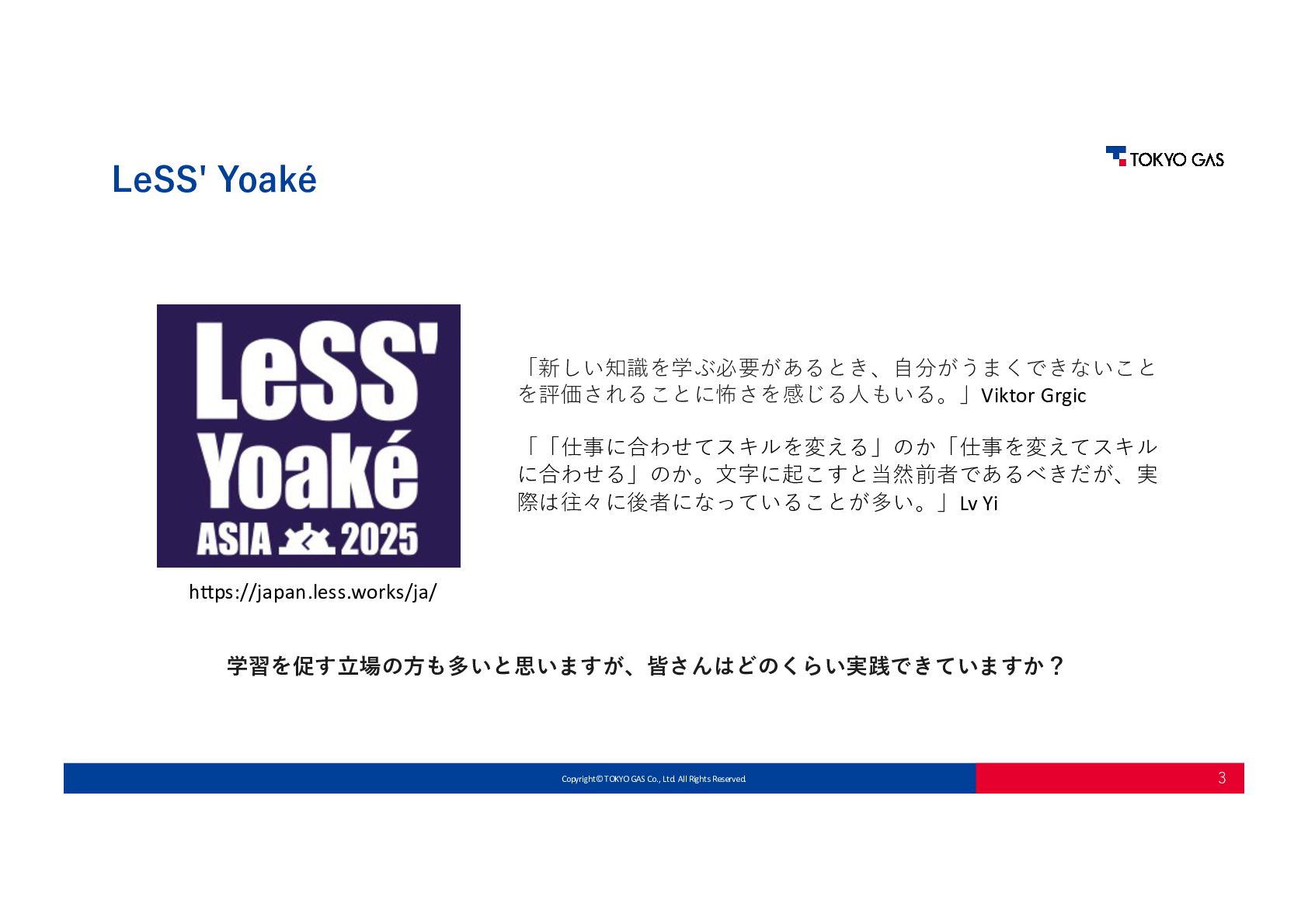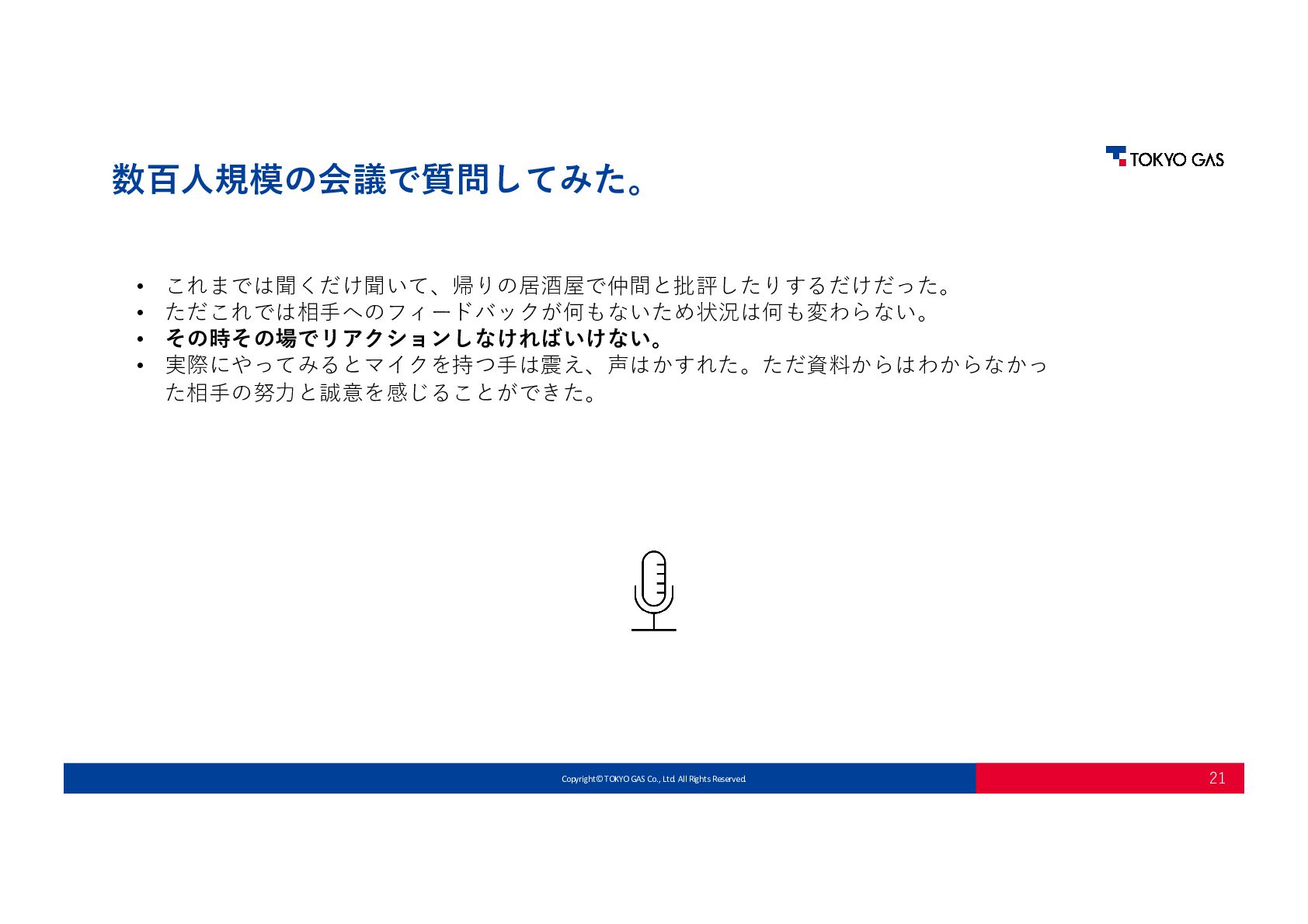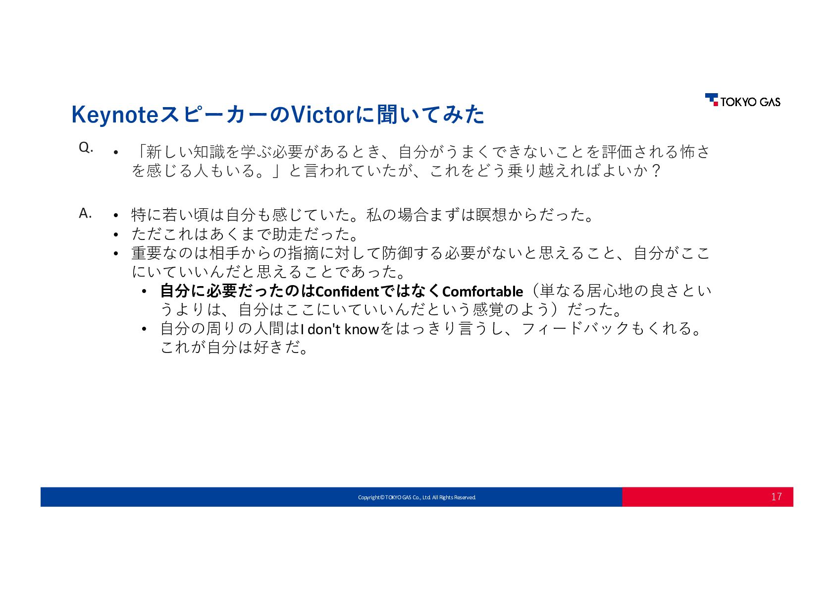 • 「新しい知識を学ぶ必要があるとき、⾃分がうまくできないことを評価される怖さ を感じる⼈もいる。」と⾔われていたが、これをどう乗り越えればよいか? • 特に若い頃は⾃分も感じていた。私の場合まずは瞑想からだった。 • ただこれはあくまで助⾛だった。 • 重要なのは相⼿からの指摘に対して防御する必要がないと思えること、⾃分がここ にいていいんだと思えることであった。 • ⾃分に必要だったのはConfidentではなくComfortable(単なる居⼼地の良さとい うよりは、⾃分はここにいていいんだという感覚のよう)だった。 • ⾃分の周りの⼈間はI don't knowをはっきり⾔うし、フィードバックもくれる。 これが⾃分は好きだ。 Q. A.