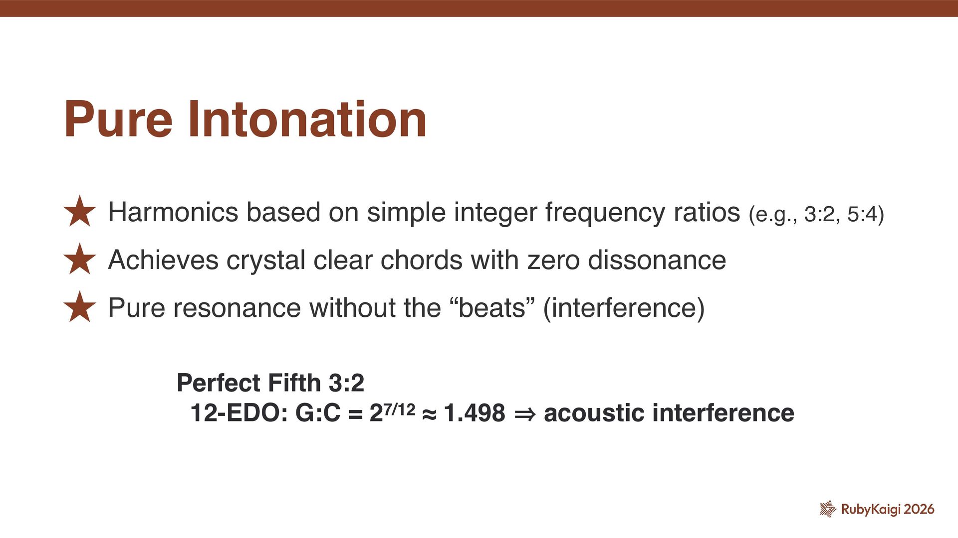 5:4) ˒ Achieves crystal clear chords with zero dissonance ˒ Pure resonance without the “beats” (interference) Pure Intonation Perfect Fifth 3:2 12-EDO: G:C = 27/12 ≈ 1.498 㱺 acoustic interference
