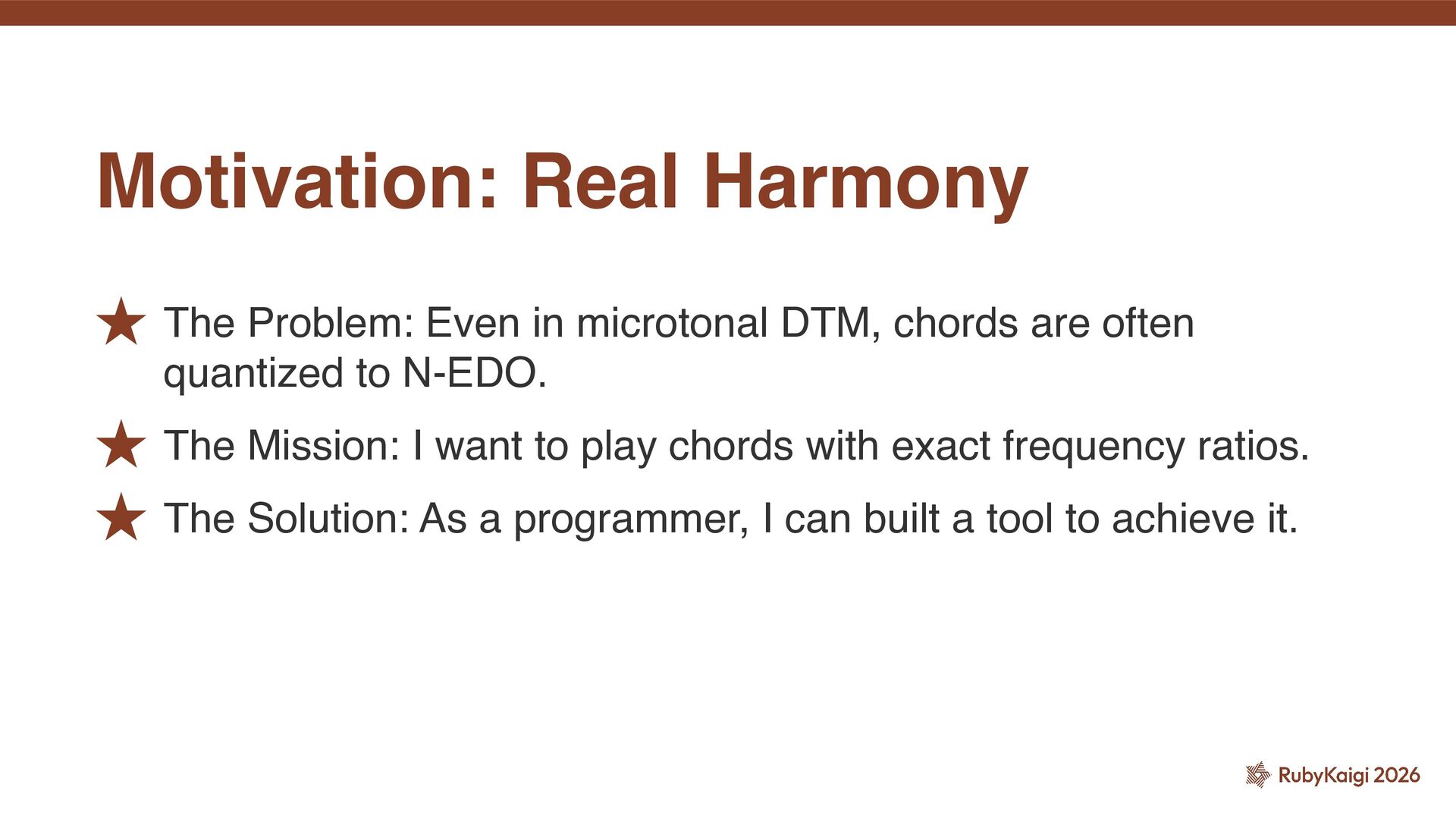 quantized to N-EDO. ˒ The Mission: I want to play chords with exact frequency ratios. ˒ The Solution: As a programmer, I can built a tool to achieve it. Motivation: Real Harmony
