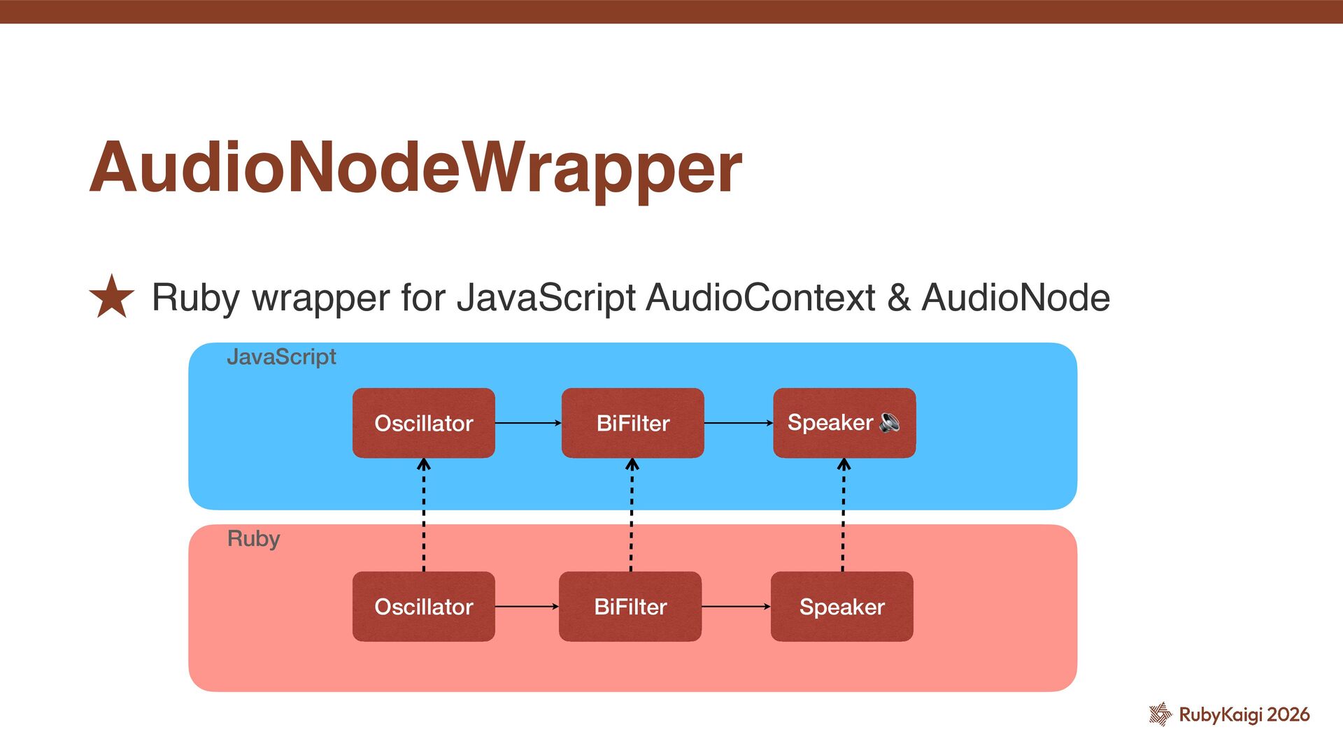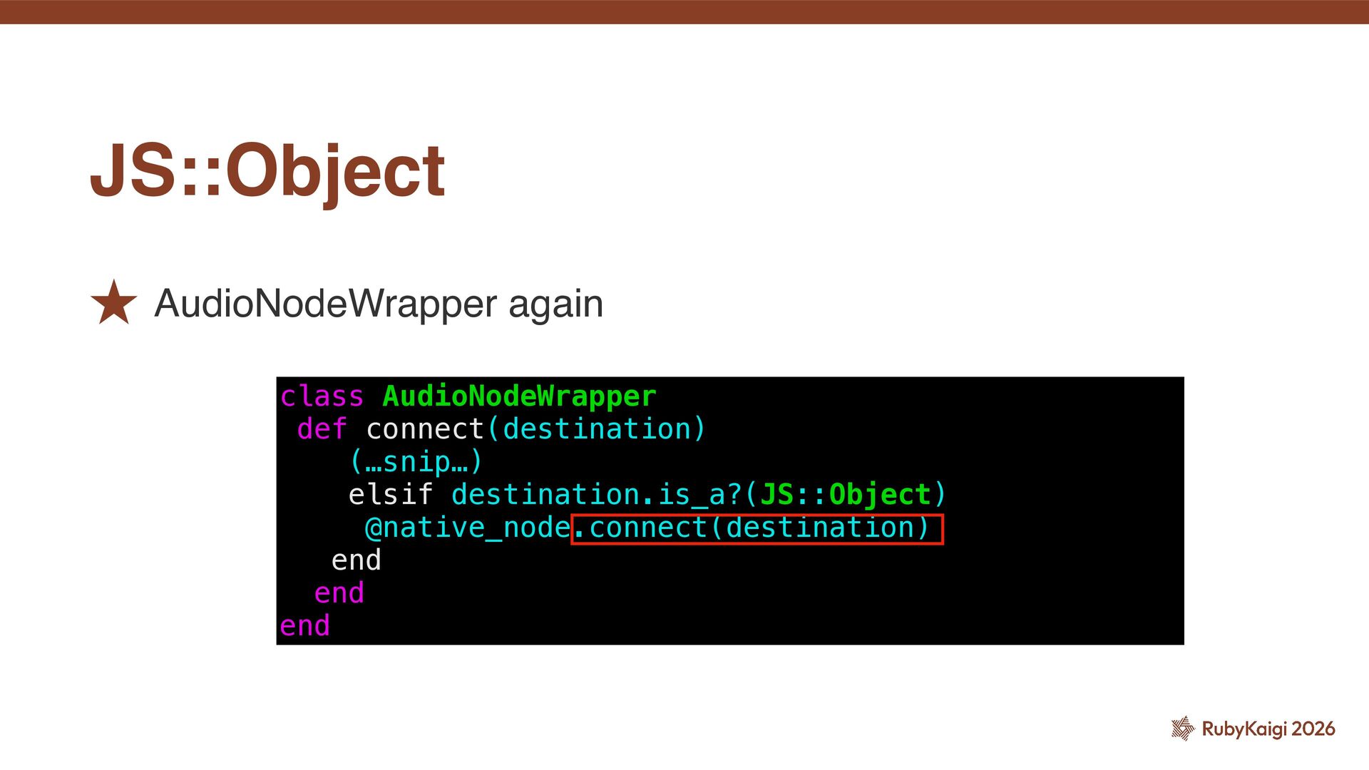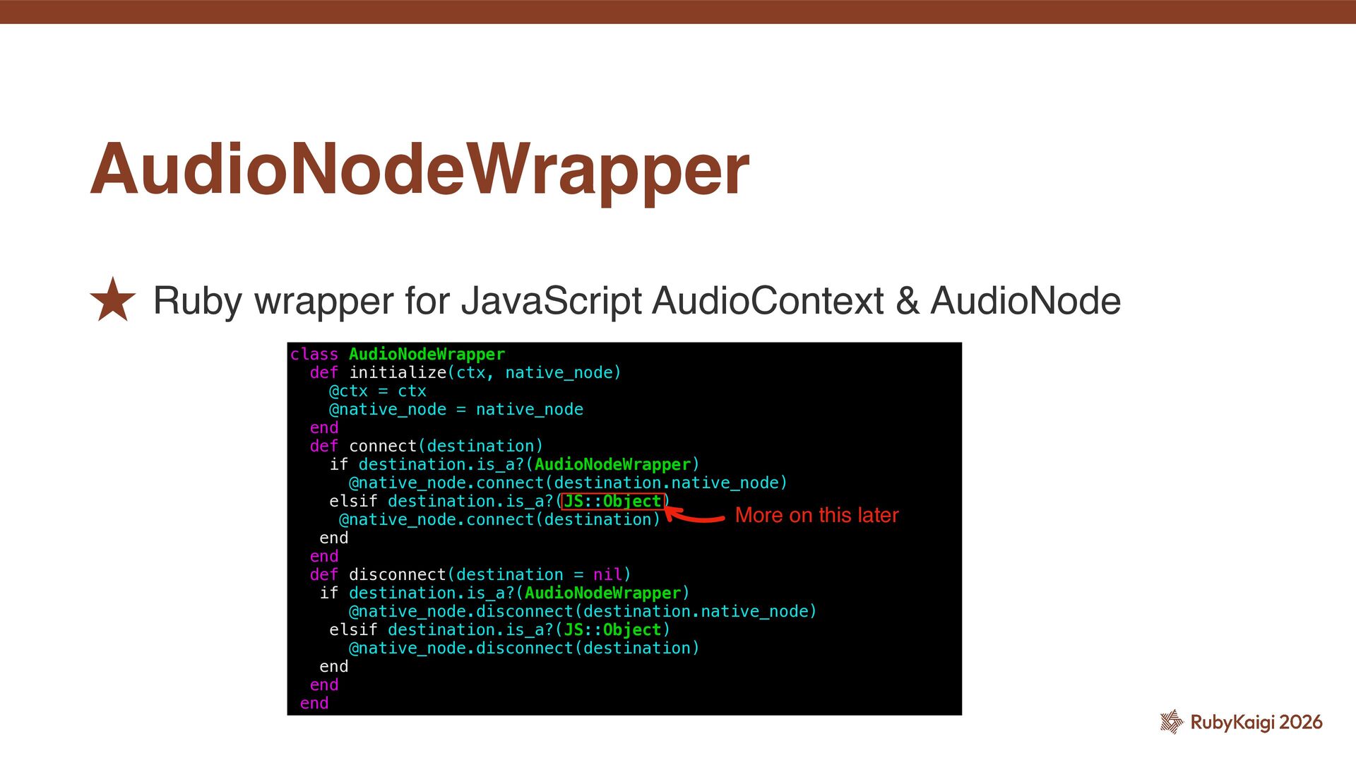 AudioNodeWrapper def initialize(ctx, native_node) @ctx = ctx @native_node = native_node end def connect(destination) if destination.is_a?(AudioNodeWrapper) @native_node.connect(destination.native_node) elsif destination.is_a?(JS::Object) @native_node.connect(destination) end end def disconnect(destination = nil) if destination.is_a?(AudioNodeWrapper) @native_node.disconnect(destination.native_node) elsif destination.is_a?(JS::Object) @native_node.disconnect(destination) end end end More on this later
