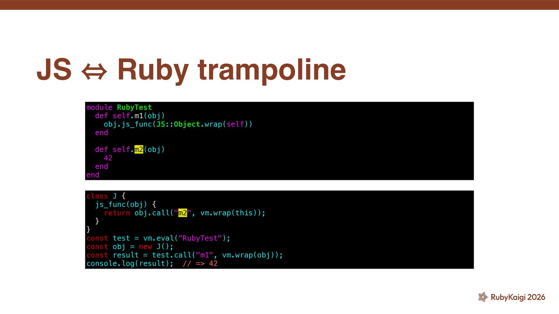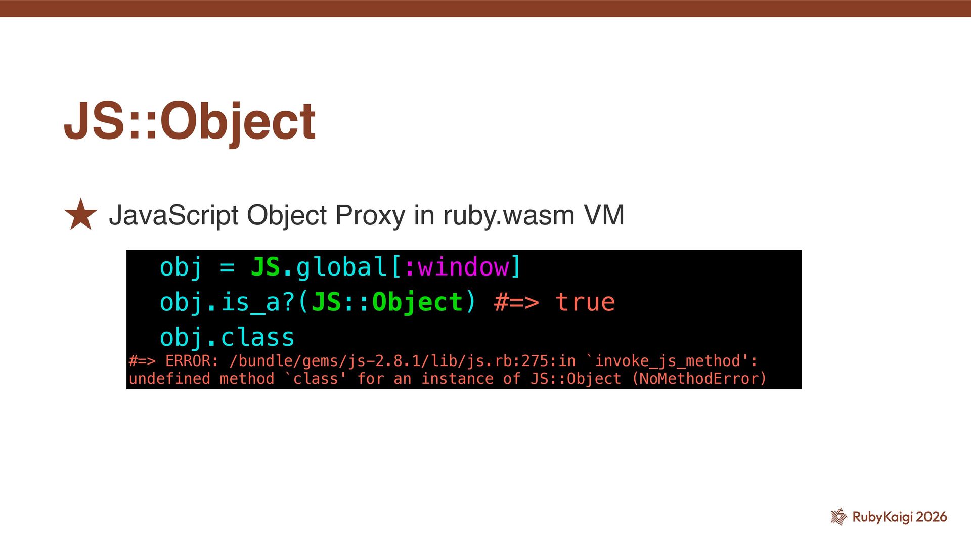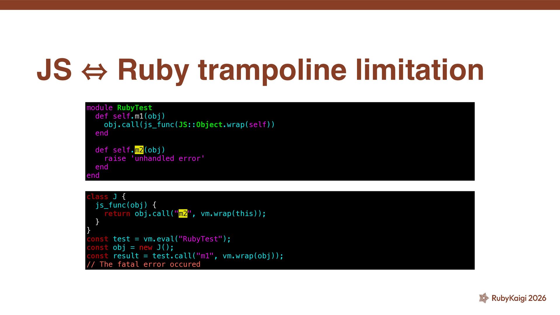 end def self.m2(obj) raise 'unhandled error' end end class J { js_func(obj) { return obj.call("m2", vm.wrap(this)); } } const test = vm.eval("RubyTest"); const obj = new J(); const result = test.call("m1", vm.wrap(obj)); // The fatal error occured