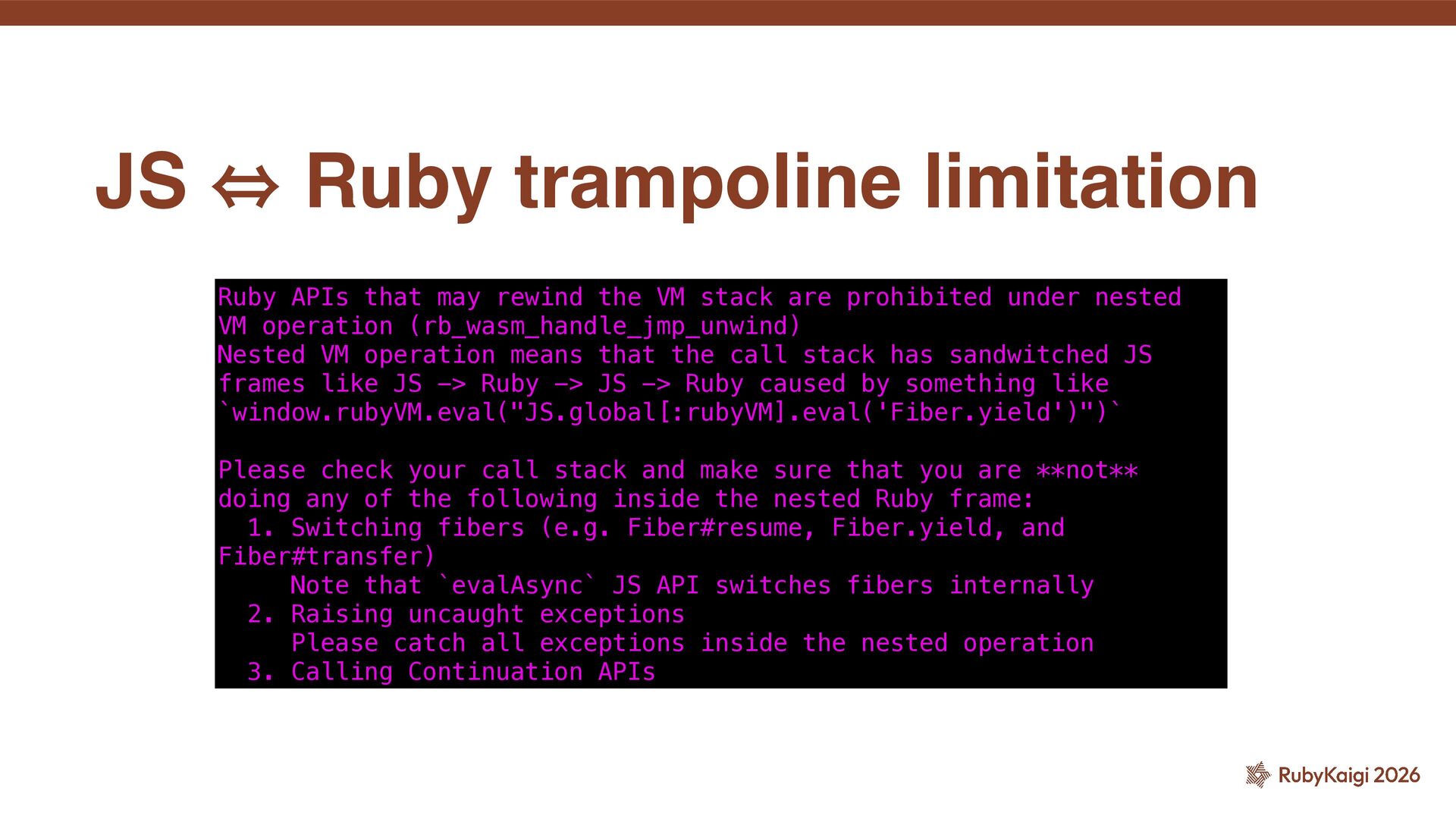 the VM stack are prohibited under nested VM operation (rb_wasm_handle_jmp_unwind) Nested VM operation means that the call stack has sandwitched JS frames like JS -> Ruby -> JS -> Ruby caused by something like `window.rubyVM.eval("JS.global[:rubyVM].eval('Fiber.yield')")` Please check your call stack and make sure that you are **not** doing any of the following inside the nested Ruby frame: 1. Switching fibers (e.g. Fiber#resume, Fiber.yield, and Fiber#transfer) Note that `evalAsync` JS API switches fibers internally 2. Raising uncaught exceptions Please catch all exceptions inside the nested operation 3. Calling Continuation APIs