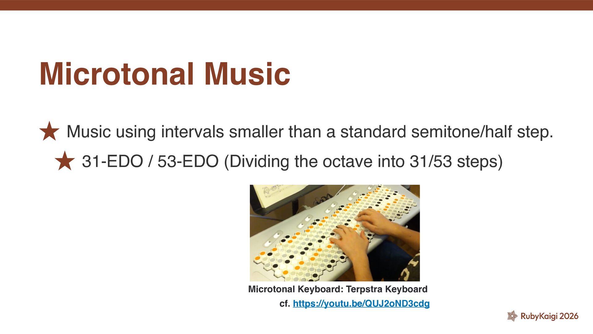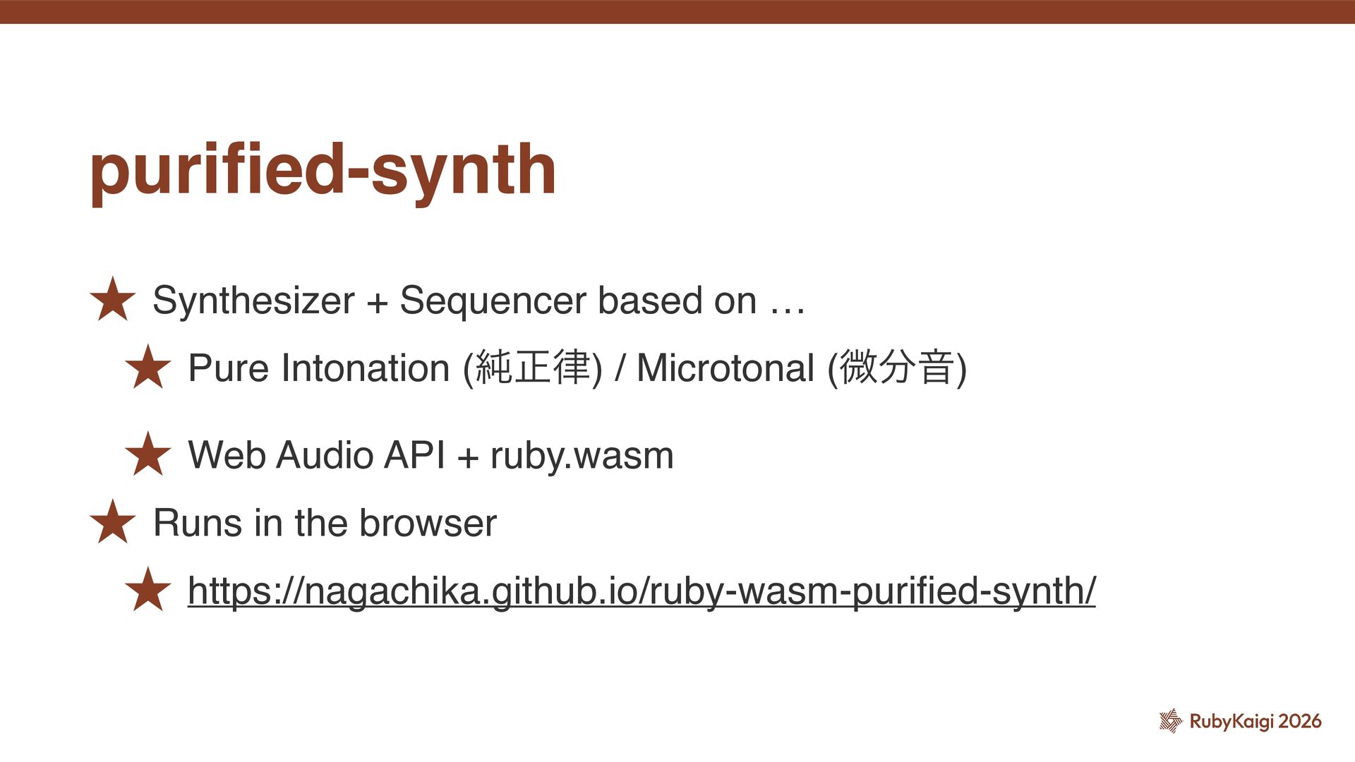 Explore pure intonation, microtonal music theory, and ruby.wasm interoperability to create a modular synthesizer and sequencer running in the browser using Web Audio API and Ruby.