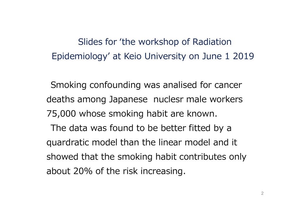 on June 1 2019 Smoking confounding was analised for cancer deaths among Japanese nuclesr male workers 2 deaths among Japanese nuclesr male workers 75,000 whose smoking habit are known. The data was found to be better fitted by a quardratic model than the linear model and it showed that the smoking habit contributes only about 20% of the risk increasing.