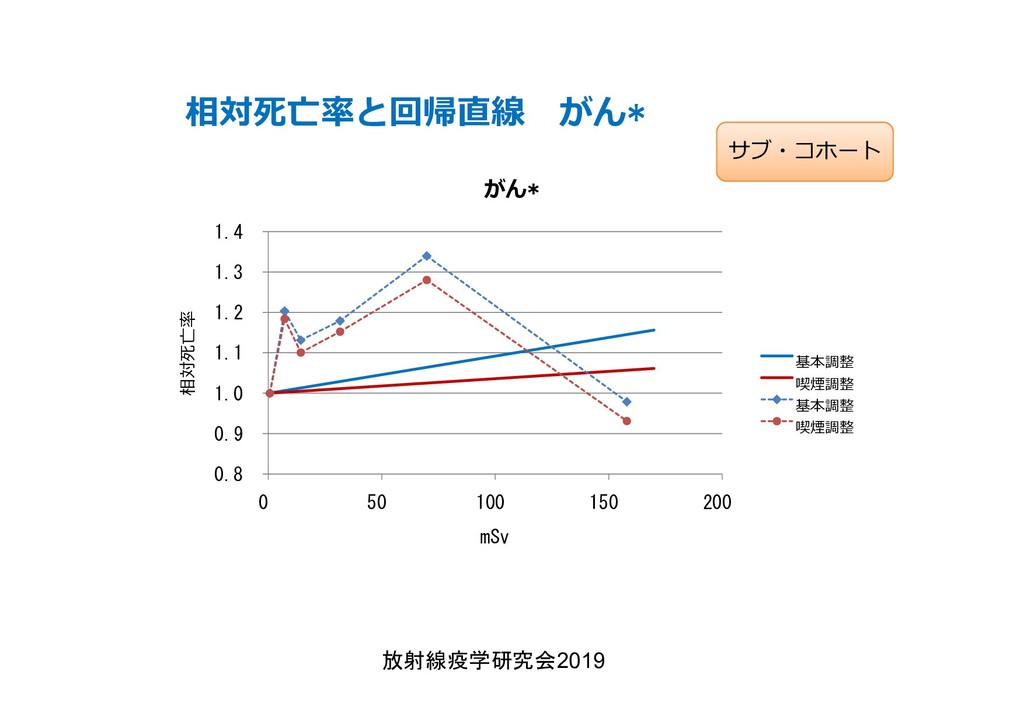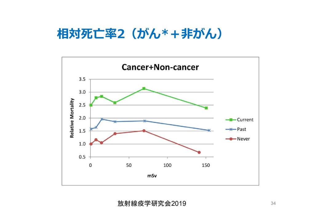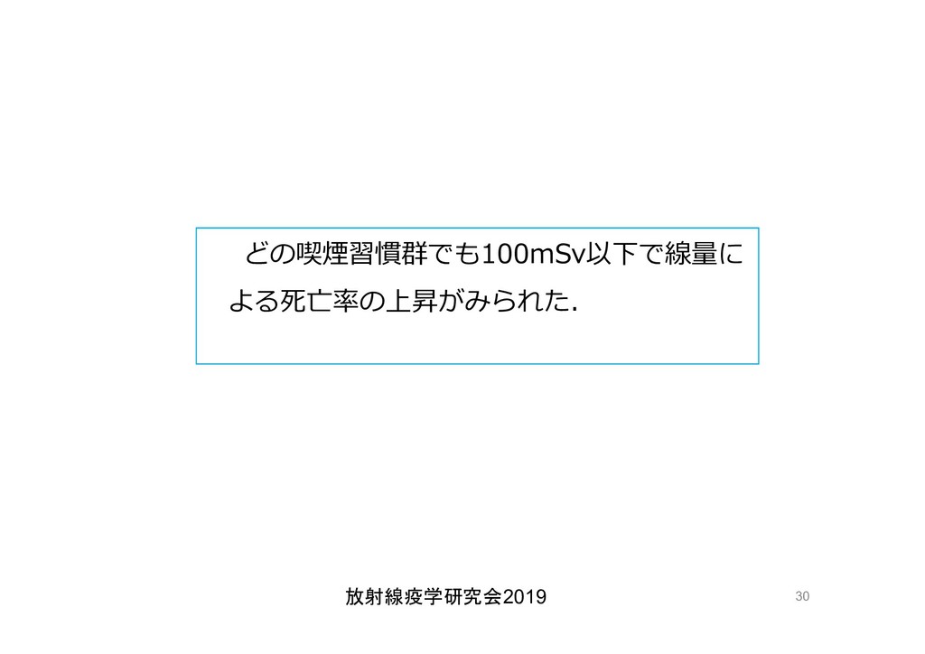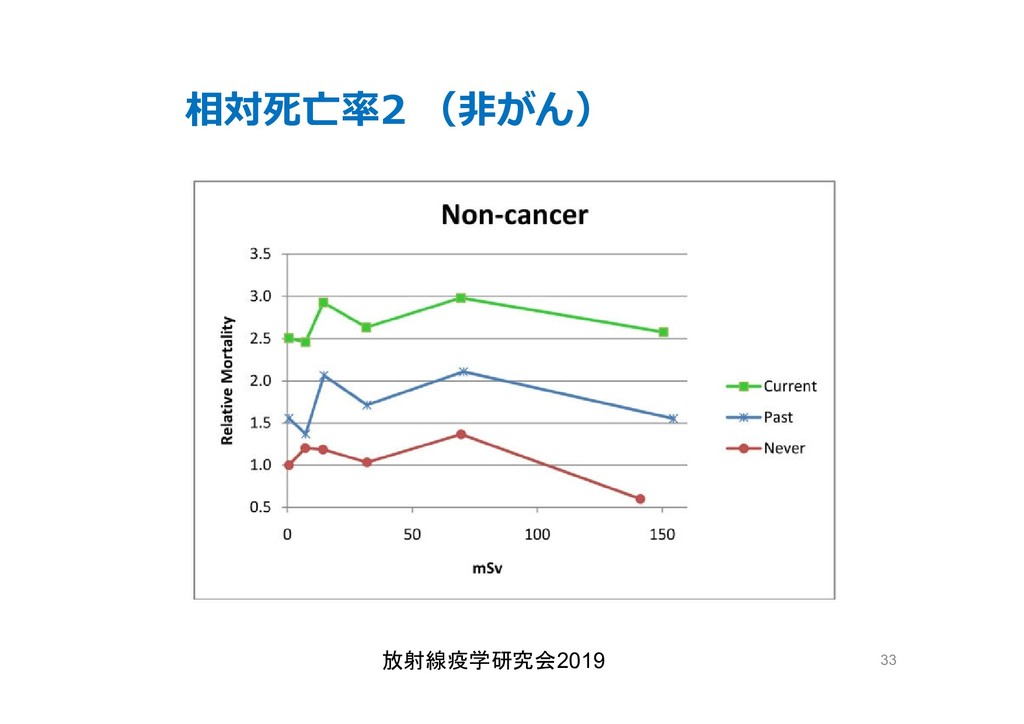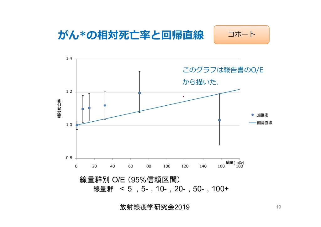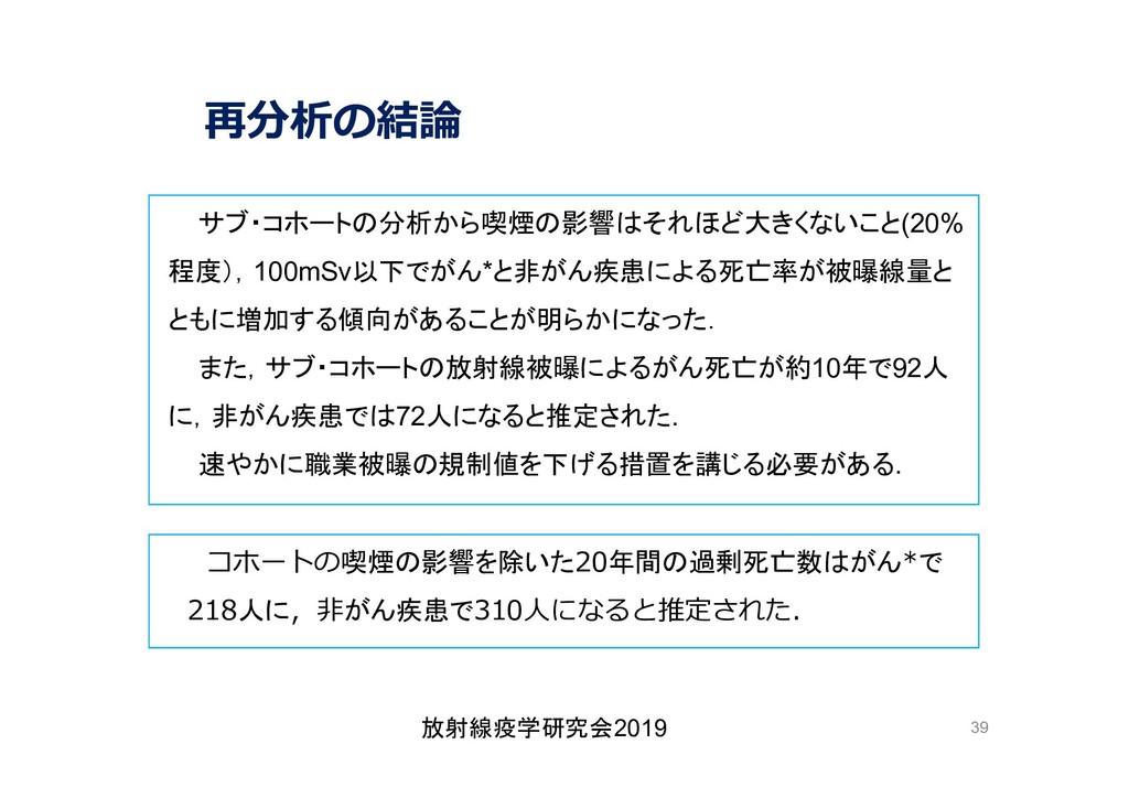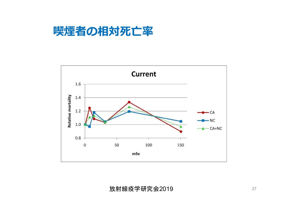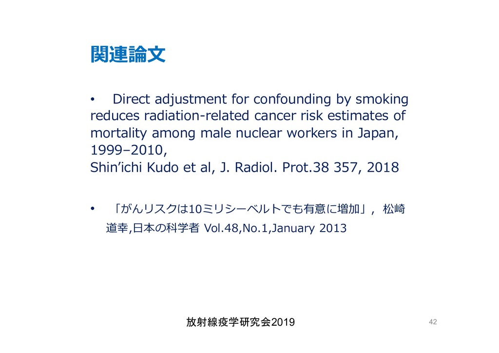 cancer risk estimates of mortality among male nuclear workers in Japan, 1999–2010, Shin’ichi Kudo et al, J. Radiol. Prot.38 357, 2018 Shin’ichi Kudo et al, J. Radiol. Prot.38 357, 2018 • 「がんリスクは10ミリシーベルトでも有意に増加」, 松崎 道幸,日本の科学者 Vol.48,No.1,January 2013 放射線疫学研究会2019 42