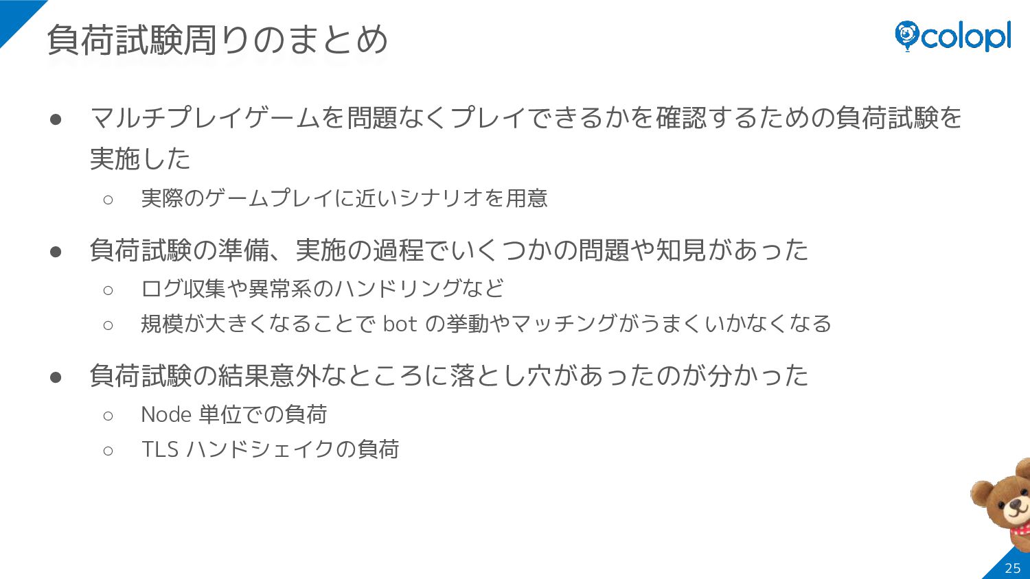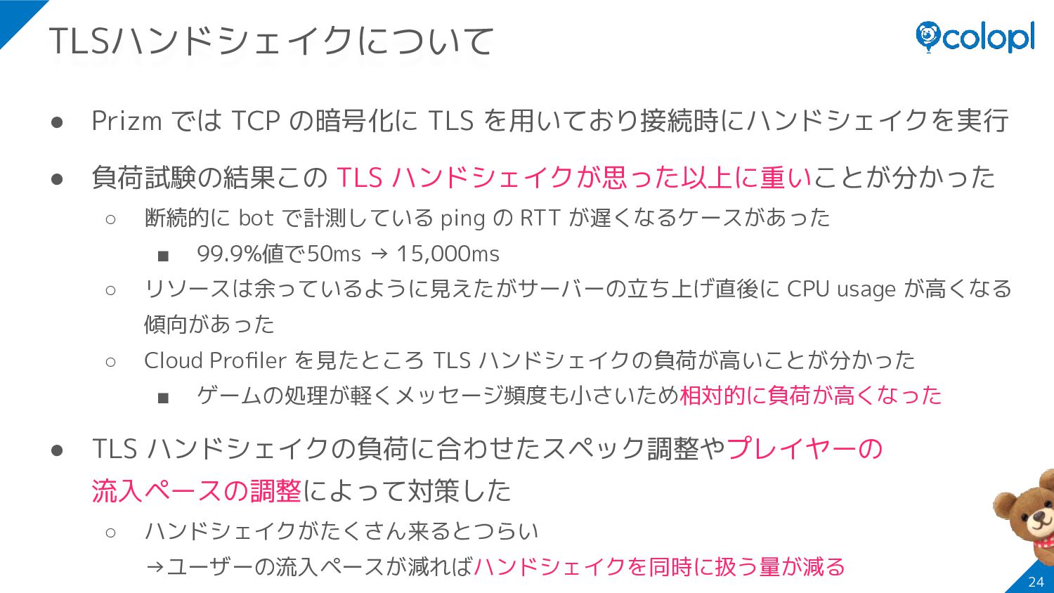 ハンドシェイクが思った以上に重いことが分かった ◦ 断続的に bot で計測している ping の RTT が遅くなるケースがあった ▪ 99.9%値で50ms → 15,000ms ◦ リソースは余っているように見えたがサーバーの立ち上げ直後に CPU usage が高くなる 傾向があった ◦ Cloud Profiler を見たところ TLS ハンドシェイクの負荷が高いことが分かった ▪ ゲームの処理が軽くメッセージ頻度も小さいため相対的に負荷が高くなった • TLS ハンドシェイクの負荷に合わせたスペック調整やプレイヤーの 流入ペースの調整によって対策した ◦ ハンドシェイクがたくさん来るとつらい →ユーザーの流入ペースが減ればハンドシェイクを同時に扱う量が減る 24 TLSハンドシェイクについて