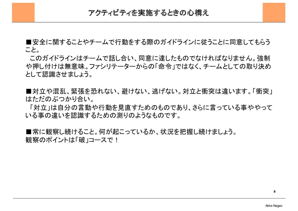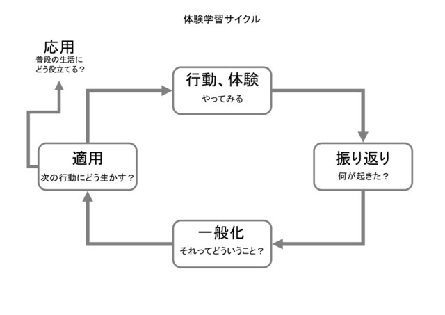 n. 反射(光,熱); 反響(音); 反映, 映像; 生き写し; 反省, 熟考 ((on)); (熟慮の 結果の)意見, 感想; 非難, 恥辱 ((on)).三省堂「EXCEED 英和辞典」より •気づきを「引き出す」 →気づかない人には気づかせる →引き出しても出ない人には引っ張り出す →「気づかせる」「引っ張り出す」方法は詰問・尋問ではなく「質問」で。 •振り返りは体験を言語化する作業 →何が起きてどうなったかを目に見える形にする →記憶を言語化する →言葉を探して、自分の経験や人生の中に固定化する •ファシリテーターの質問力が「振り返り→一般化→適用→行為、体験」を左右する