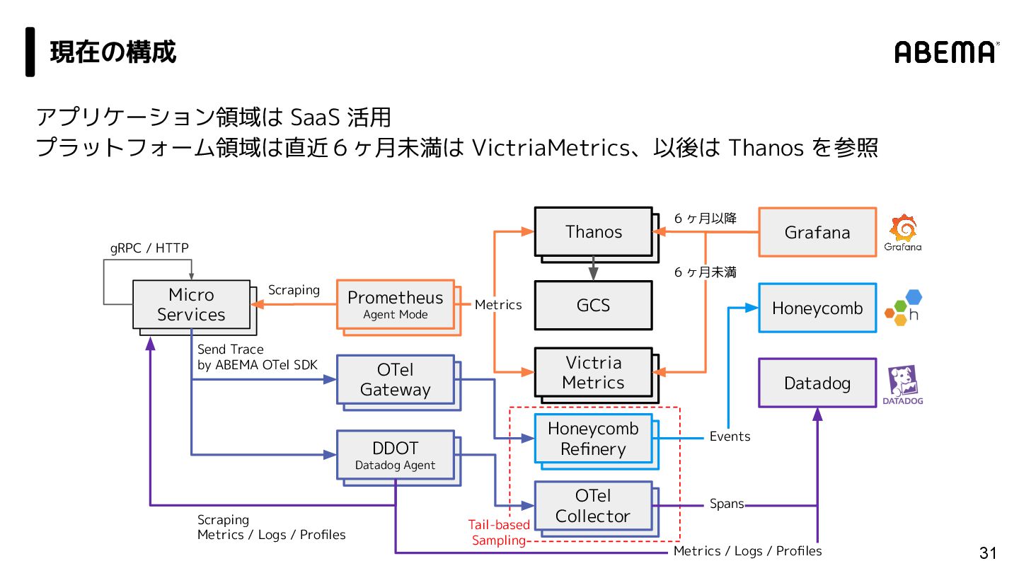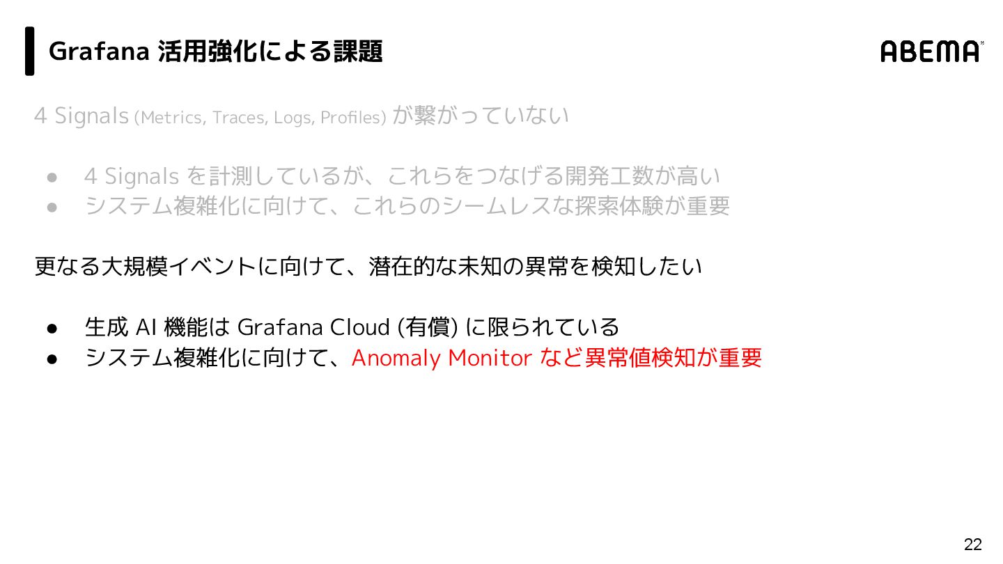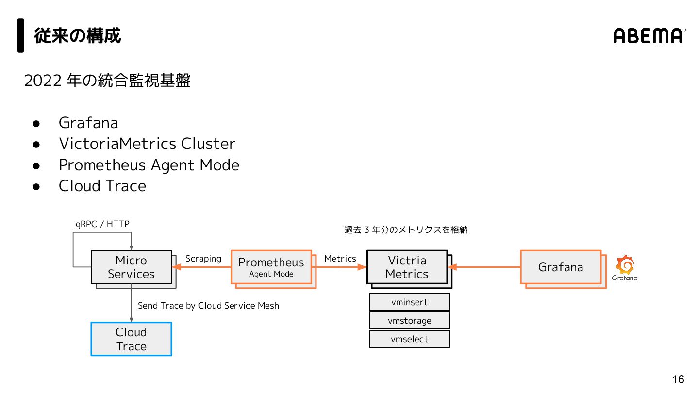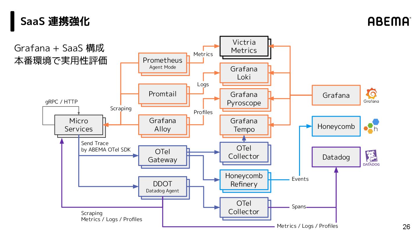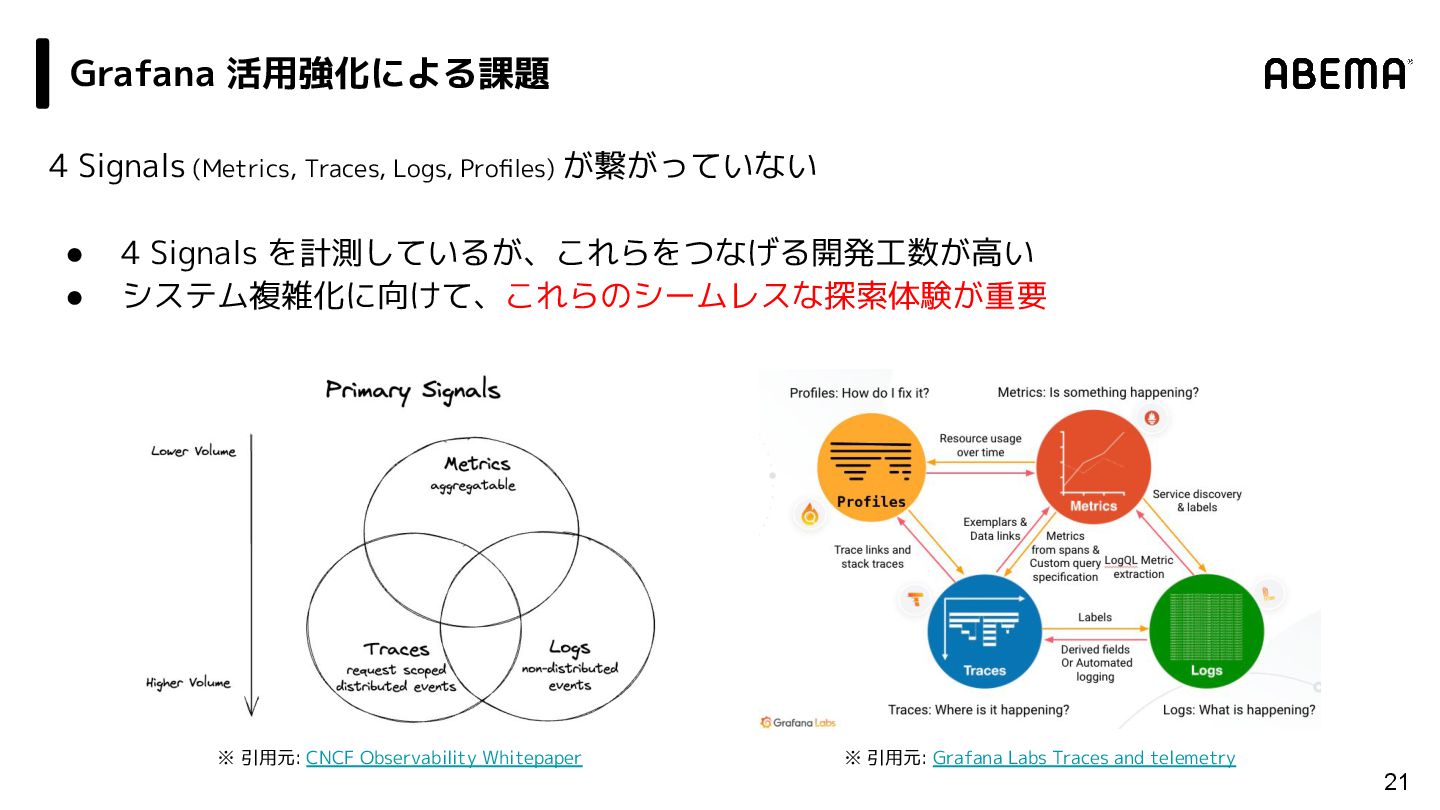 / Grafana Alloy 20 vm insert Victria Metrics vm insert Grafana Pyroscope vm insert Grafana Loki Grafana vm insert Grafana Tempo vm insert Promtail vm insert OTel Gateway vm insert Prometheus Agent Mode vm insert Grafana Alloy vm insert OTel Collector vm insert Micro Services Scraping Profiles Logs Metrics gRPC / HTTP Grafana 活用強化 Send Trace by ABEMA OTel SDK