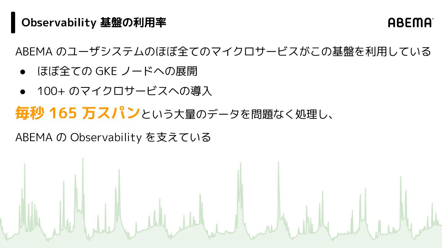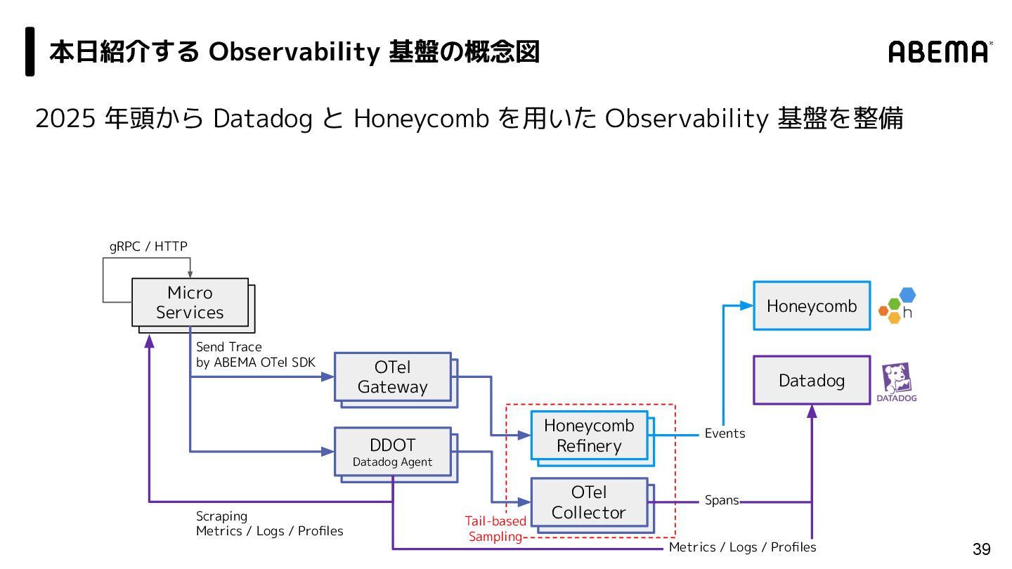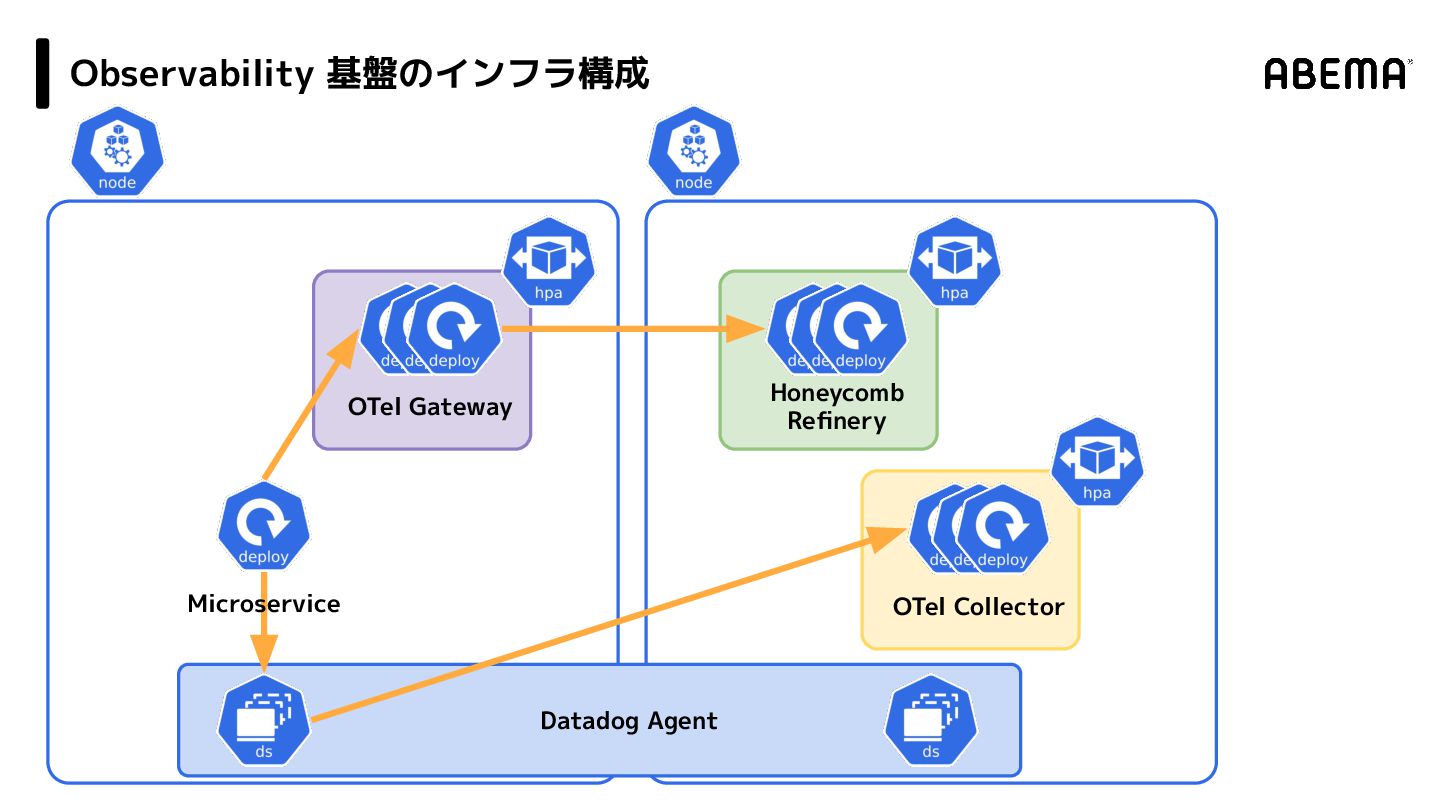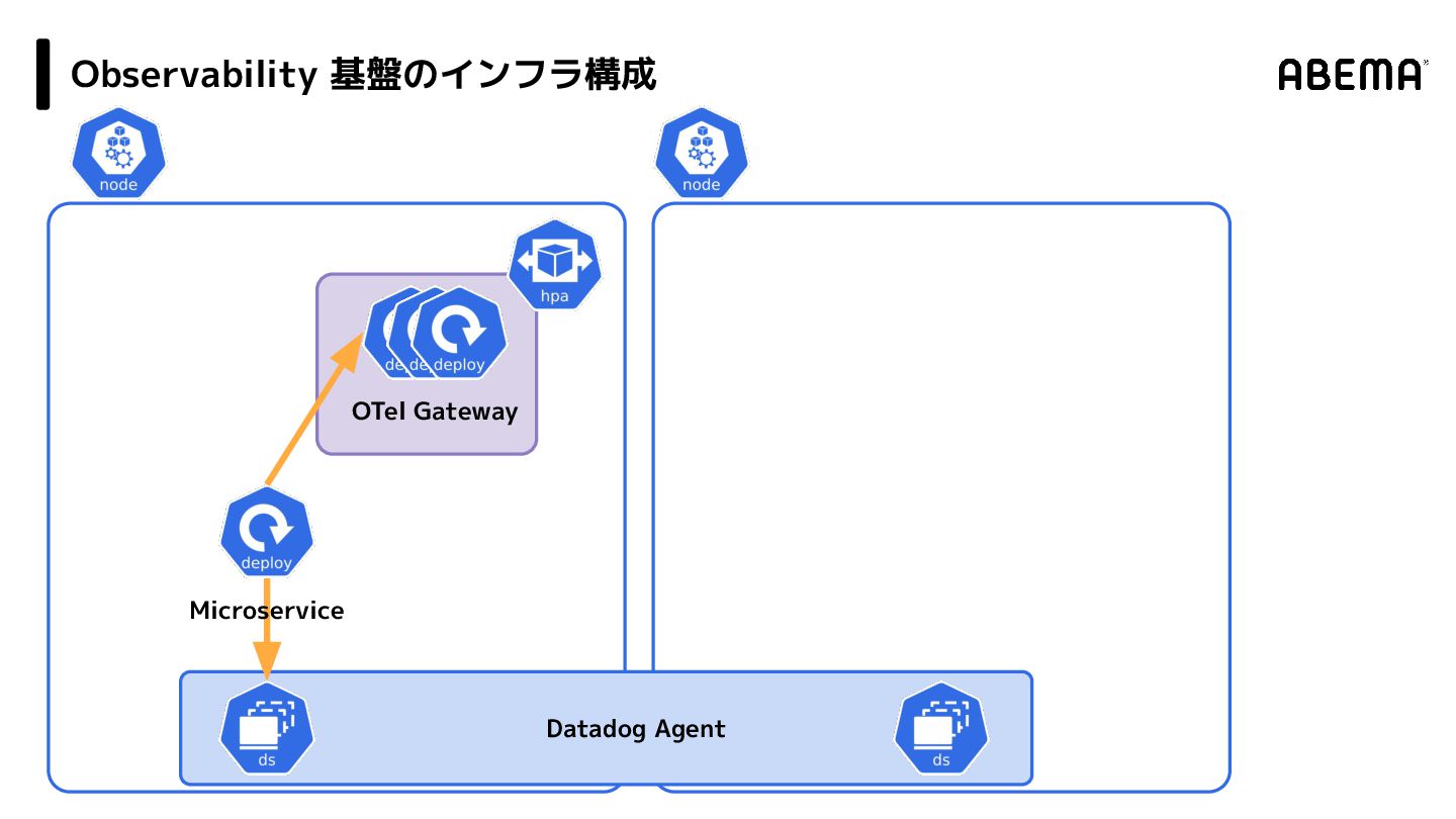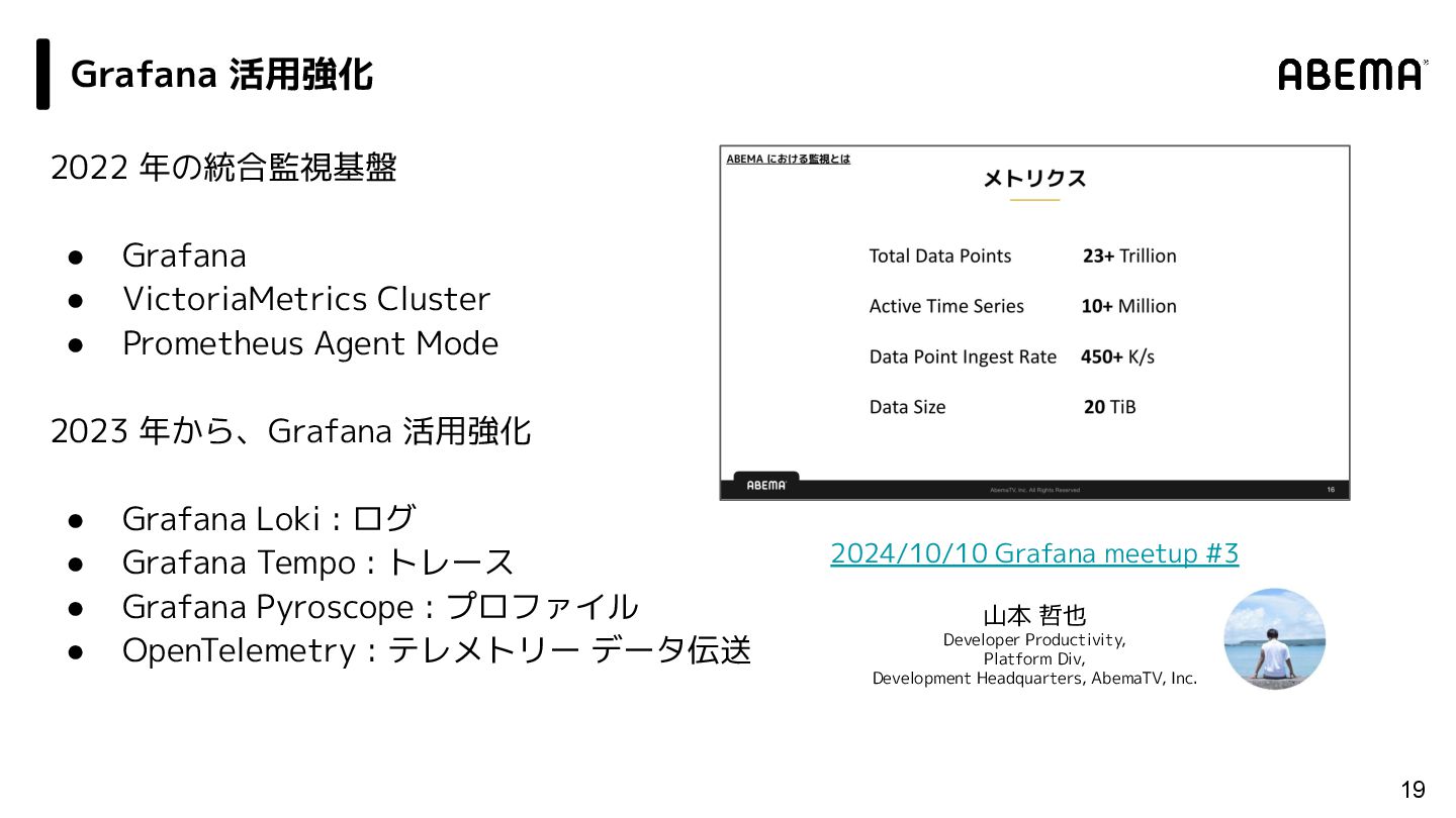 / Grafana Alloy 20 vm insert Victria Metrics vm insert Grafana Pyroscope vm insert Grafana Loki Grafana vm insert Grafana Tempo vm insert Promtail vm insert OTel Gateway vm insert Prometheus Agent Mode vm insert Grafana Alloy vm insert OTel Collector vm insert Micro Services Scraping Profiles Logs Metrics gRPC / HTTP Grafana 活用強化 Send Trace by ABEMA OTel SDK