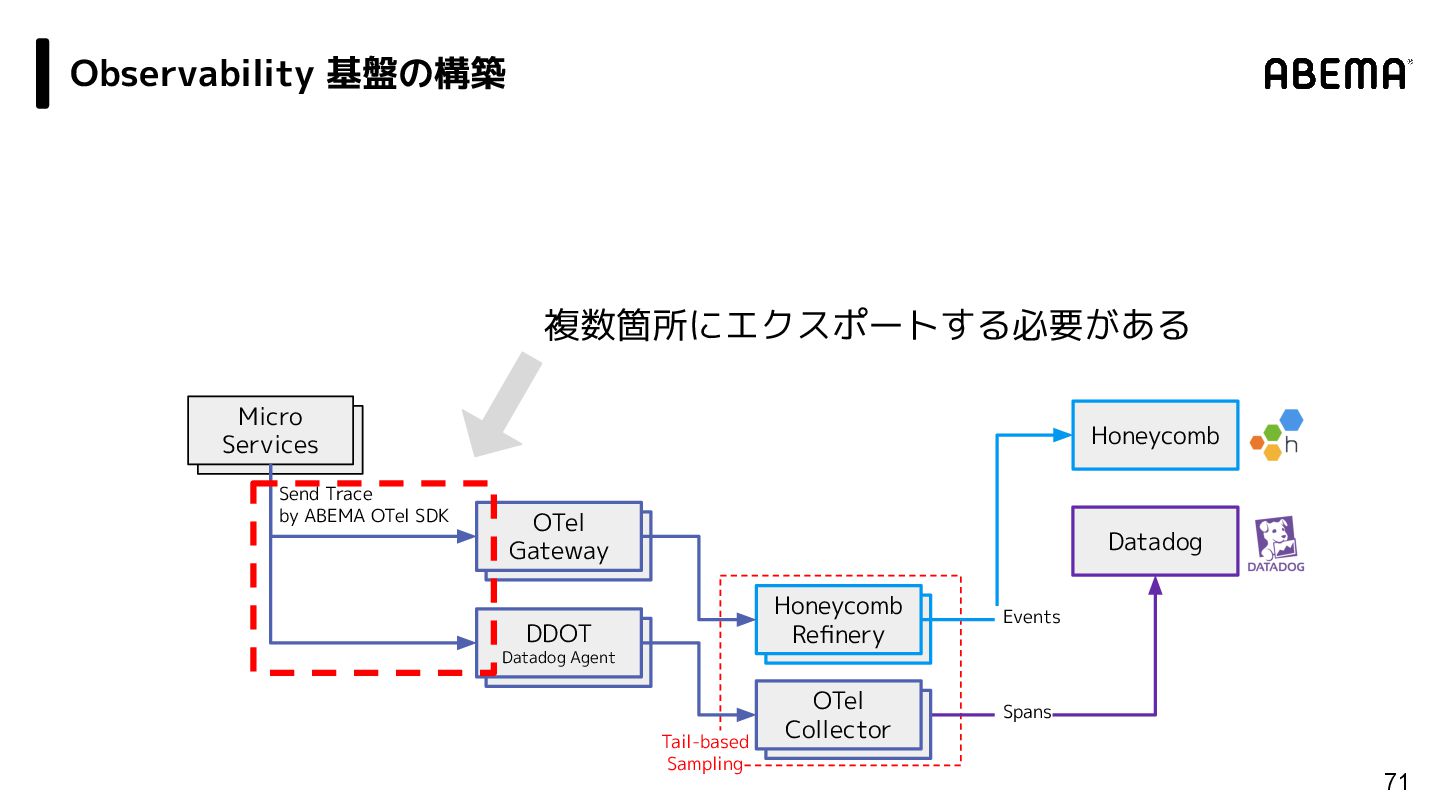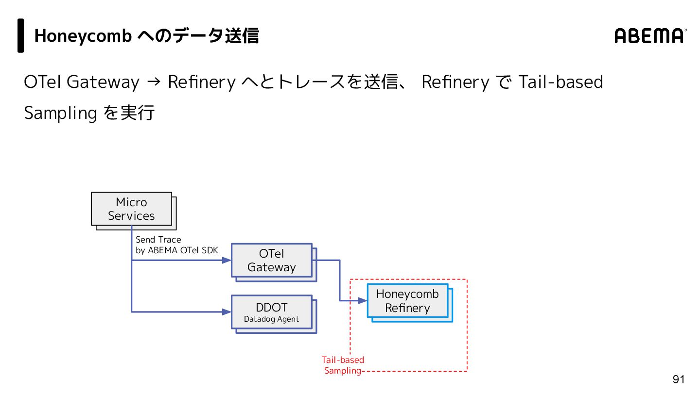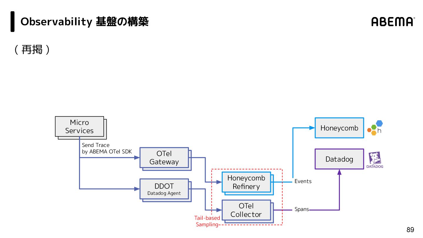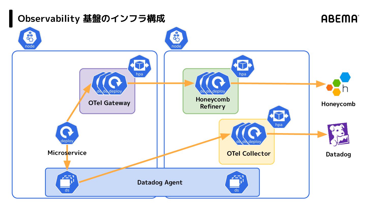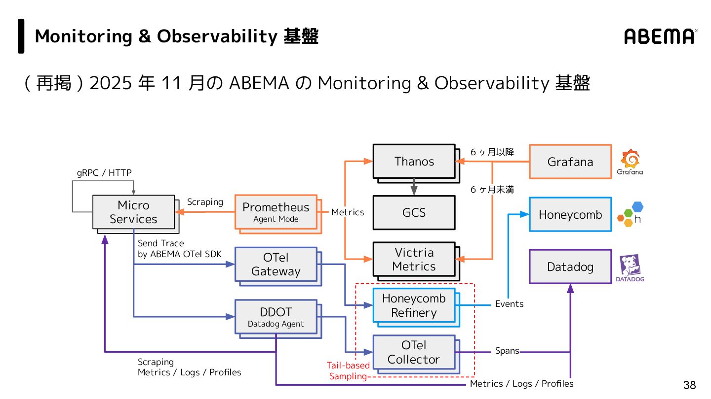 / Grafana Alloy 20 vm insert Victria Metrics vm insert Grafana Pyroscope vm insert Grafana Loki Grafana vm insert Grafana Tempo vm insert Promtail vm insert OTel Gateway vm insert Prometheus Agent Mode vm insert Grafana Alloy vm insert OTel Collector vm insert Micro Services Scraping Profiles Logs Metrics gRPC / HTTP Grafana 活用強化 Send Trace by ABEMA OTel SDK