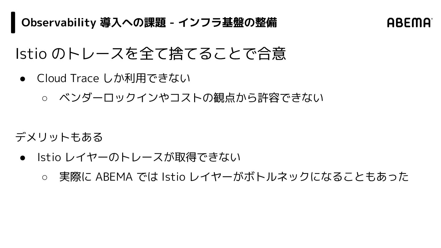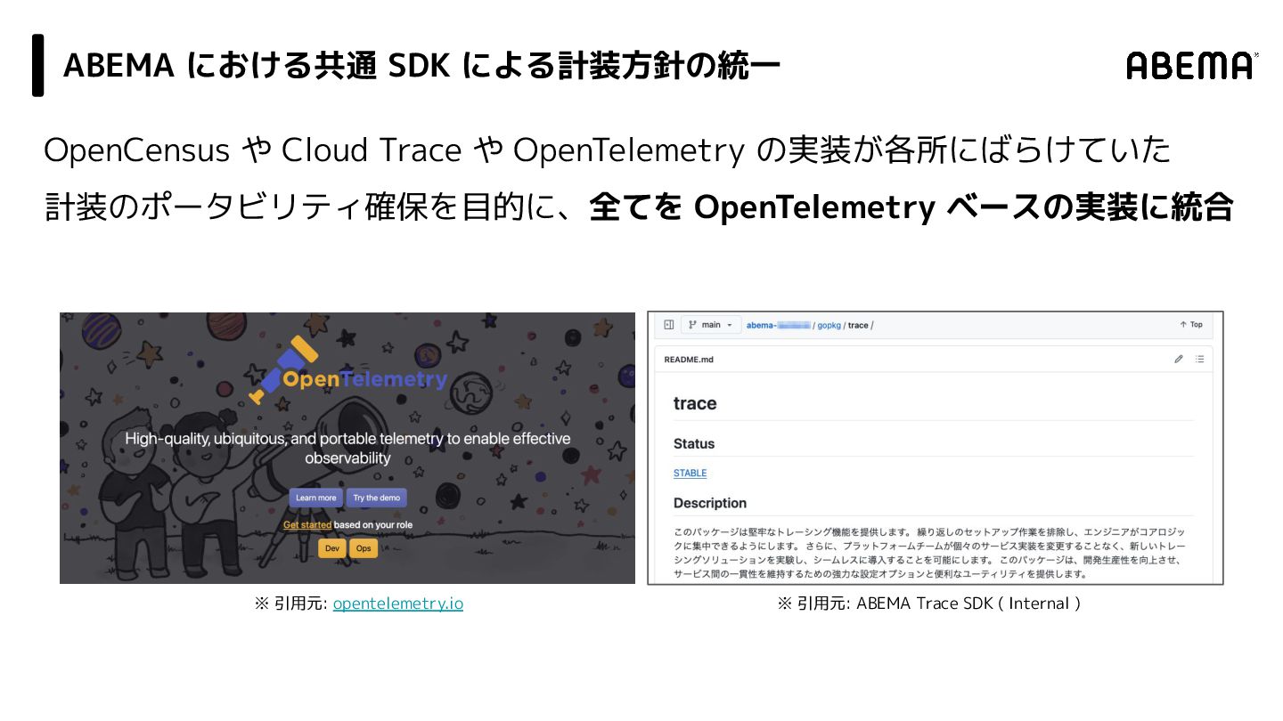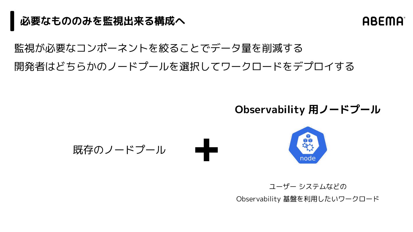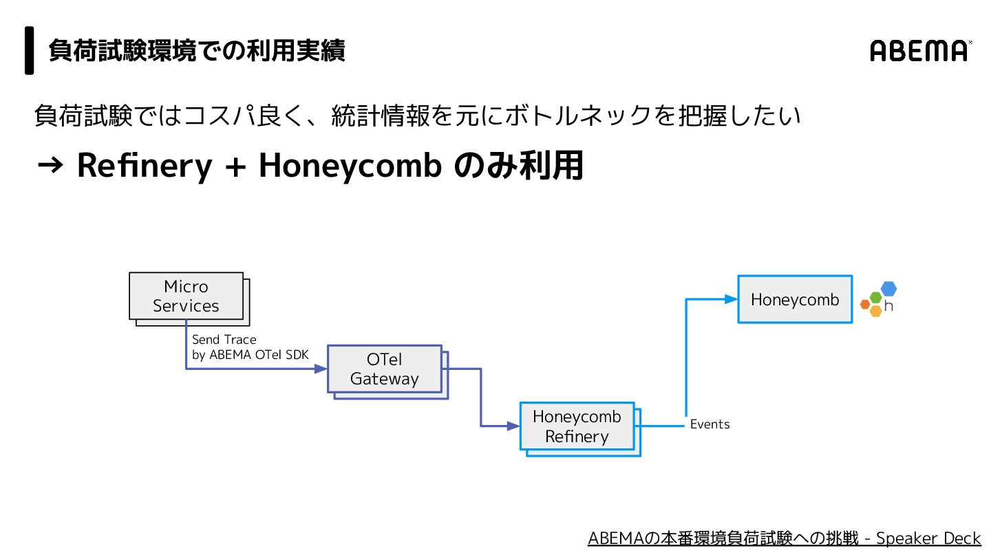 / Grafana Alloy 20 vm insert Victria Metrics vm insert Grafana Pyroscope vm insert Grafana Loki Grafana vm insert Grafana Tempo vm insert Promtail vm insert OTel Gateway vm insert Prometheus Agent Mode vm insert Grafana Alloy vm insert OTel Collector vm insert Micro Services Scraping Profiles Logs Metrics gRPC / HTTP Grafana 活用強化 Send Trace by ABEMA OTel SDK