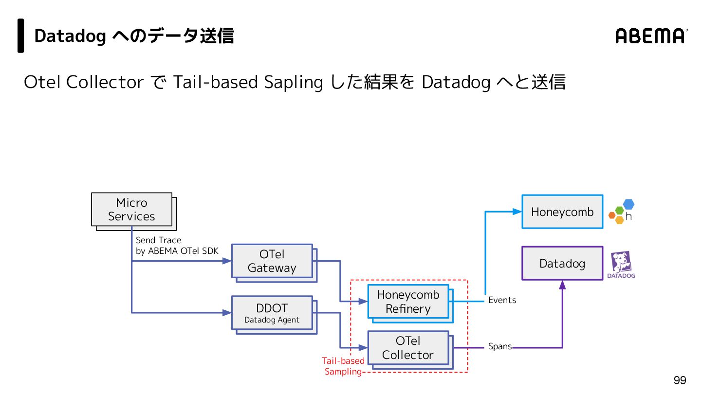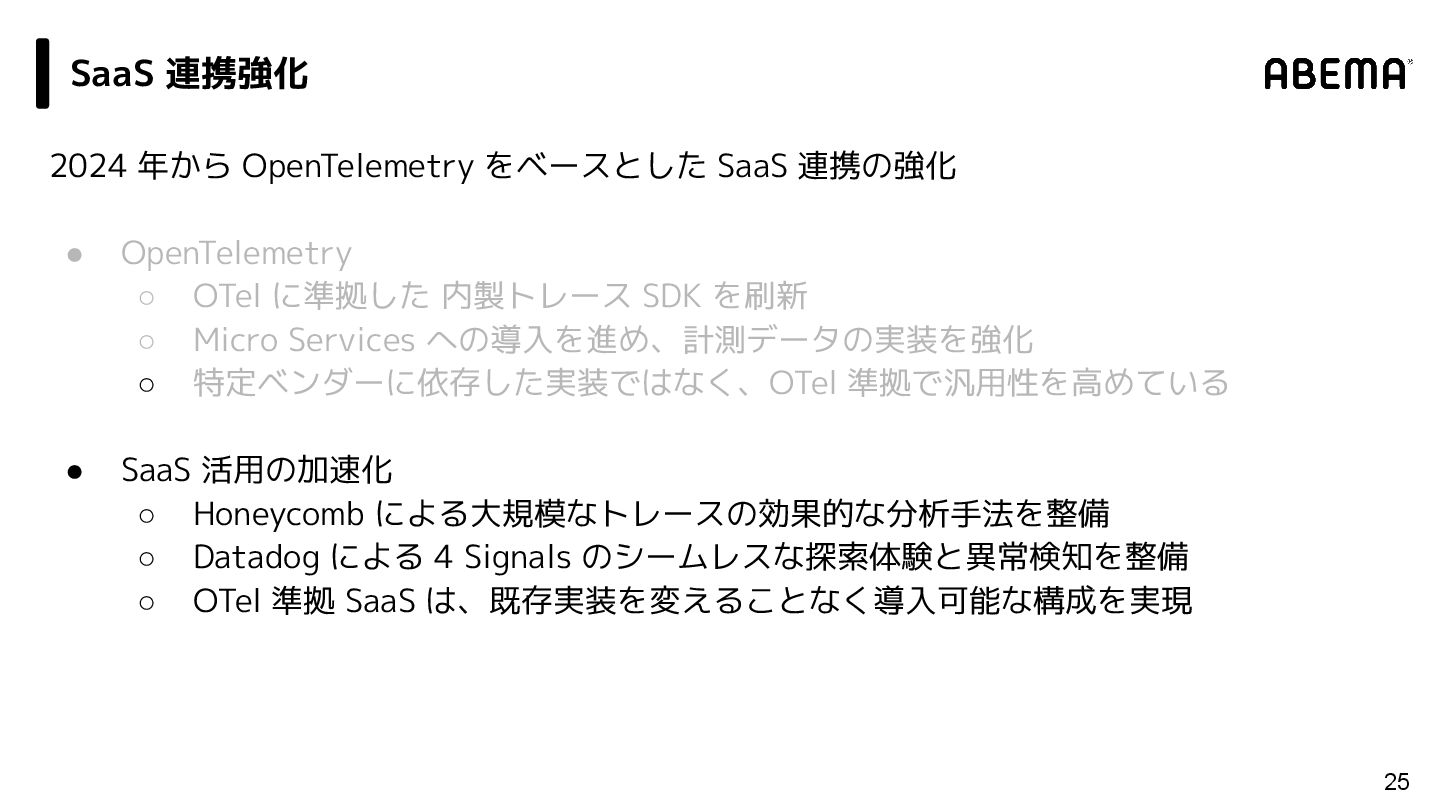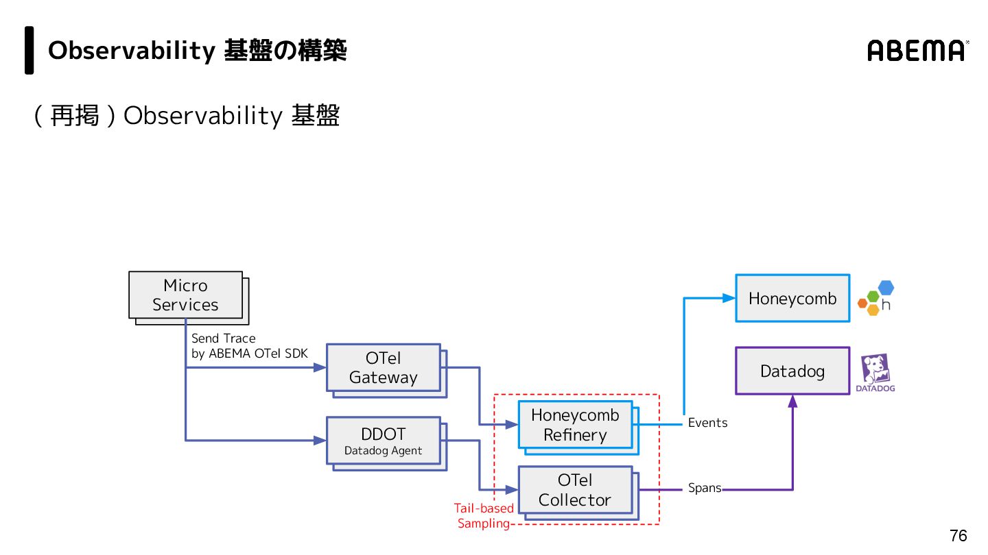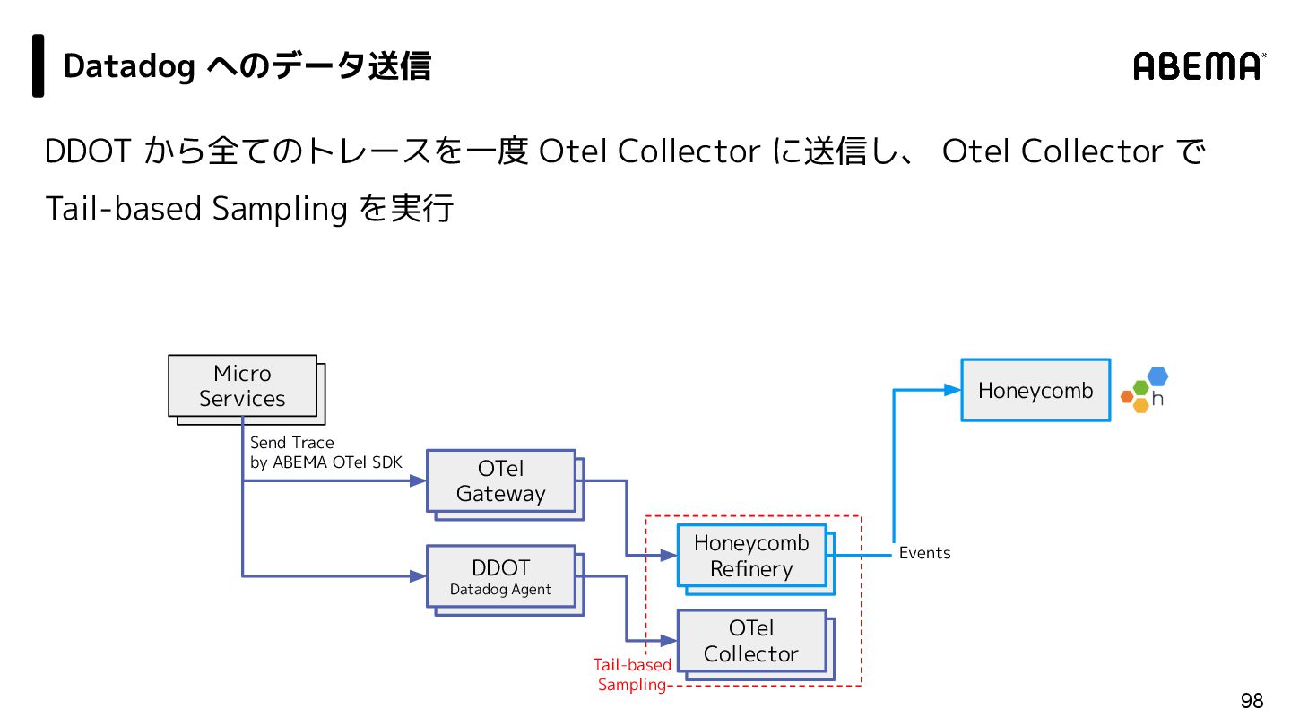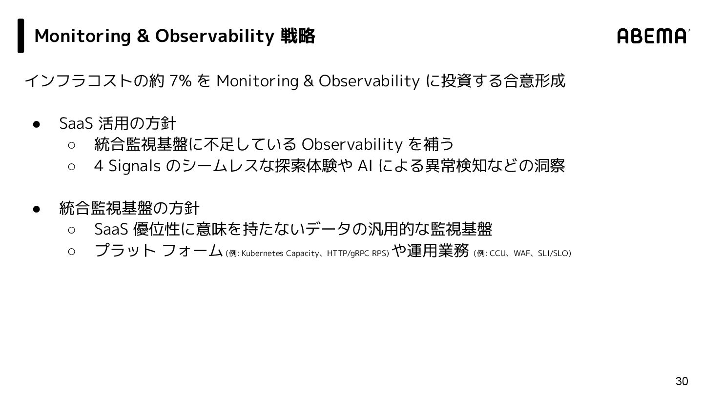 / Grafana Alloy 20 vm insert Victria Metrics vm insert Grafana Pyroscope vm insert Grafana Loki Grafana vm insert Grafana Tempo vm insert Promtail vm insert OTel Gateway vm insert Prometheus Agent Mode vm insert Grafana Alloy vm insert OTel Collector vm insert Micro Services Scraping Profiles Logs Metrics gRPC / HTTP Grafana 活用強化 Send Trace by ABEMA OTel SDK