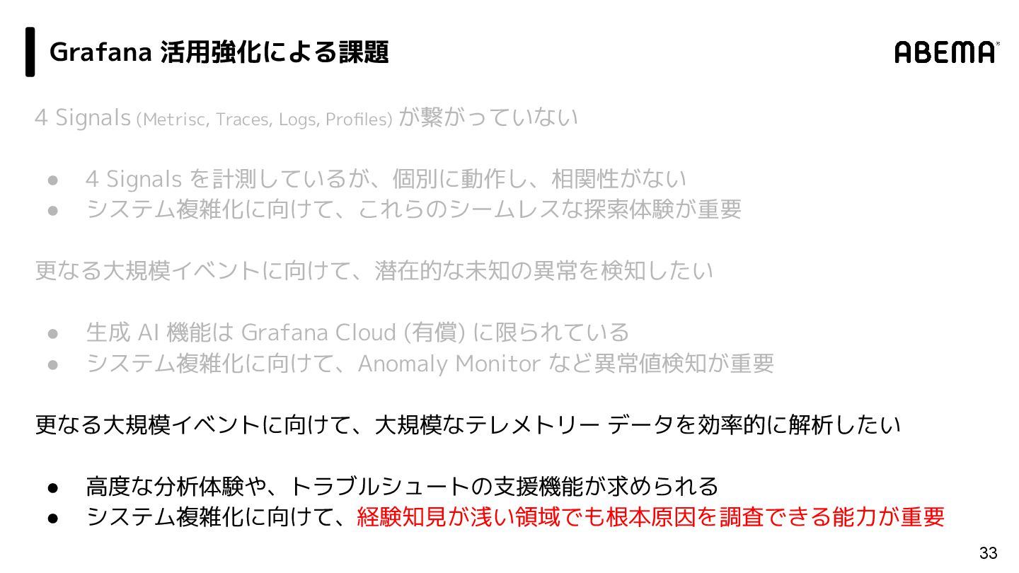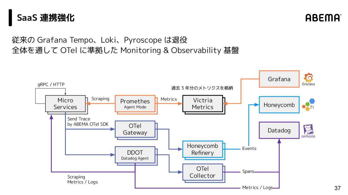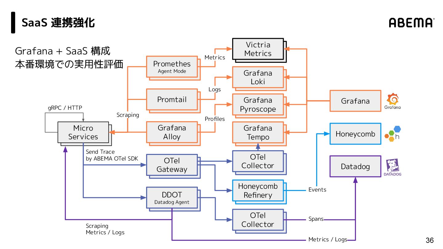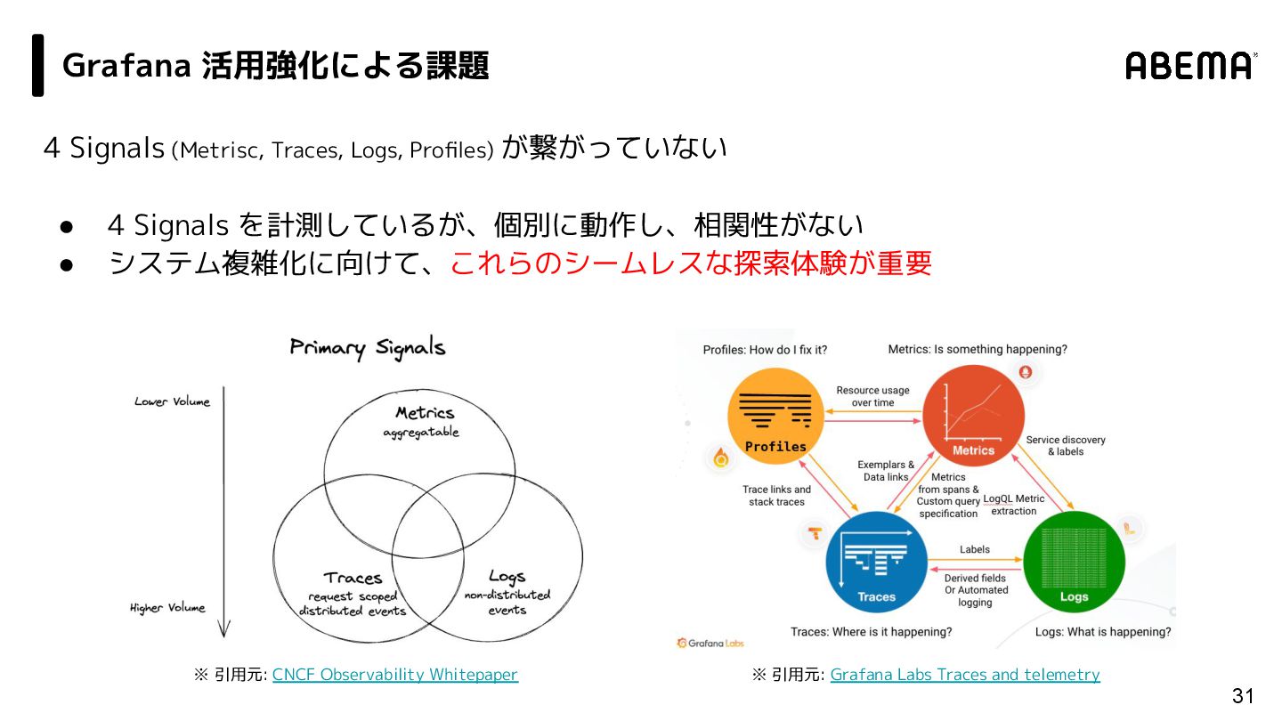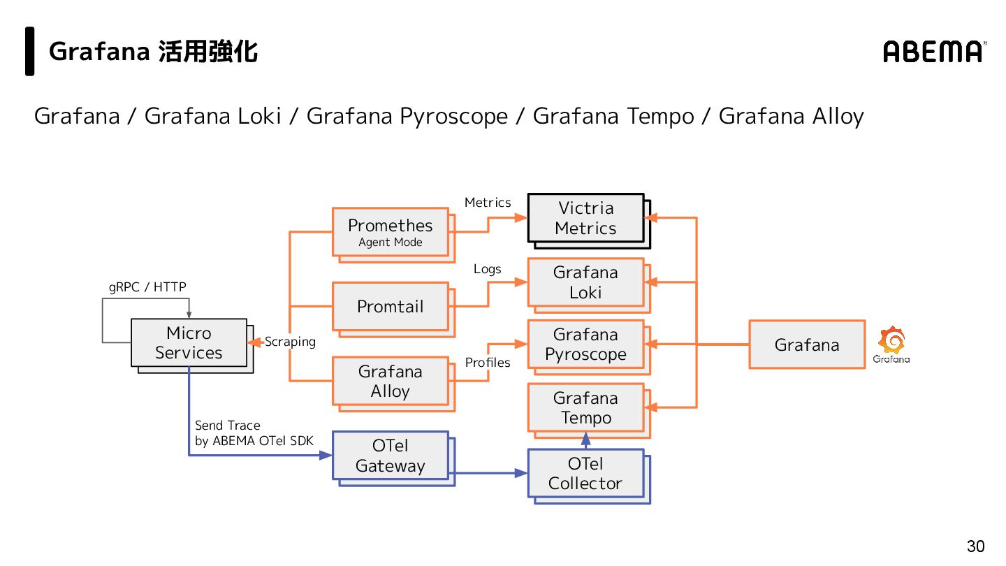 / Grafana Alloy 30 vm insert Victria Metrics vm insert Grafana Pyroscope vm insert Grafana Loki Grafana vm insert Grafana Tempo vm insert Promtail vm insert OTel Gateway vm insert Promethes Agent Mode vm insert Grafana Alloy vm insert OTel Collector vm insert Micro Services Scraping Profiles Logs Metrics gRPC / HTTP Grafana 活用強化 Send Trace by ABEMA OTel SDK