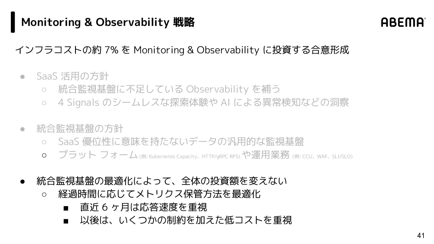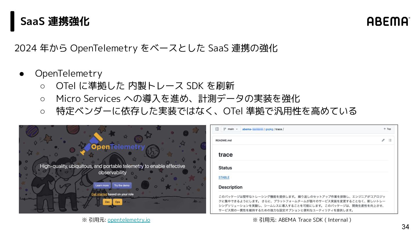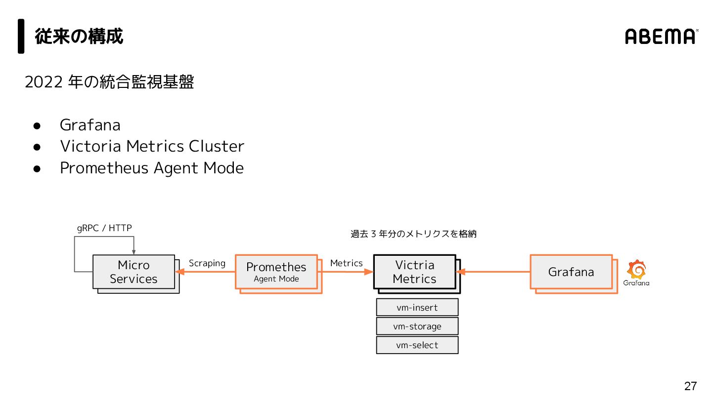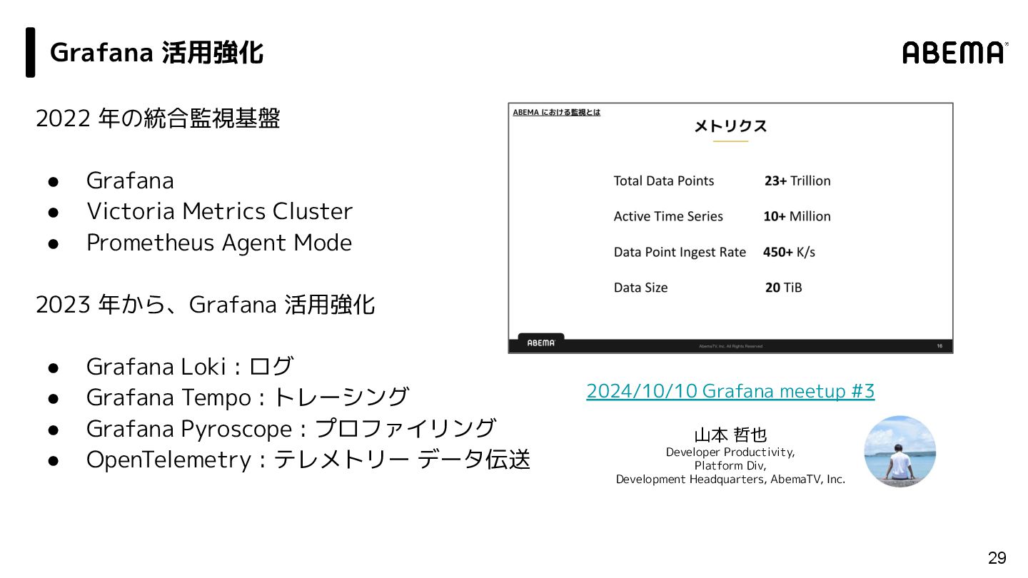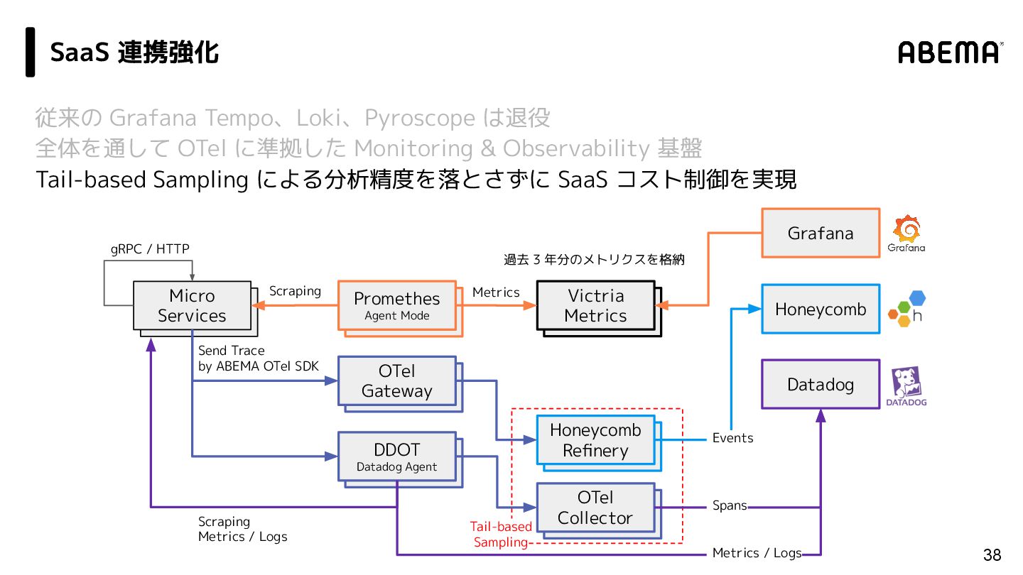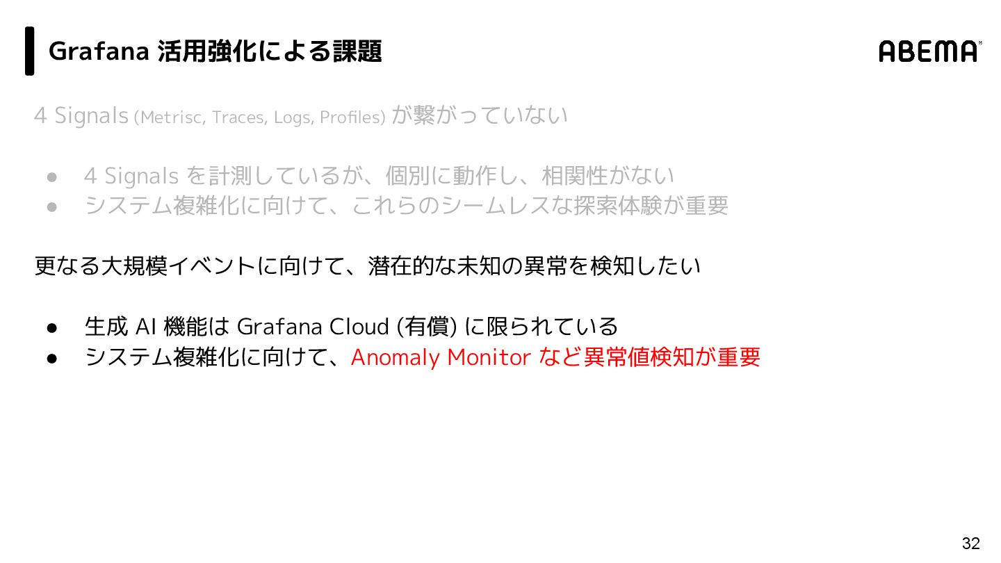 / Grafana Alloy 30 vm insert Victria Metrics vm insert Grafana Pyroscope vm insert Grafana Loki Grafana vm insert Grafana Tempo vm insert Promtail vm insert OTel Gateway vm insert Promethes Agent Mode vm insert Grafana Alloy vm insert OTel Collector vm insert Micro Services Scraping Profiles Logs Metrics gRPC / HTTP Grafana 活用強化 Send Trace by ABEMA OTel SDK