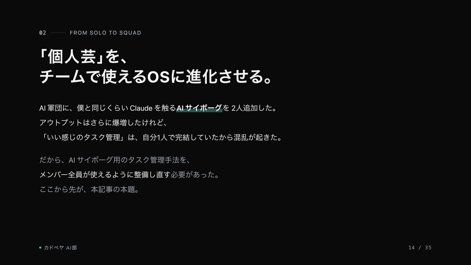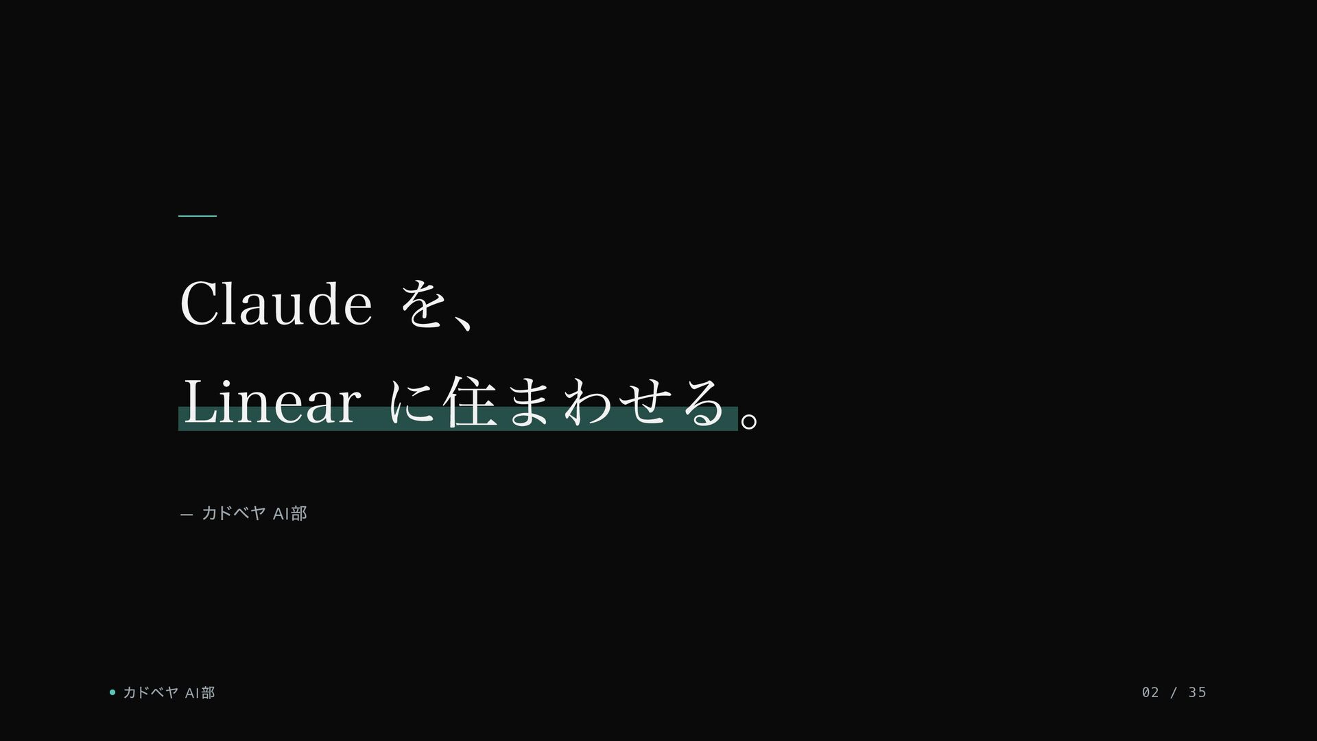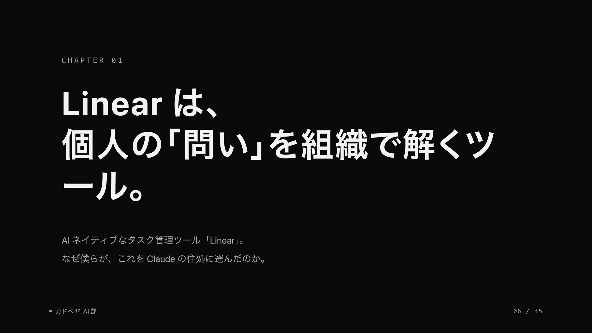 カドベヤはAIを使いこなすメンバーがたくさん所属している「AIサイボーグ集団」を目指しています。今回はClaudeとLinearを使った「バイブタスク管理」についてお話ししていきます。