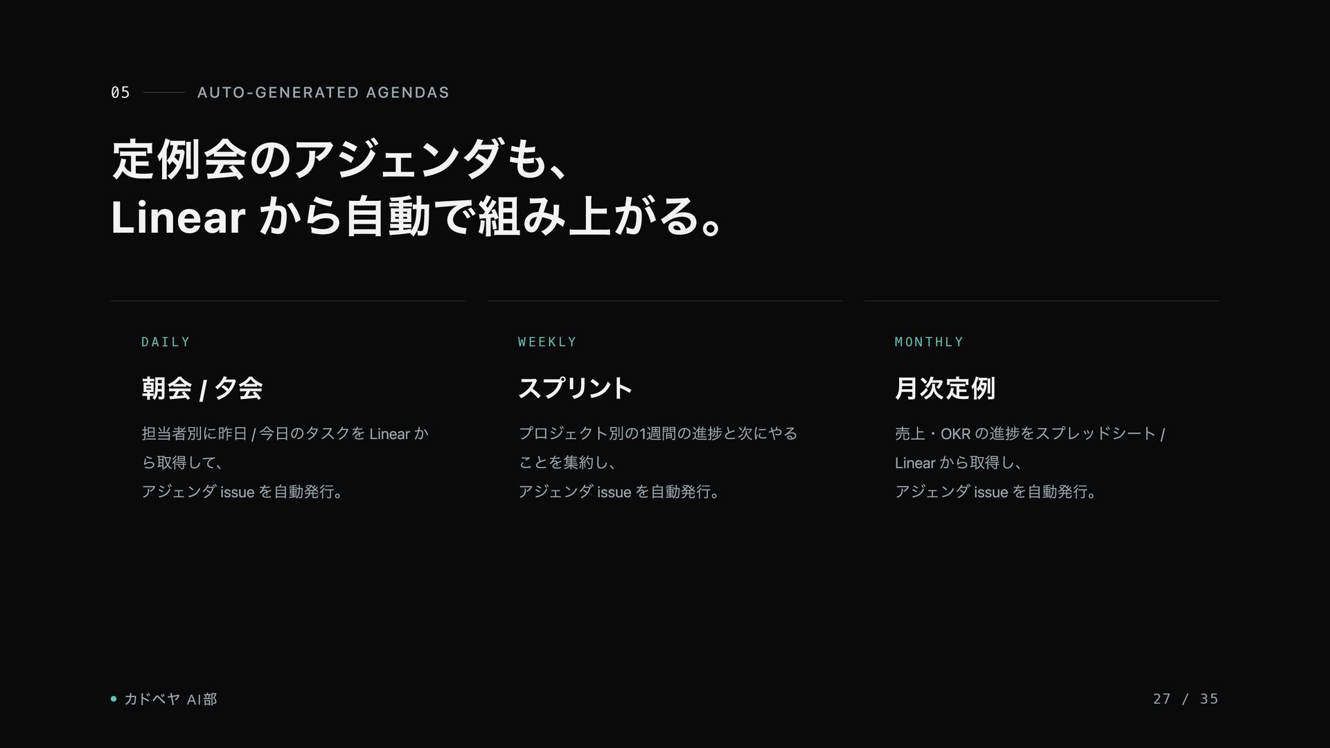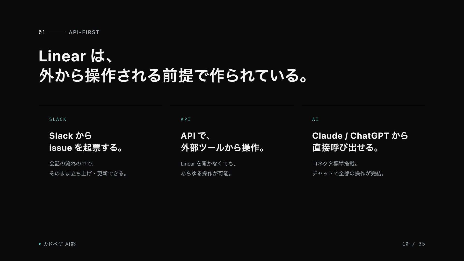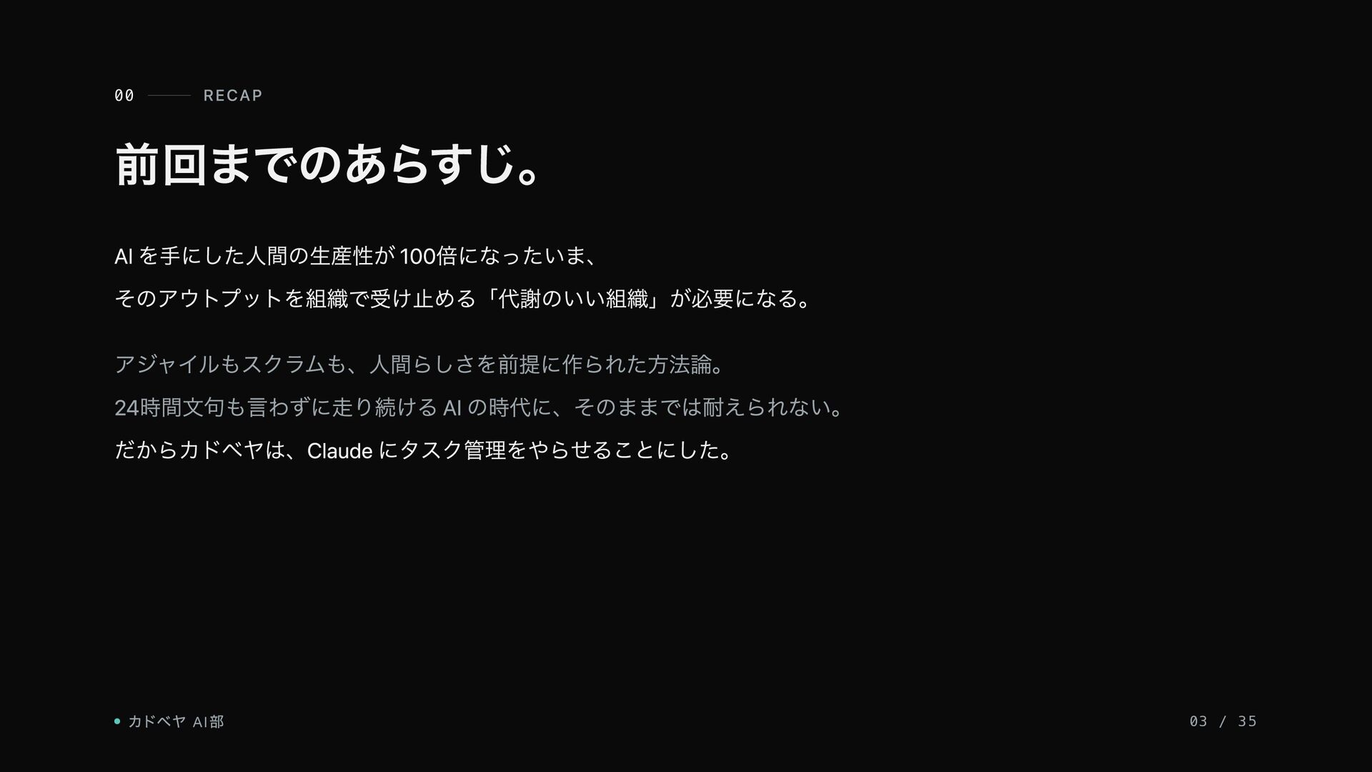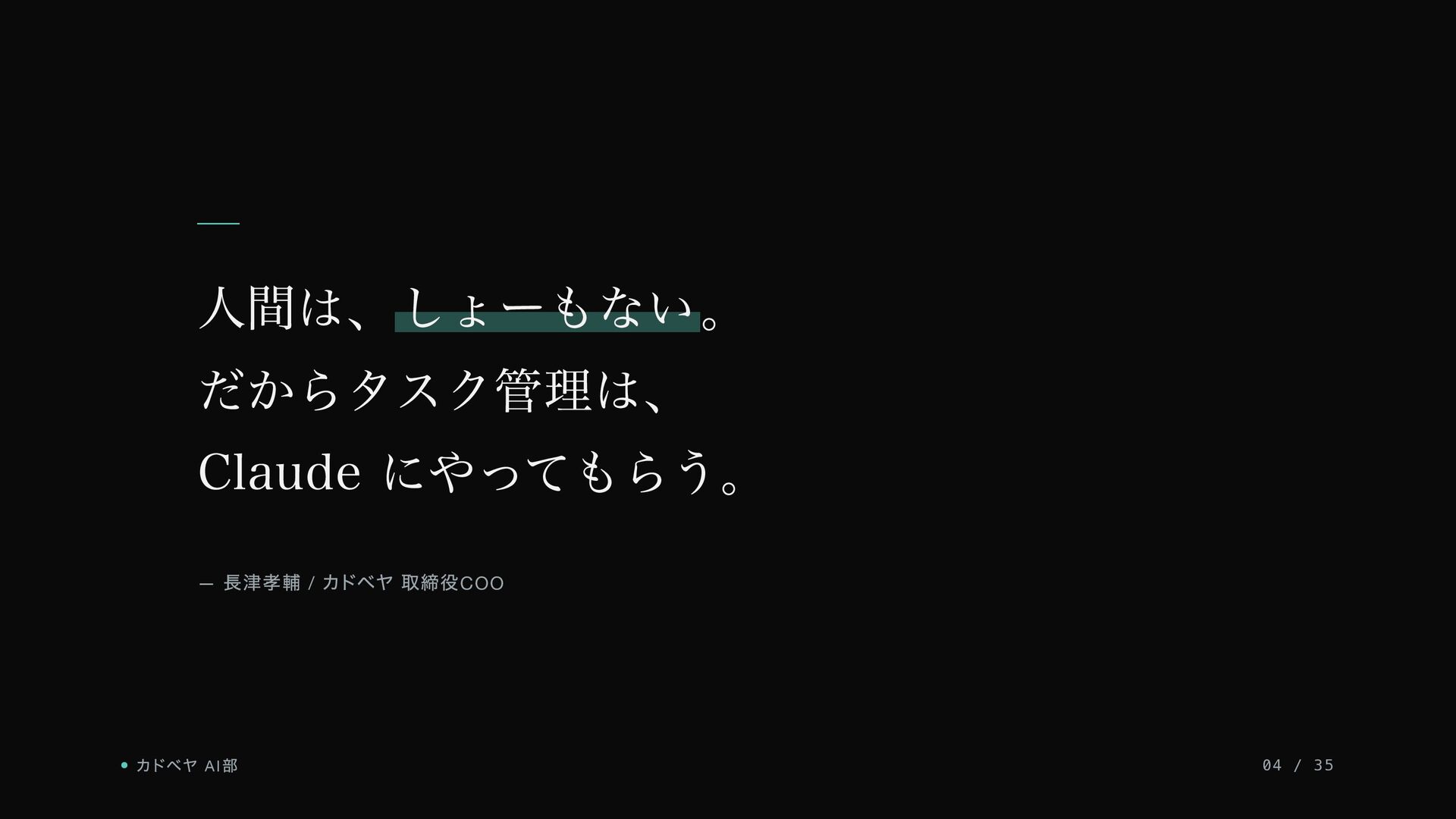 カドベヤはAIを使いこなすメンバーがたくさん所属している「AIサイボーグ集団」を目指しています。今回はClaudeとLinearを使った「バイブタスク管理」についてお話ししていきます。