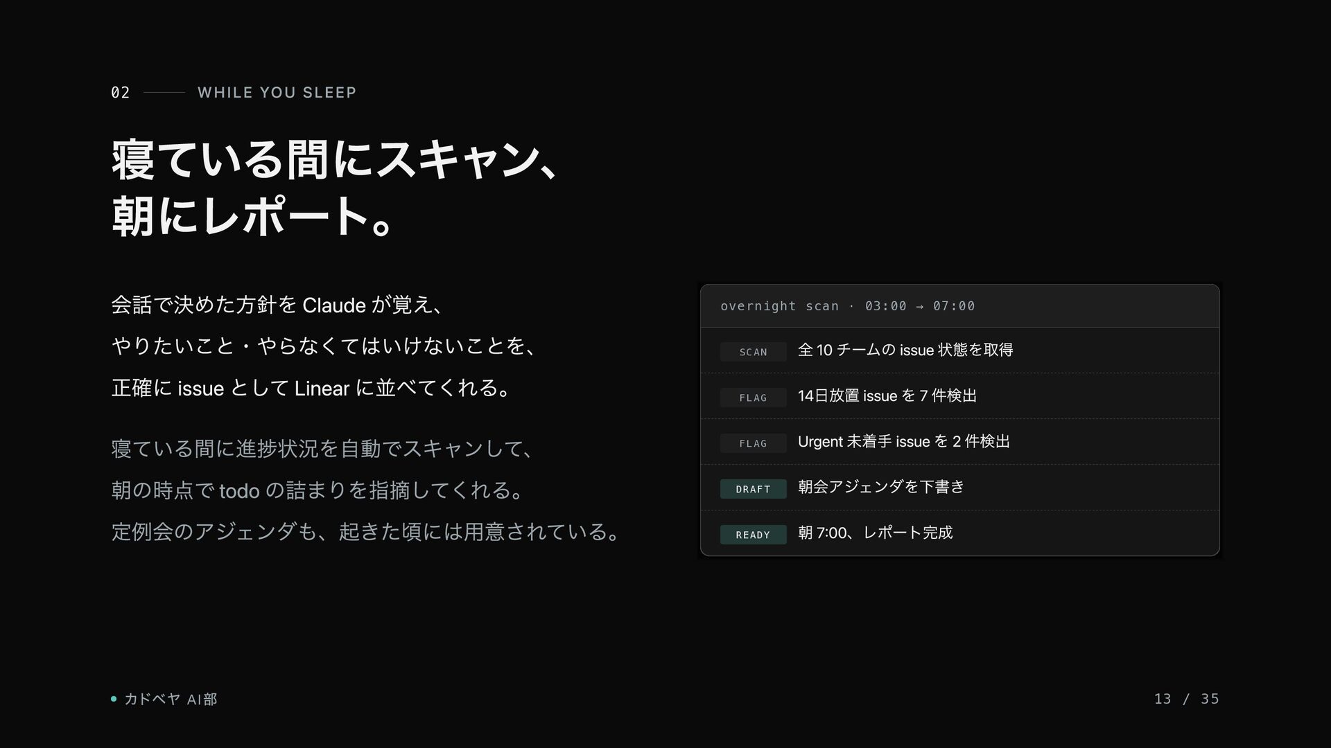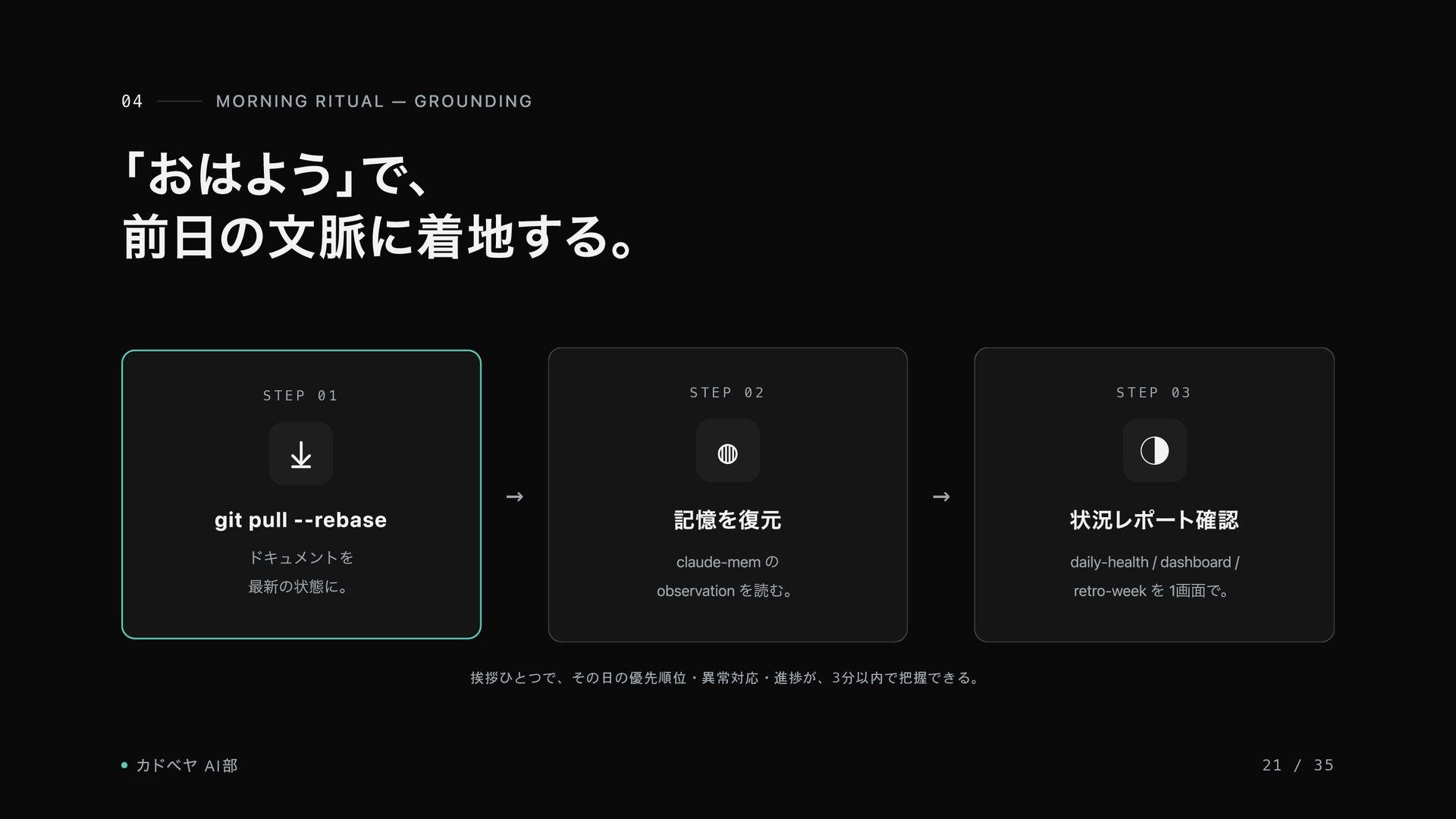 E P 0 2 ◍ → S T E P 0 3 挨拶ひとつで、その日の優先順位・異常対応・進捗が、3分以内で把握できる。 AI 21 / 35