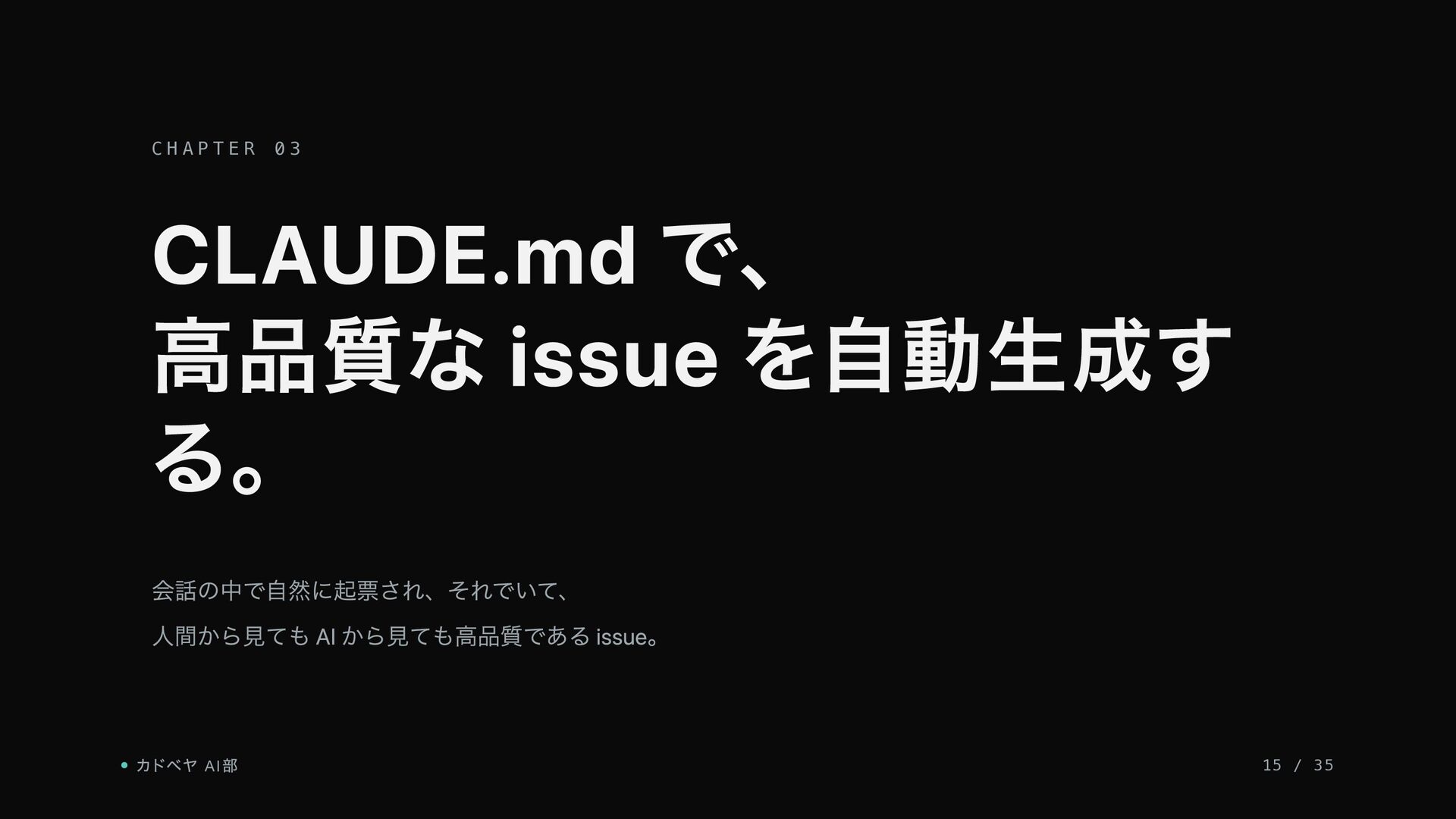 03 # CLAUDE.md プロジェクトのルールブック ## issue - テンプレに従って必ず起票する - AC