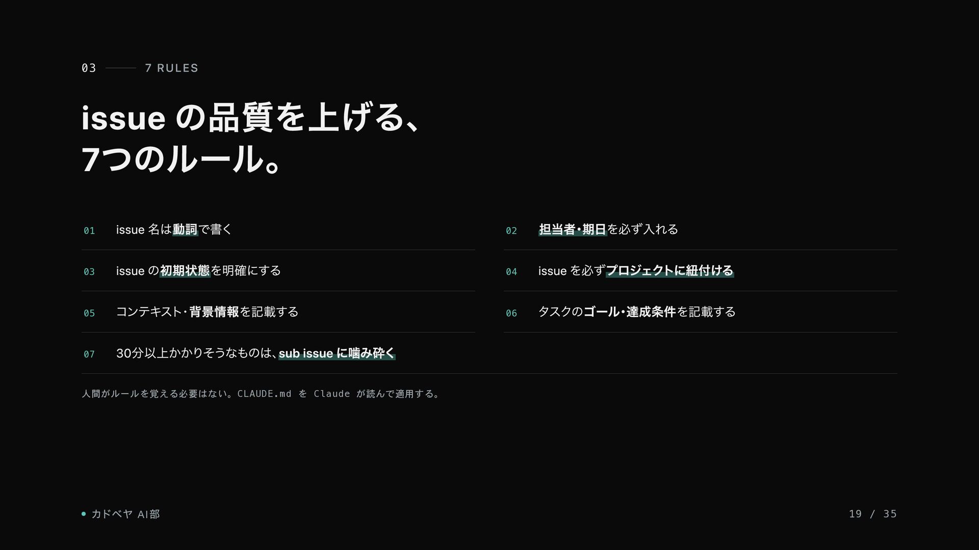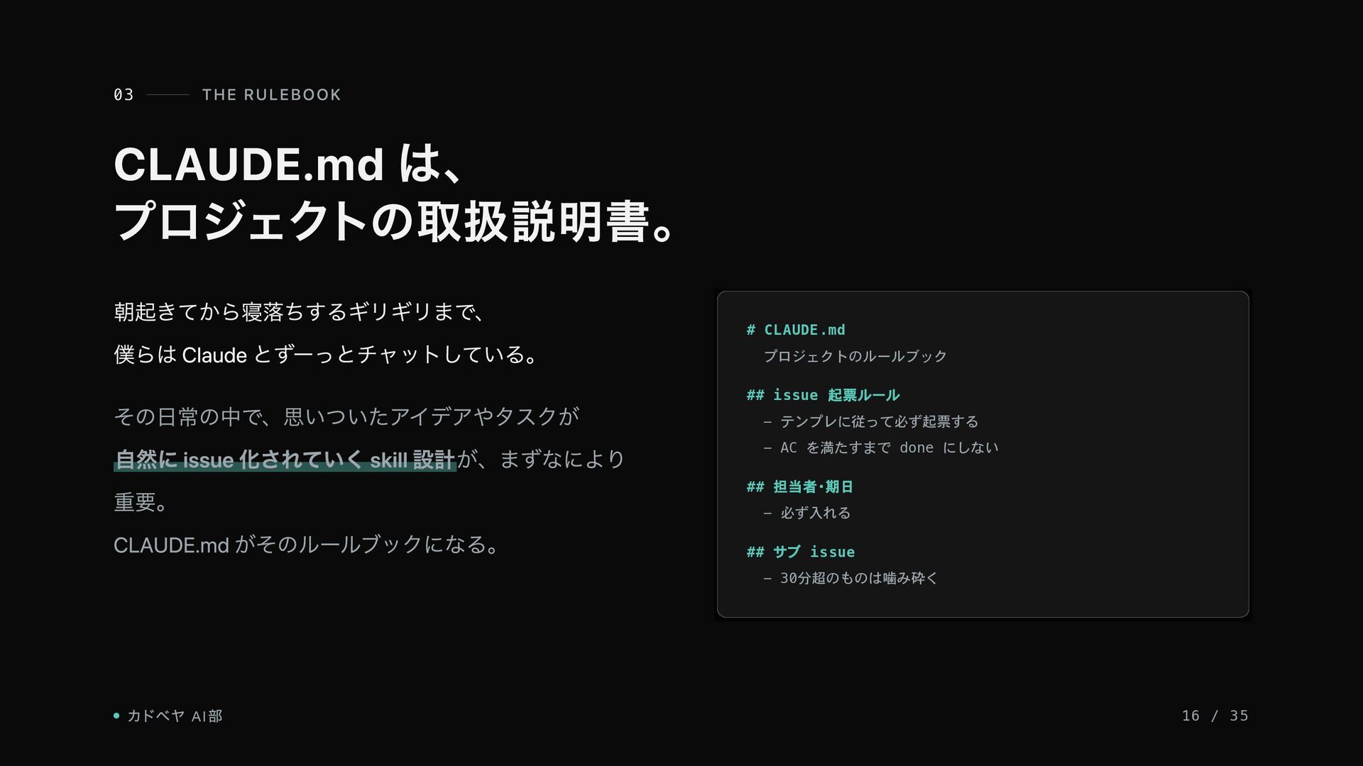 03 01 02 03 04 05 06 07 人間がルールを覚える必要はない。CLAUDE.md を