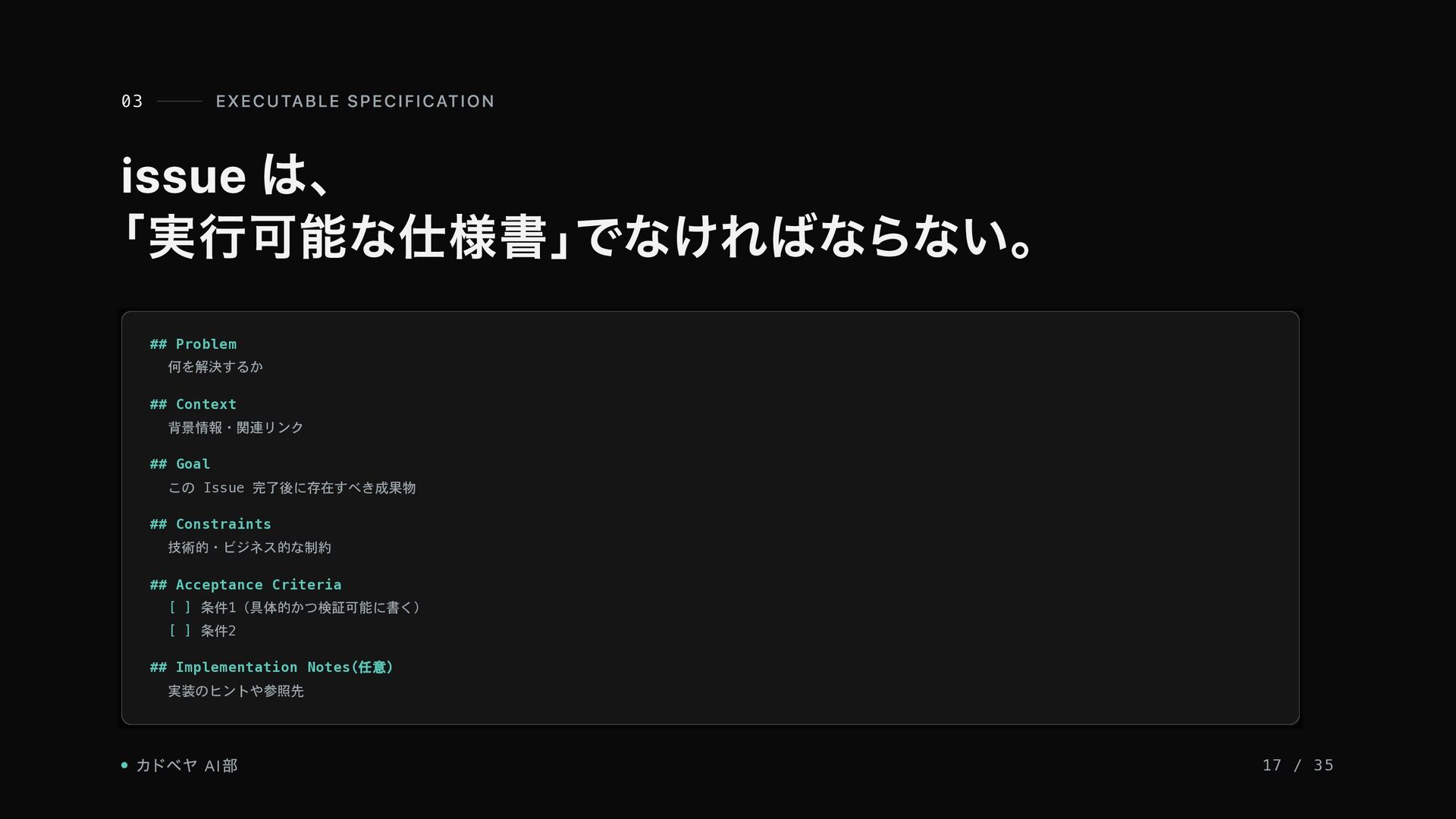 を満たすまで done にしない ## - 必ず入れる ## issue - 30分超のものは噛み砕く AI 16 / 35