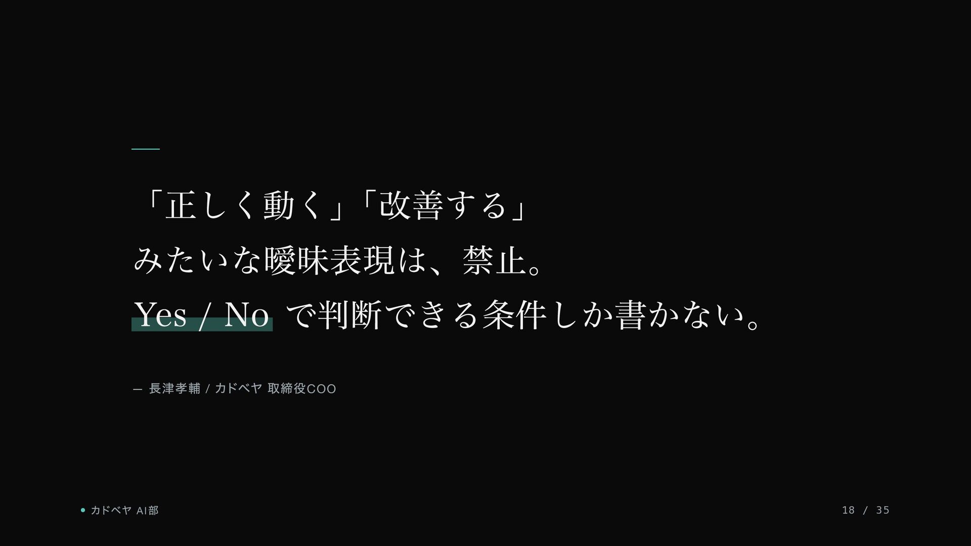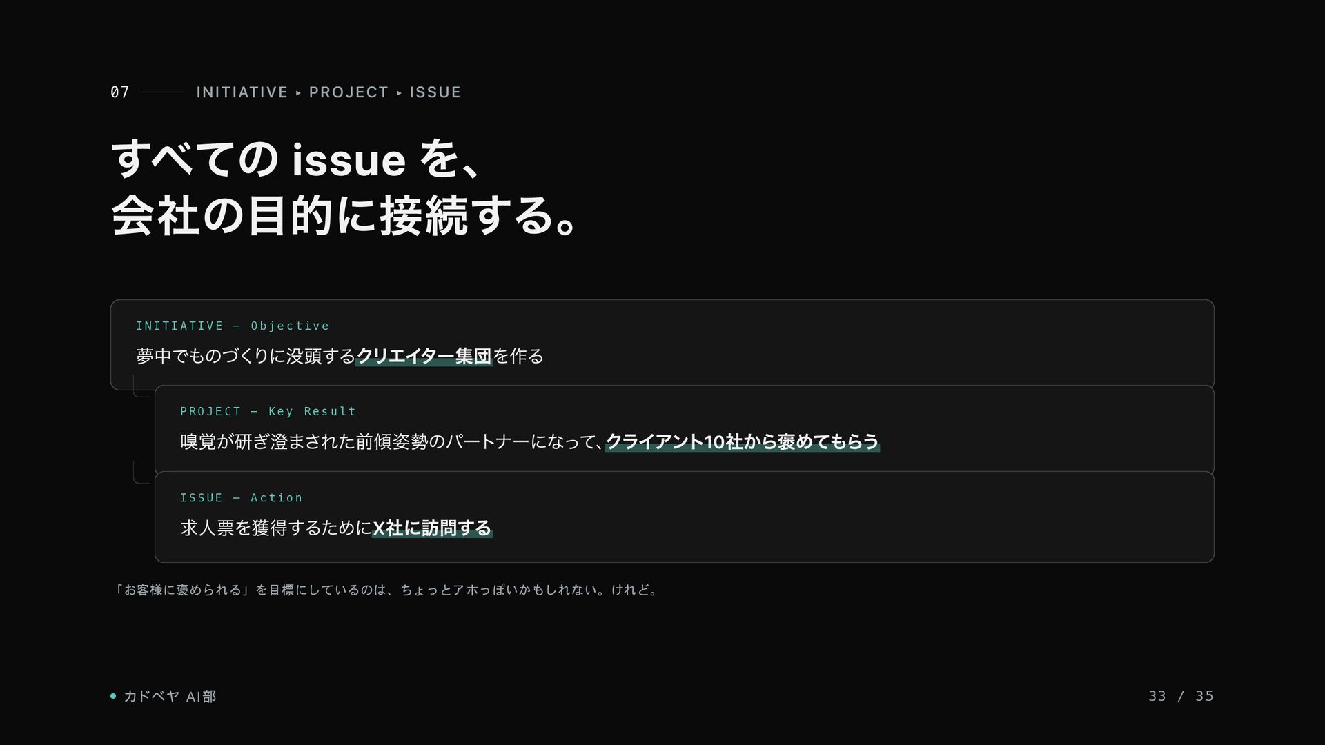 E — O b j e c t i v e 「お客様に褒められる」を目標にしているのは、ちょっとアホっぽいかもしれない。けれど。 P R O J E C T — K e y R e s u l t I S S U E — A c t i o n AI 33 / 35