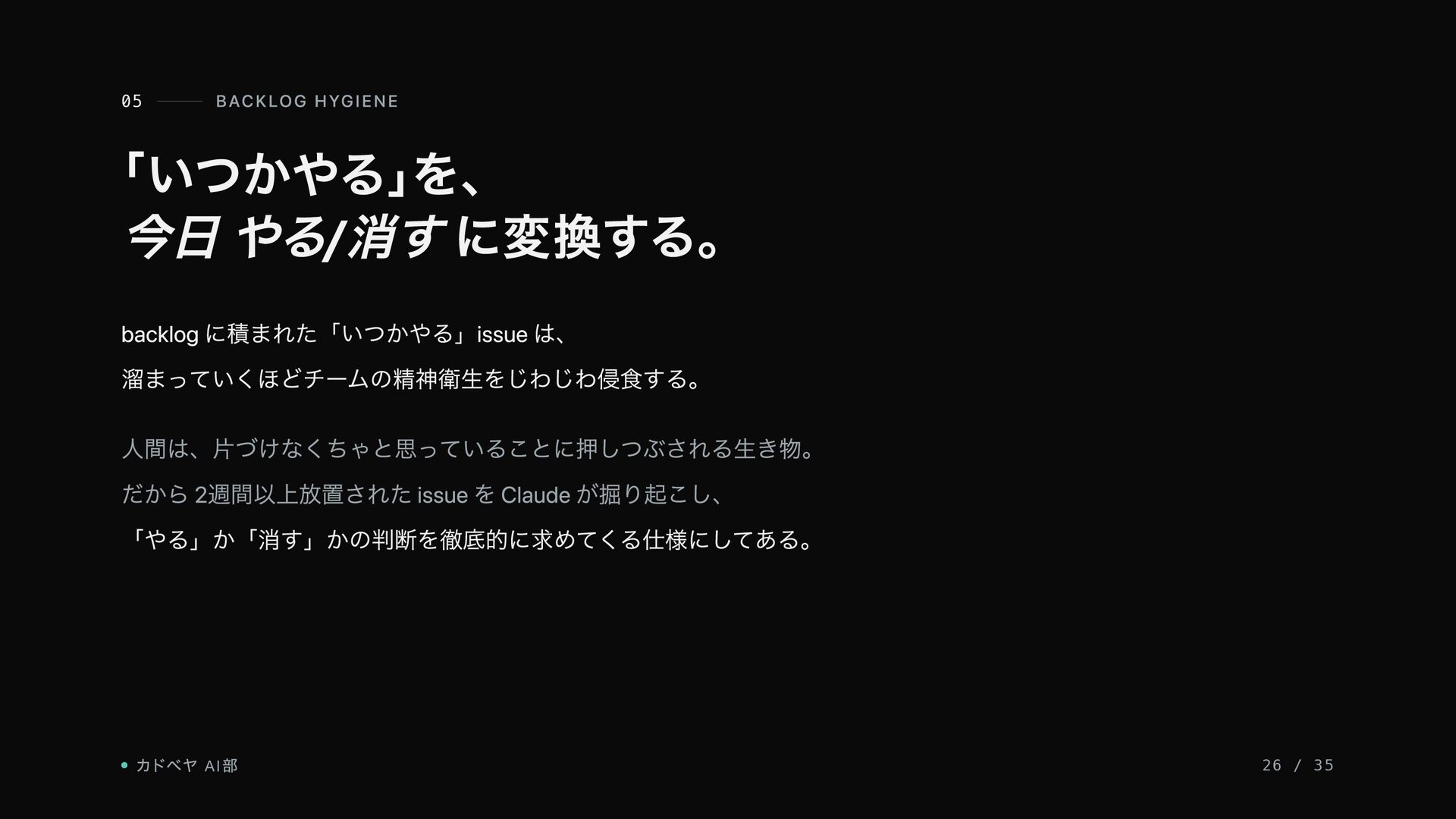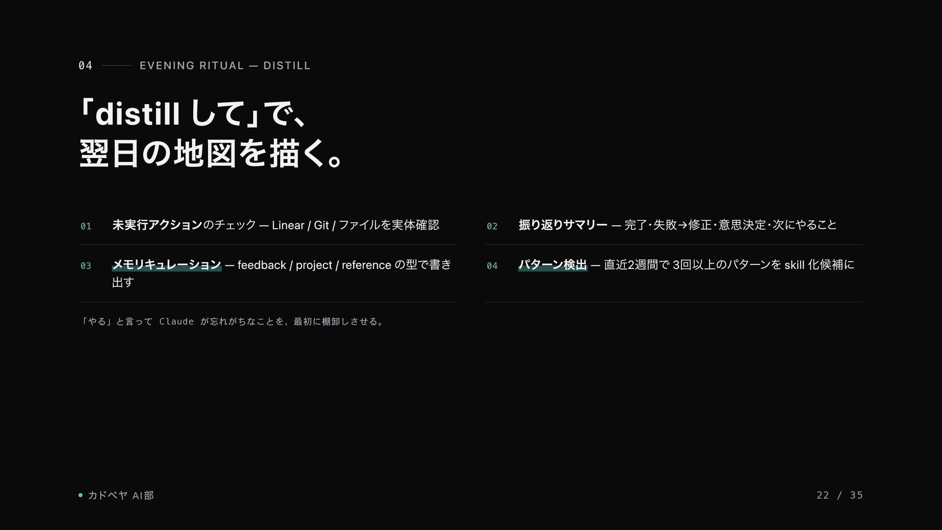 04 01 02 03 04 「やる」と言って Claude が忘れがちなことを、最初に棚卸しさせる。 AI 22