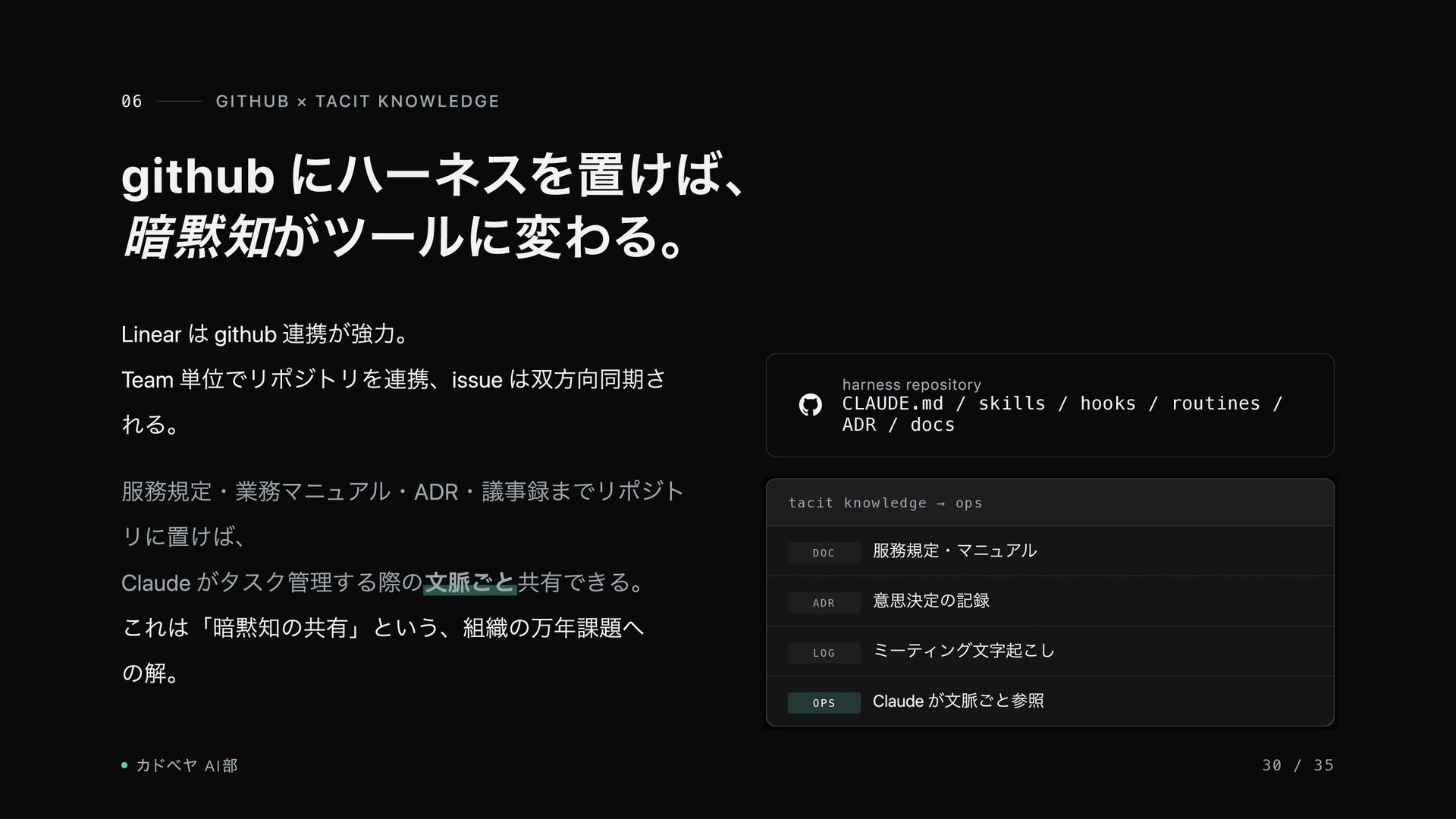 / docs tacit knowledge → ops DOC ADR LOG OPS AI 30 / 35