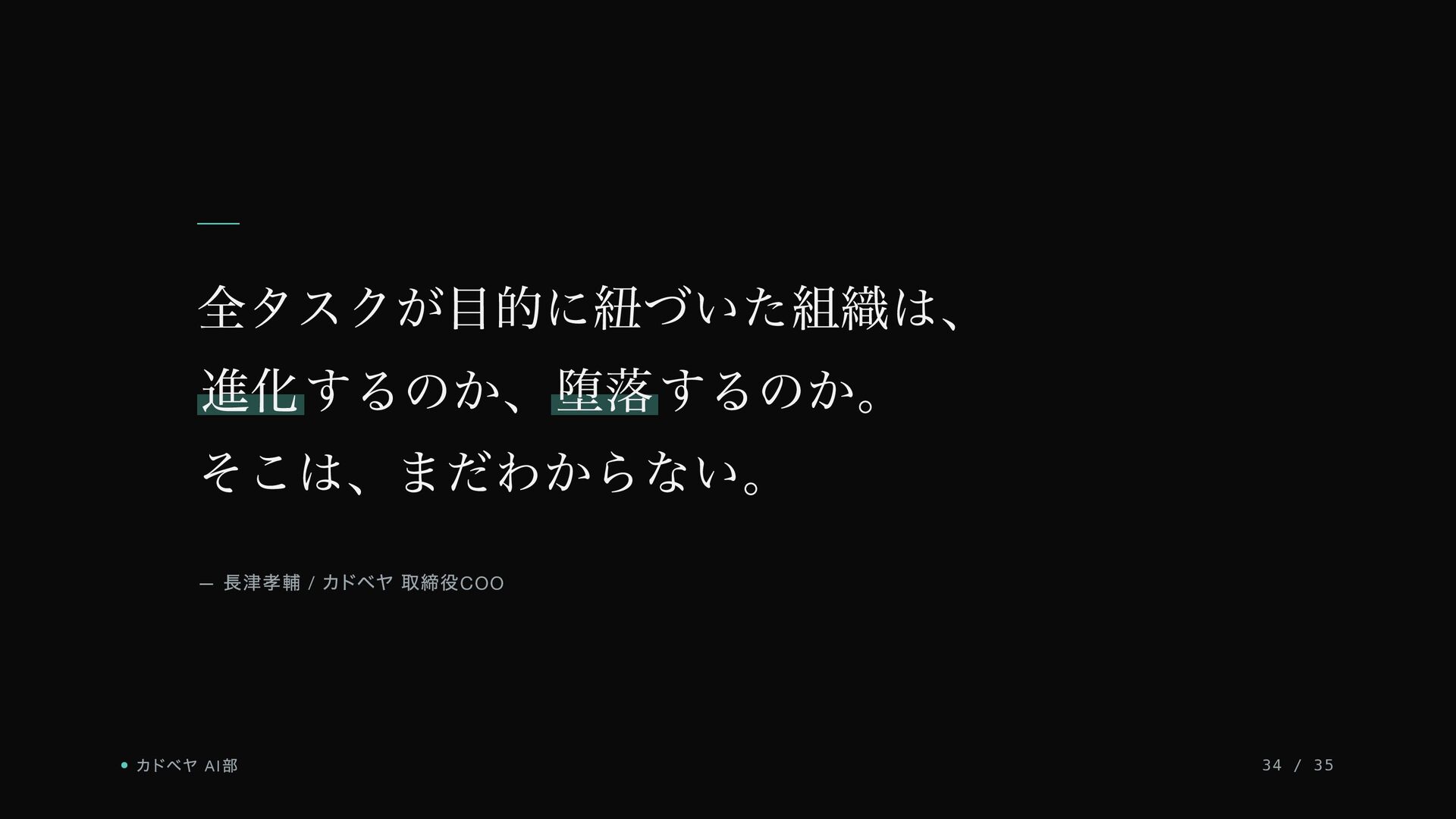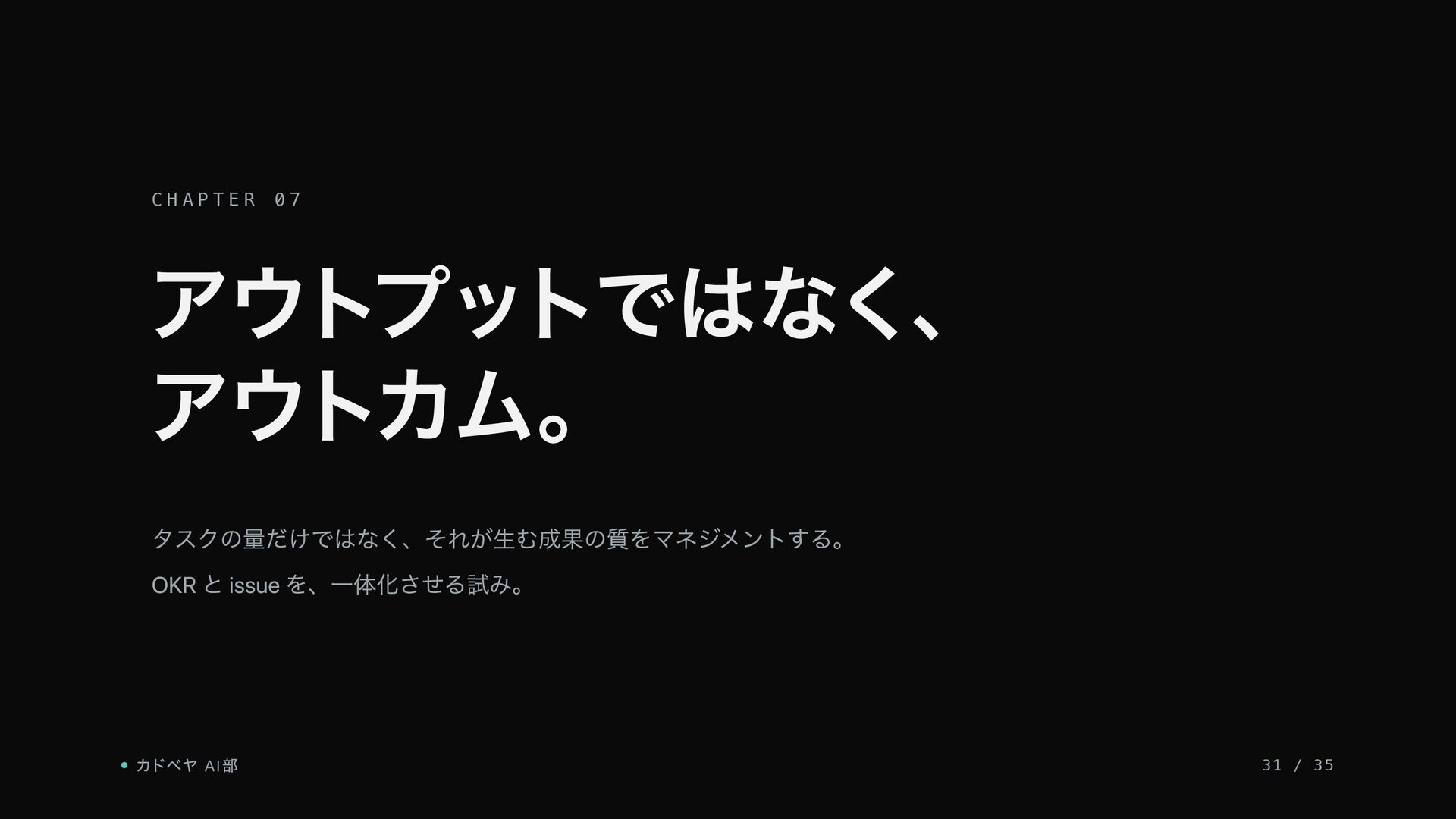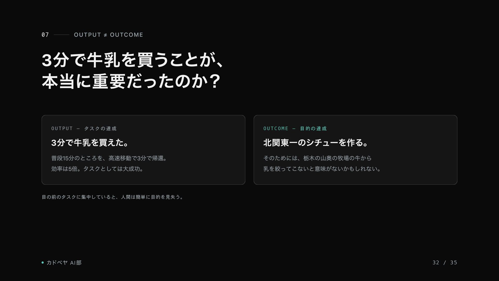 ク の 達 成 O U T C O M E — 目 的 の 達 成 目の前のタスクに集中していると、人間は簡単に目的を見失う。 AI 32 / 35