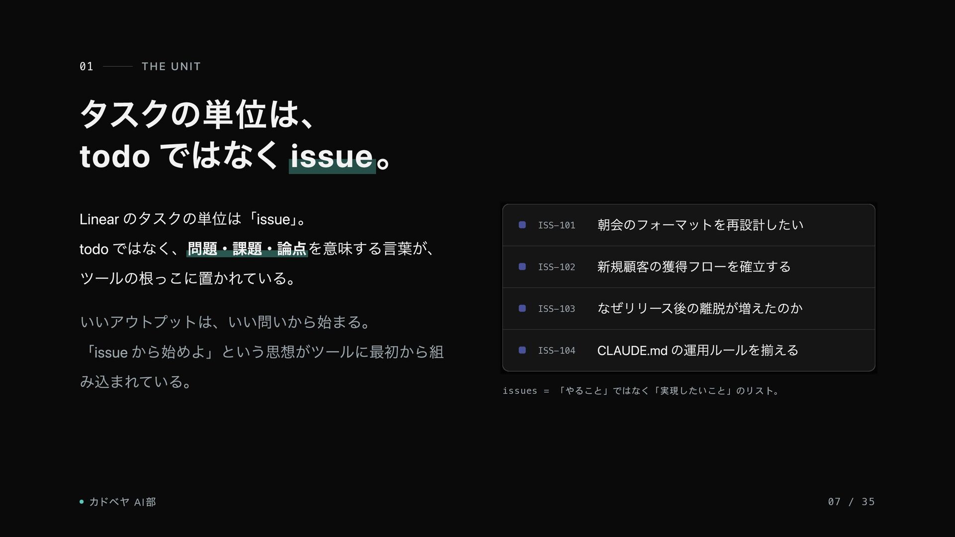 01 ISS-101 ISS-102 ISS-103 ISS-104 issues = 「やること」ではなく「実現したいこと」のリスト。 AI 07