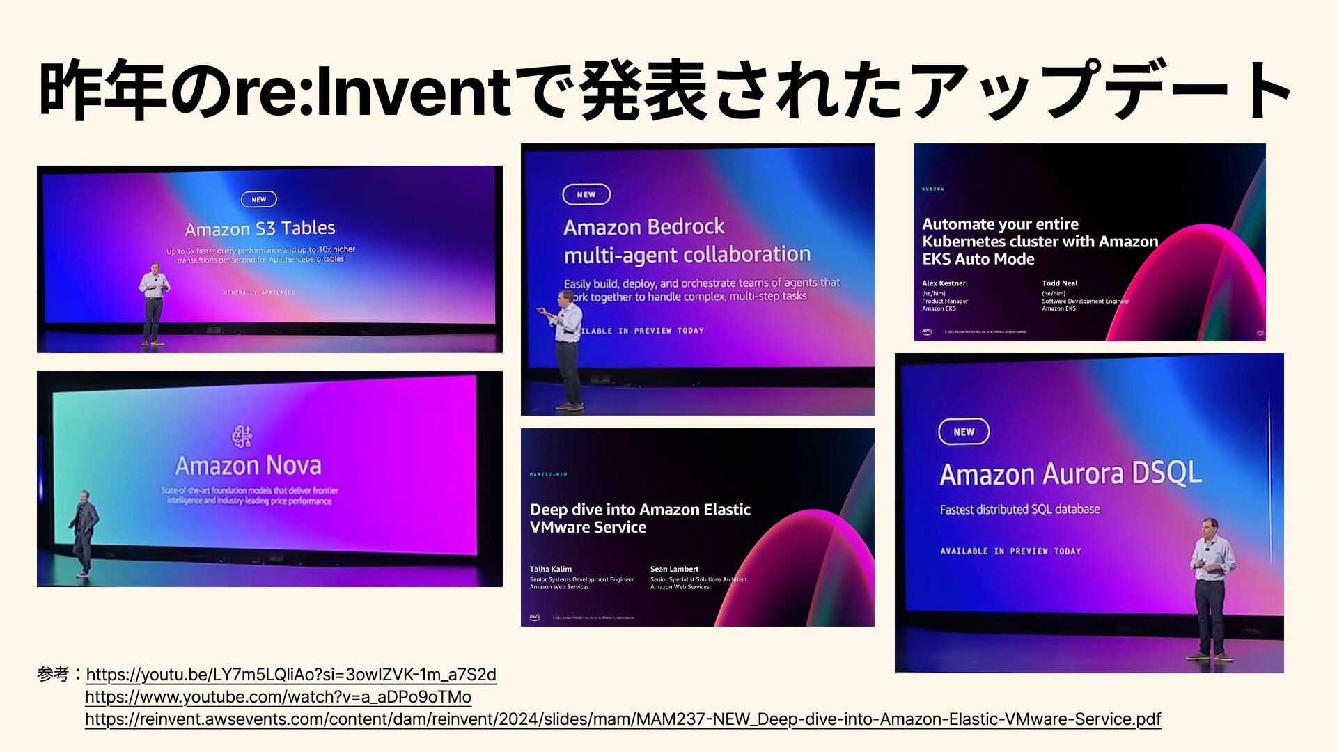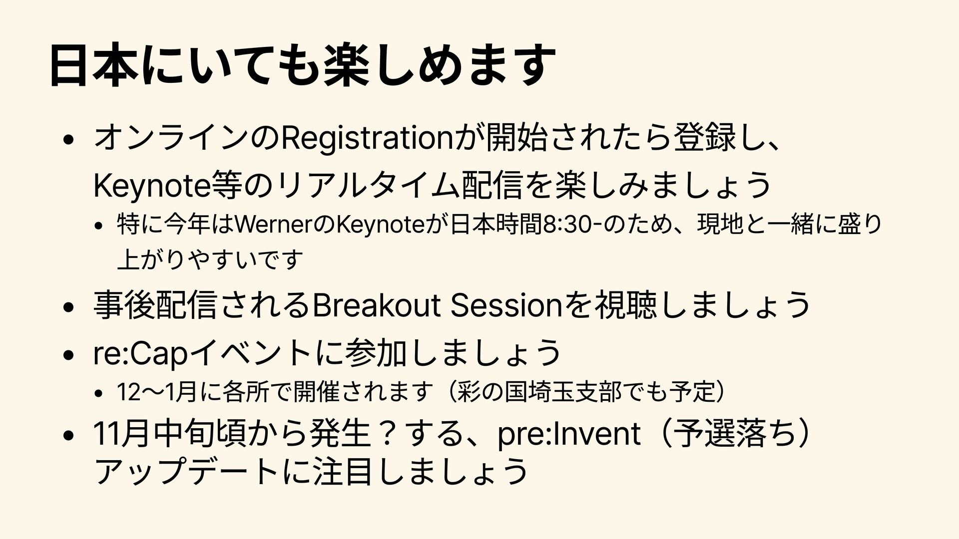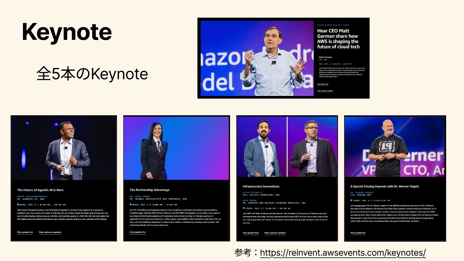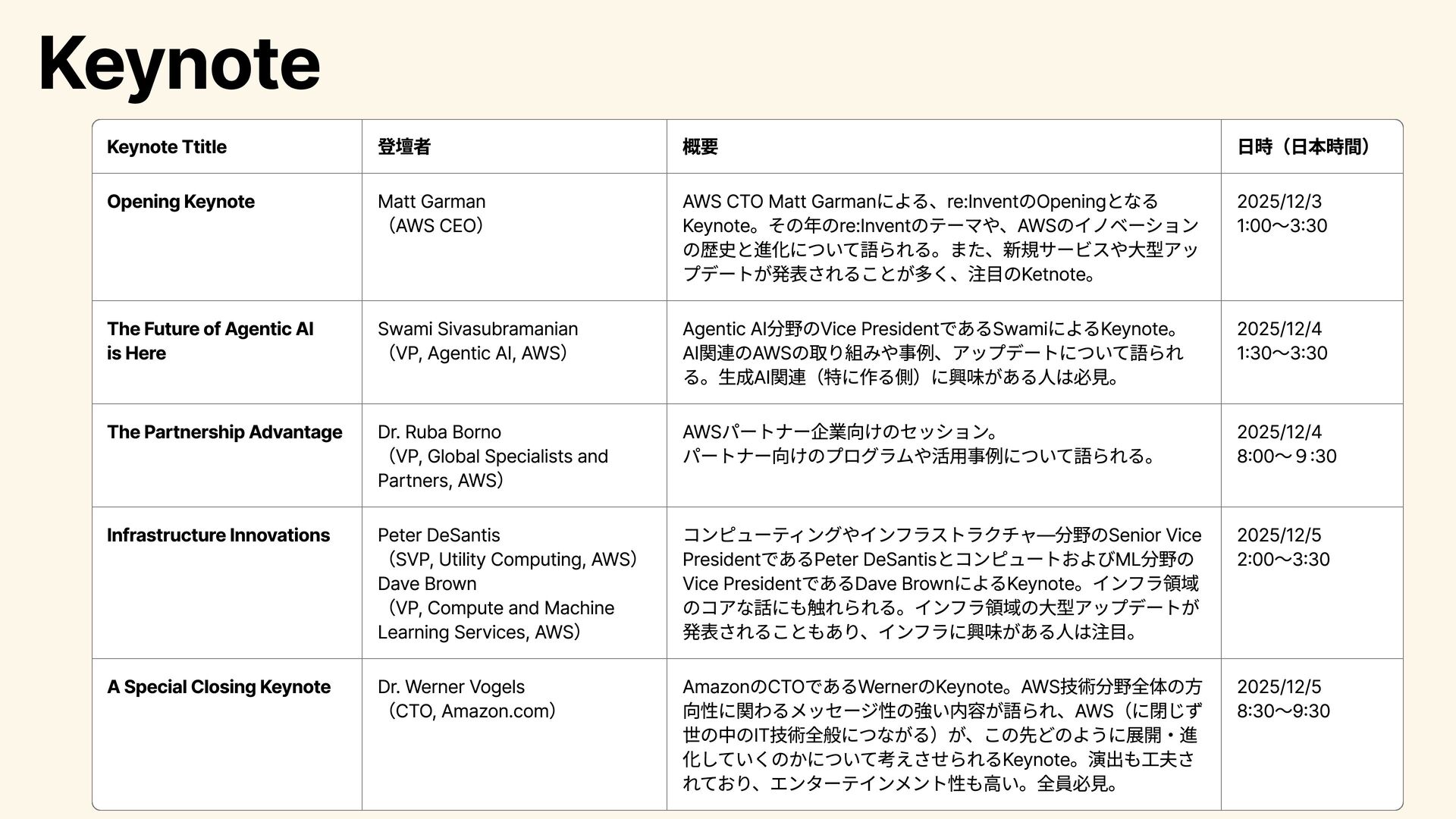 パートナー向けのプログラムや活用事例について語られる。 2025/12/4 8:00~9:30 Infrastructure Innovations Peter DeSantis (SVP, Utility Computing, AWS) Dave Brown (VP, Compute and Machine Learning Services, AWS) コンピューティングやインフラストラクチャ―分野のSenior Vice PresidentであるPeter DeSantisとコンピュートおよびML分野の Vice PresidentであるDave BrownによるKeynote。インフラ領域 のコアな話にも触れられる。インフラ領域の大型アップデートが 発表されることもあり、インフラに興味がある人は注目。 2025/12/5 2:00~3:30 A Special Closing Keynote Dr. Werner Vogels (CTO, Amazon.com) AmazonのCTOであるWernerのKeynote。AWS技術分野全体の方 向性に関わるメッセージ性の強い内容が語られ、AWS(に閉じず 世の中のIT技術全般につながる)が、この先どのように展開・進 化していくのかについて考えさせられるKeynote。演出 も工夫さ れており、エンターテインメント性 も高い。全員必見。 2025/12/5 8:30~9:30