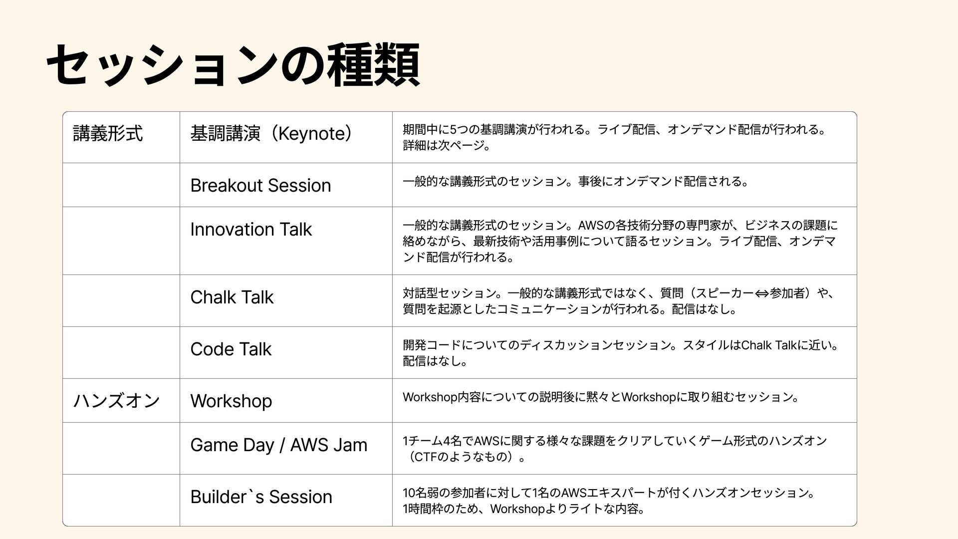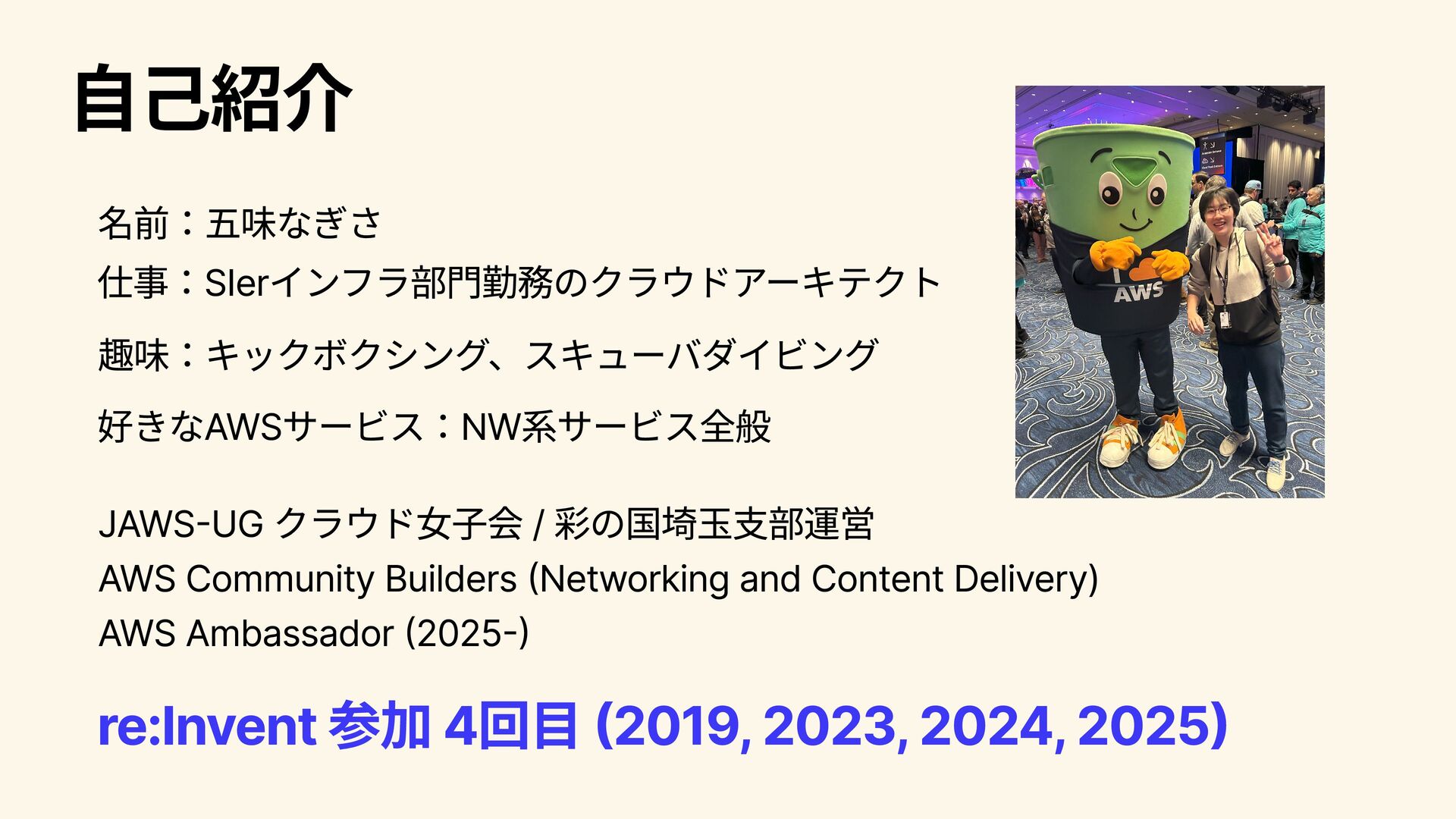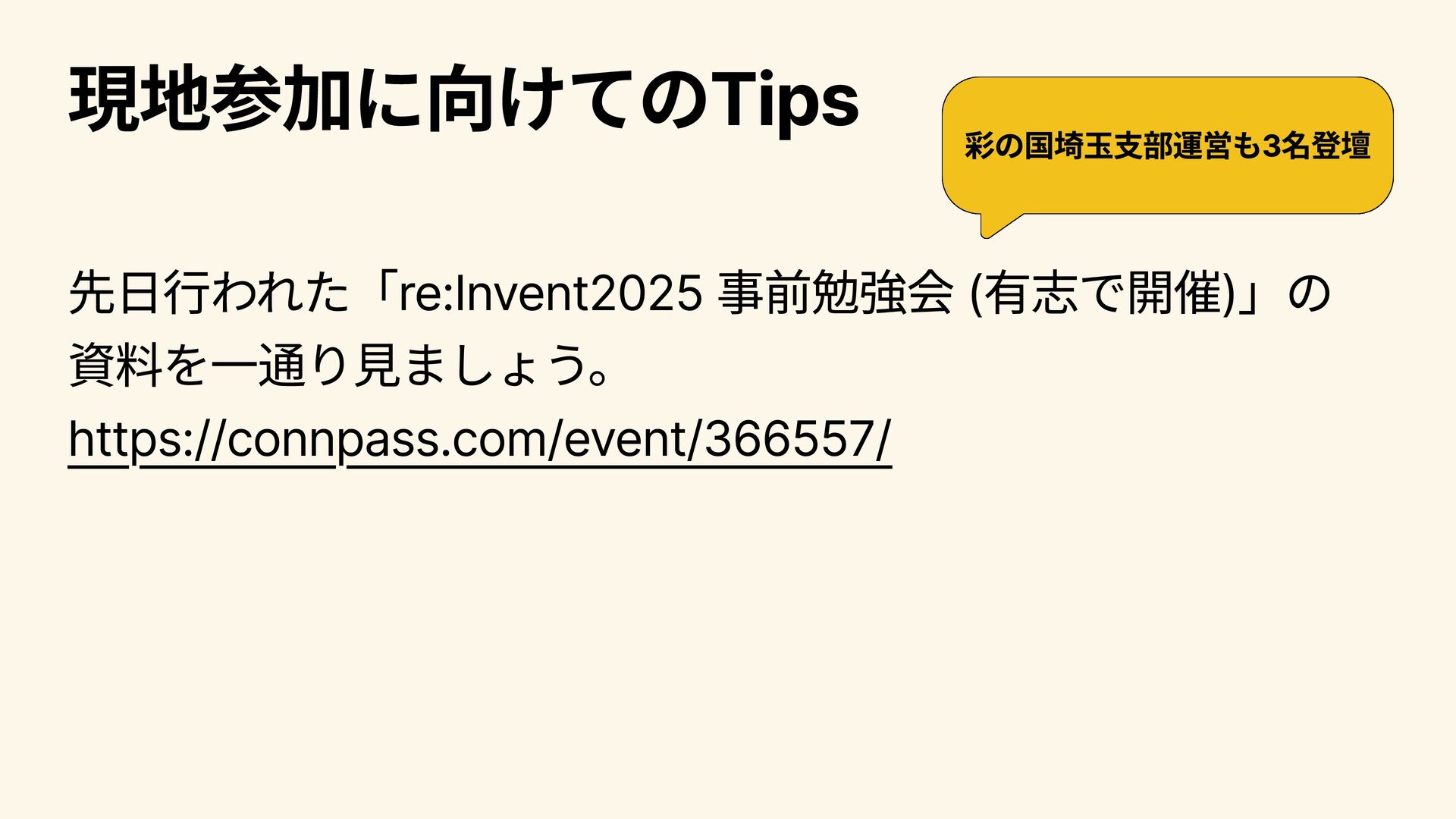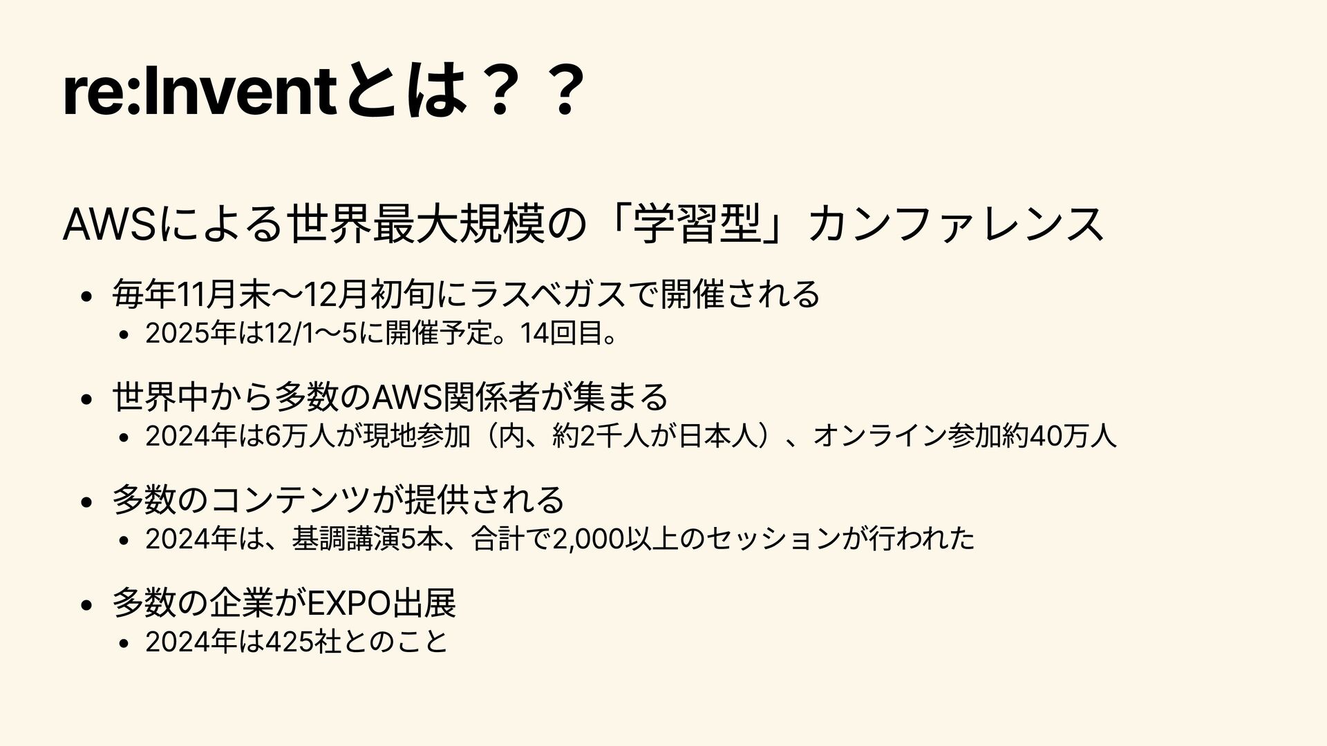 パートナー向けのプログラムや活用事例について語られる。 2025/12/4 8:00~9:30 Infrastructure Innovations Peter DeSantis (SVP, Utility Computing, AWS) Dave Brown (VP, Compute and Machine Learning Services, AWS) コンピューティングやインフラストラクチャ―分野のSenior Vice PresidentであるPeter DeSantisとコンピュートおよびML分野の Vice PresidentであるDave BrownによるKeynote。インフラ領域 のコアな話にも触れられる。インフラ領域の大型アップデートが 発表されることもあり、インフラに興味がある人は注目。 2025/12/5 2:00~3:30 A Special Closing Keynote Dr. Werner Vogels (CTO, Amazon.com) AmazonのCTOであるWernerのKeynote。AWS技術分野全体の方 向性に関わるメッセージ性の強い内容が語られ、AWS(に閉じず 世の中のIT技術全般につながる)が、この先どのように展開・進 化していくのかについて考えさせられるKeynote。演出 も工夫さ れており、エンターテインメント性 も高い。全員必見。 2025/12/5 8:30~9:30