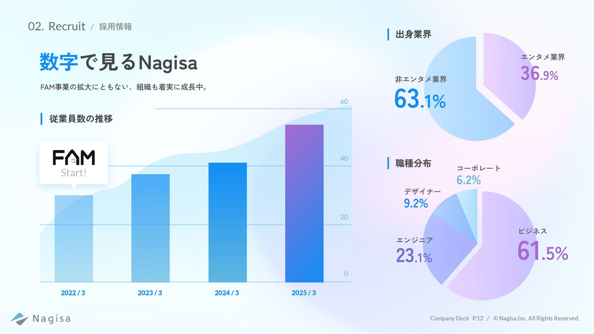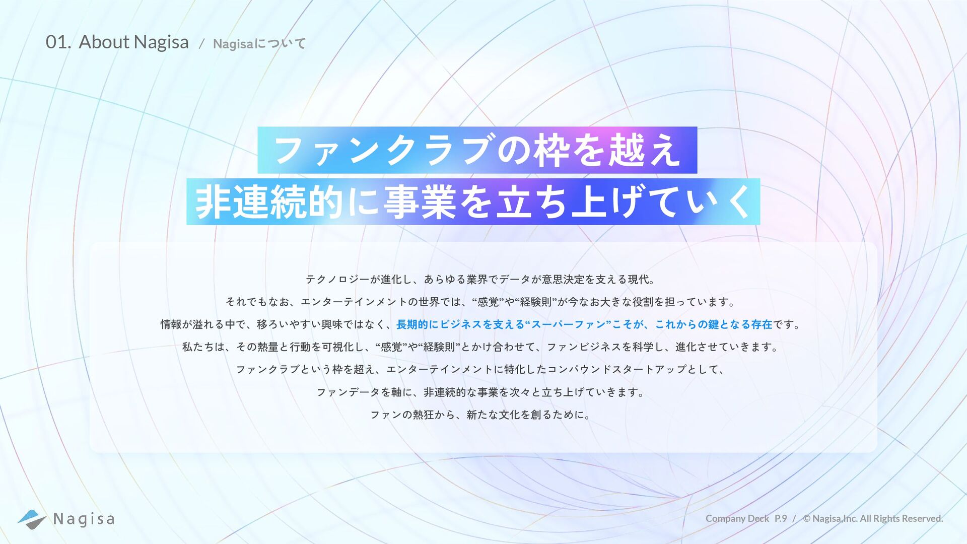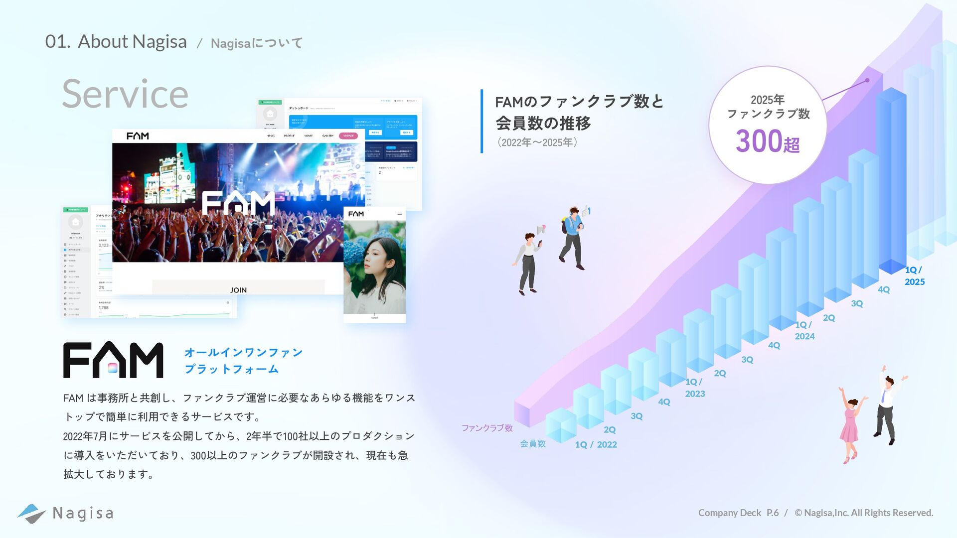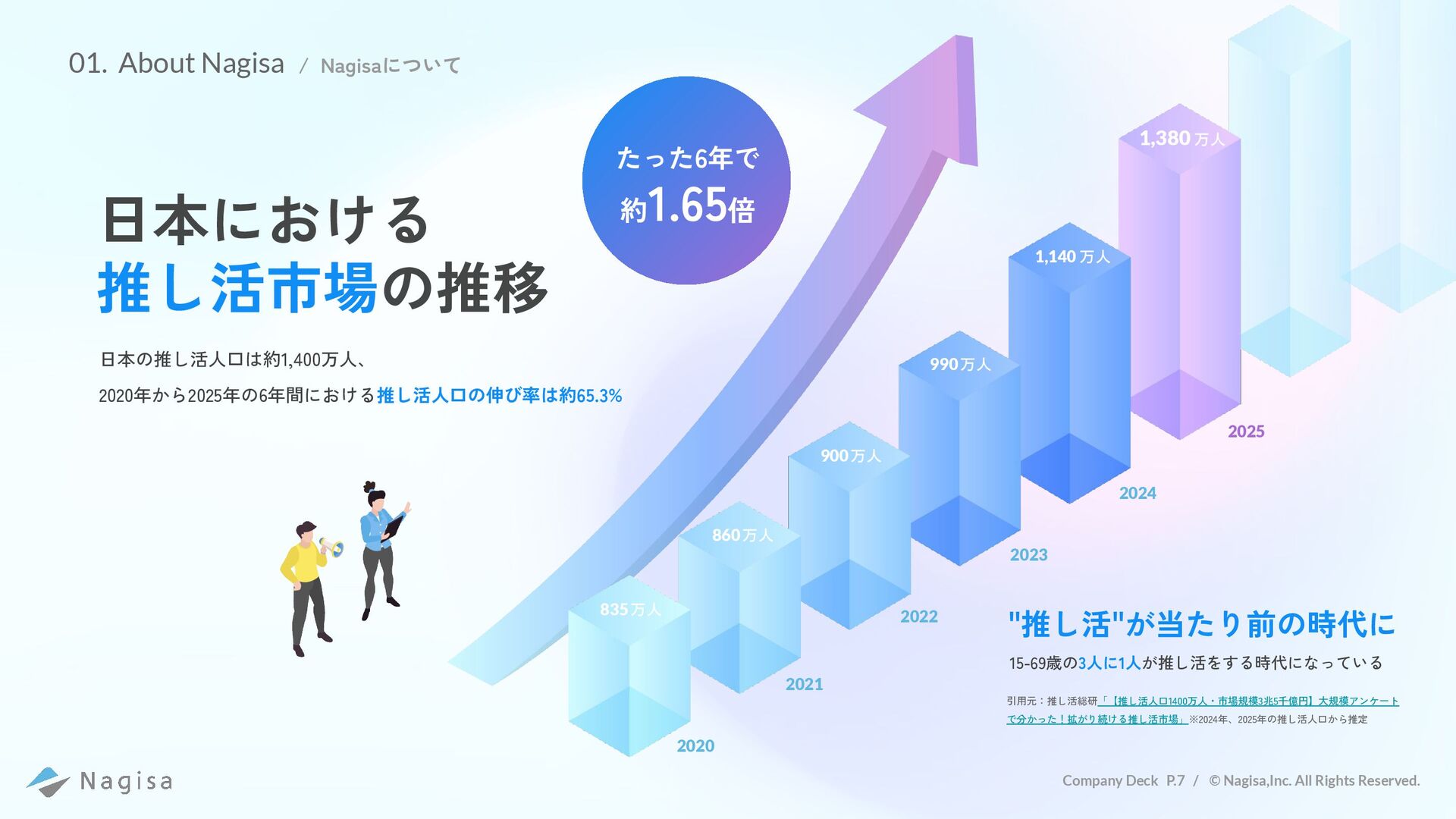推し活市場の推移 日本の推し活人口は約1,400万人、 2020年から2025年の6年間における推し活人口の伸び率は約65.3% 2020 2021 2022 2023 2024 2025 835万人 860万人 900万人 990万人 1,140 万人 1,380 万人 "推し活"が当たり前の時代に 15-69歳の3人に1人が推し活をする時代になっている たった6年で 約 1.65倍 引用元:推し活総研「【推し活人口1400万人・市場規模3兆5千億円】大規模アンケート で分かった!拡がり続ける推し活市場」※2024年、2025年の推し活人口から推定 / Nagisaについて 01. About Nagisa