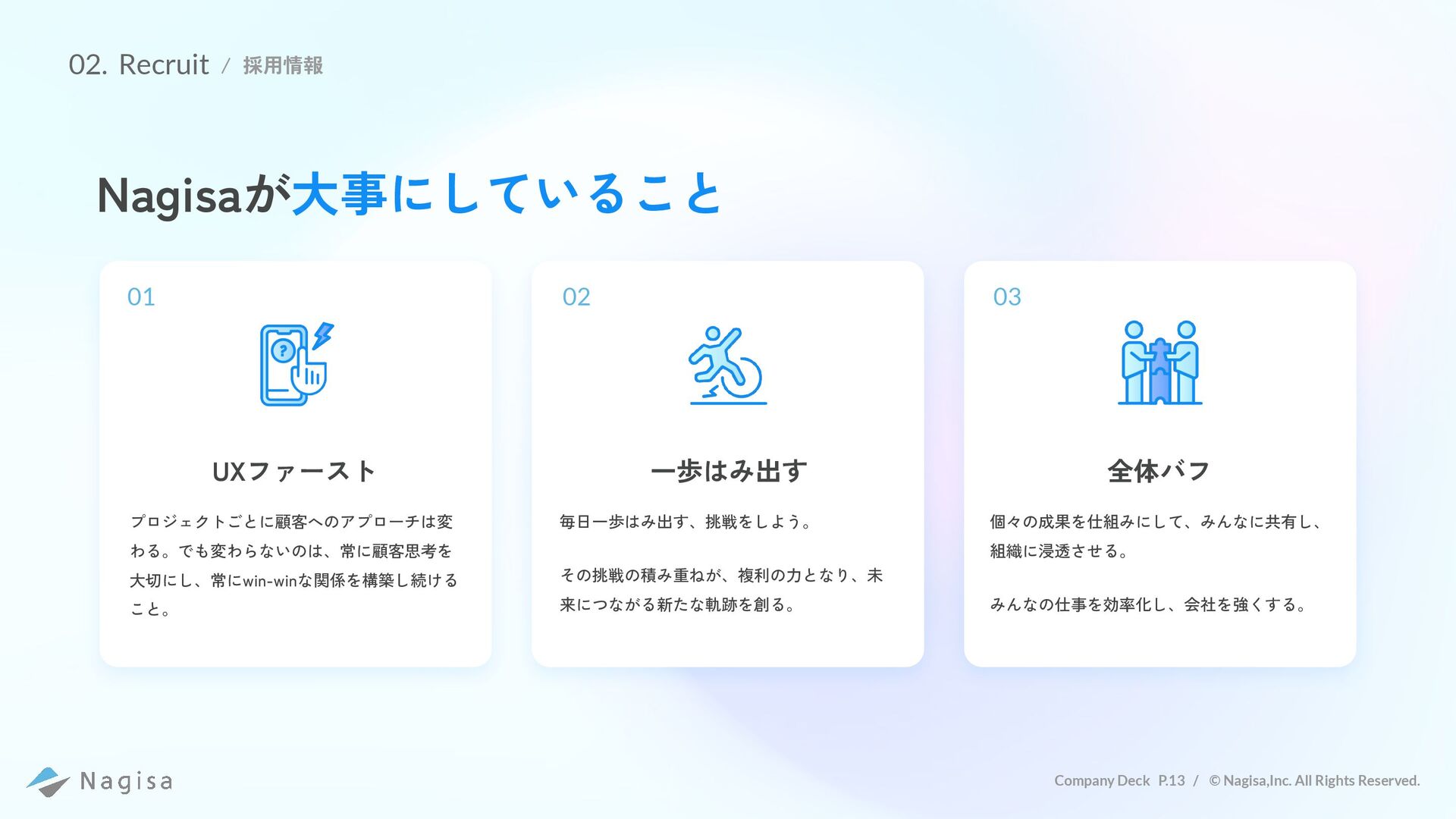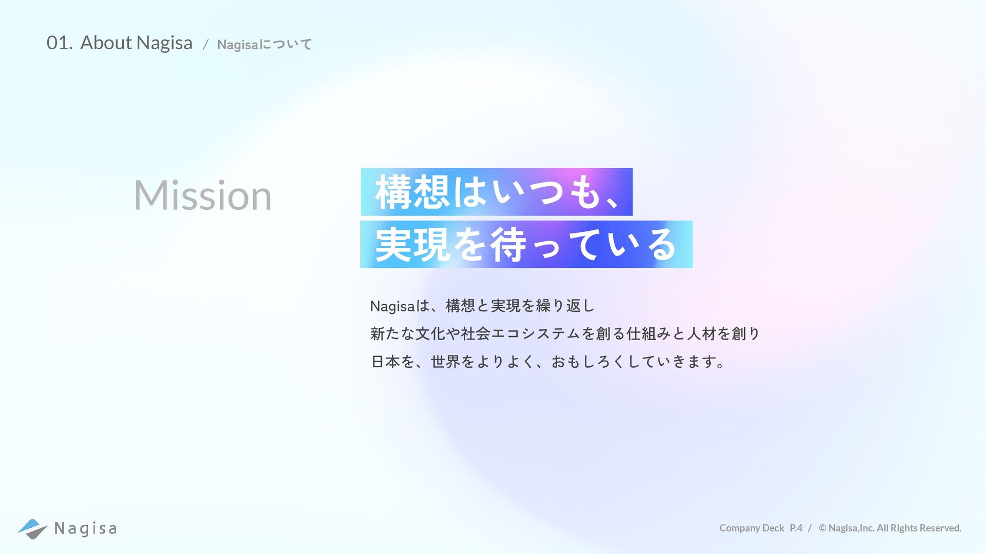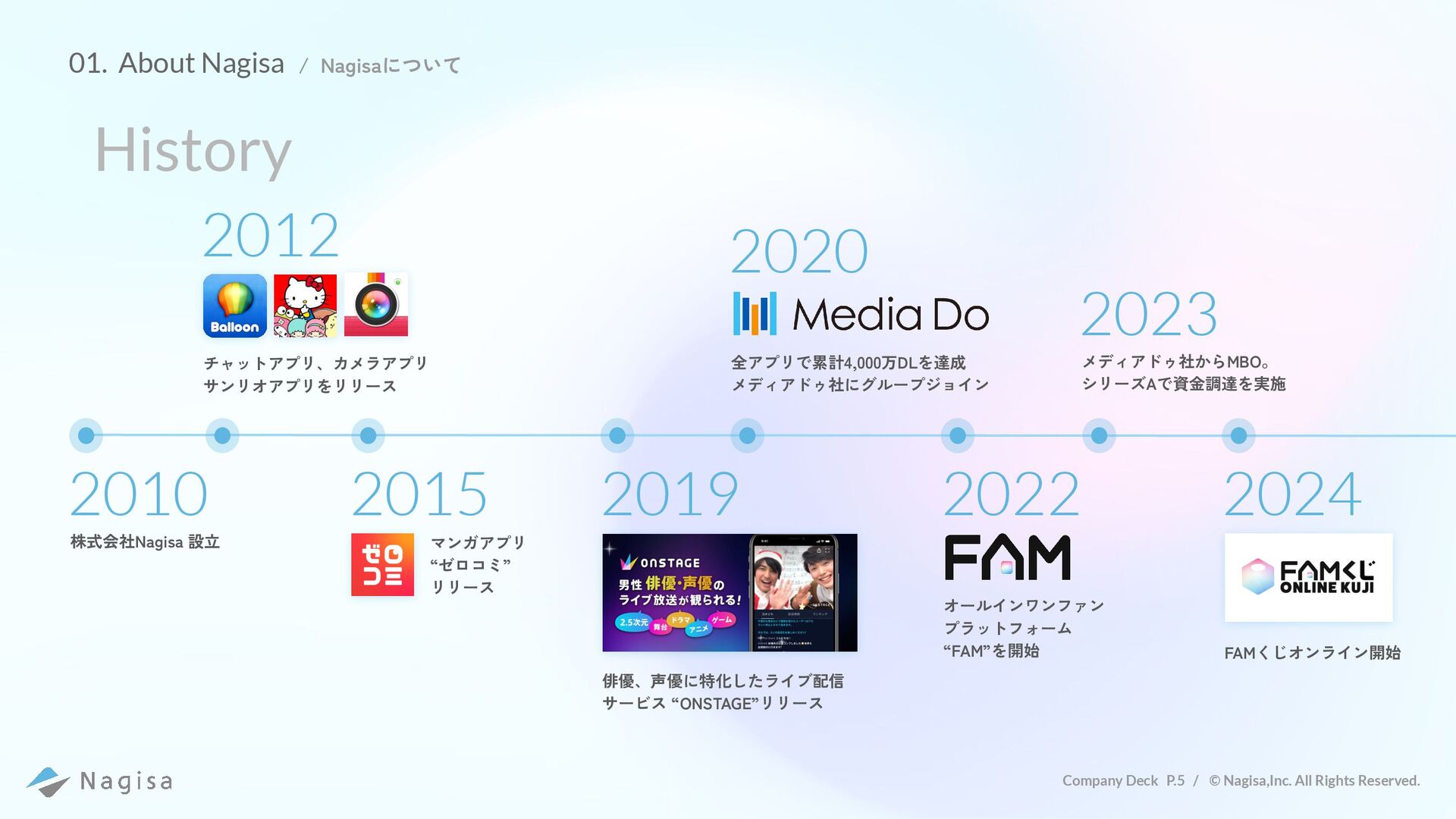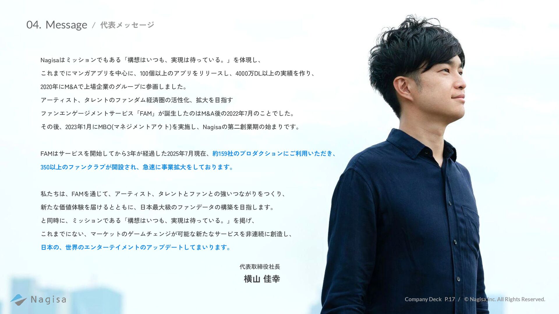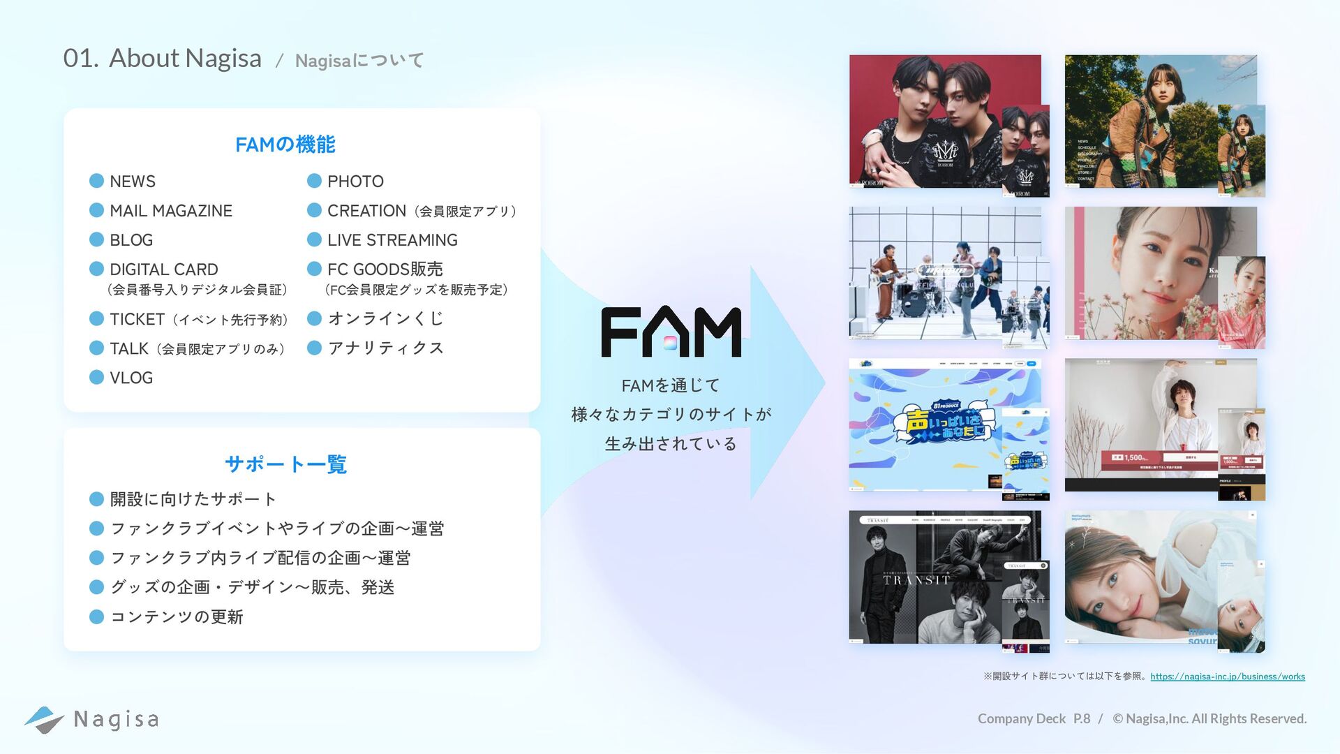 推し活市場の推移 日本の推し活人口は約1,400万人、 2020年から2025年の6年間における推し活人口の伸び率は約65.3% 2020 2021 2022 2023 2024 2025 835万人 860万人 900万人 990万人 1,140 万人 1,380 万人 "推し活"が当たり前の時代に 15-69歳の3人に1人が推し活をする時代になっている たった6年で 約 1.65倍 引用元:推し活総研「【推し活人口1400万人・市場規模3兆5千億円】大規模アンケート で分かった!拡がり続ける推し活市場」※2024年、2025年の推し活人口から推定 / Nagisaについて 01. About Nagisa