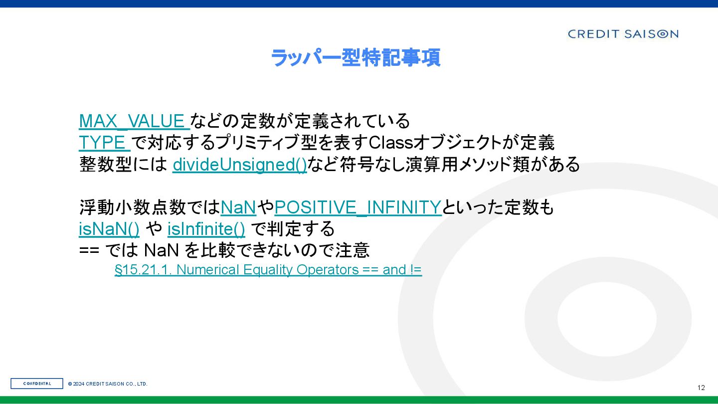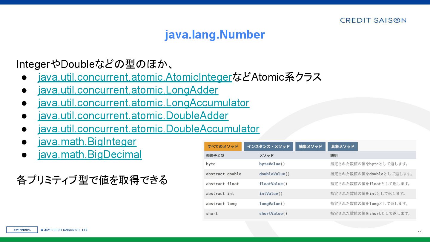 11. 11 © 2024 CREDIT SAISON CO., LTD. CONFIDENTIAL java.lang.Number IntegerやDoubleなどの型のほか、