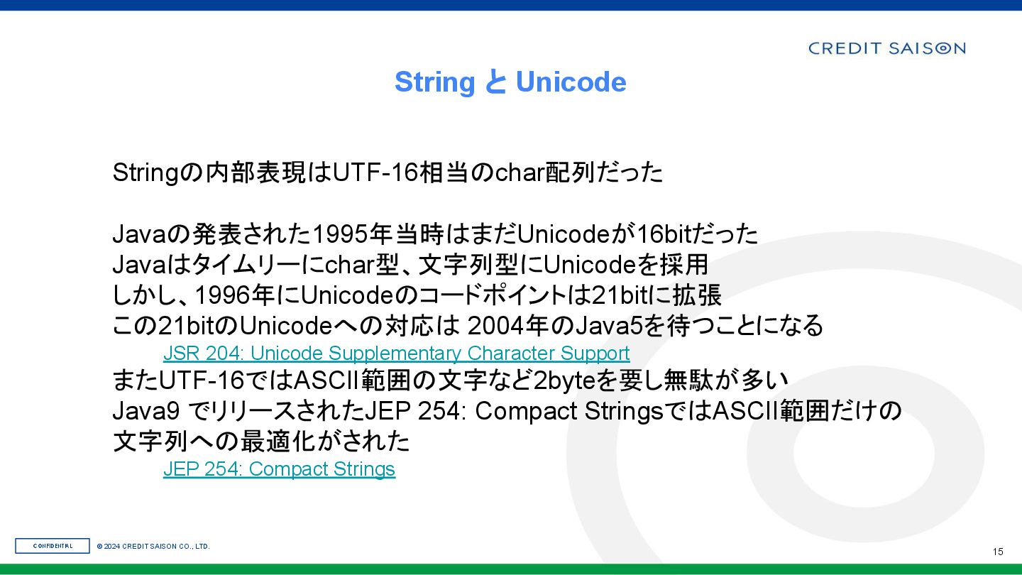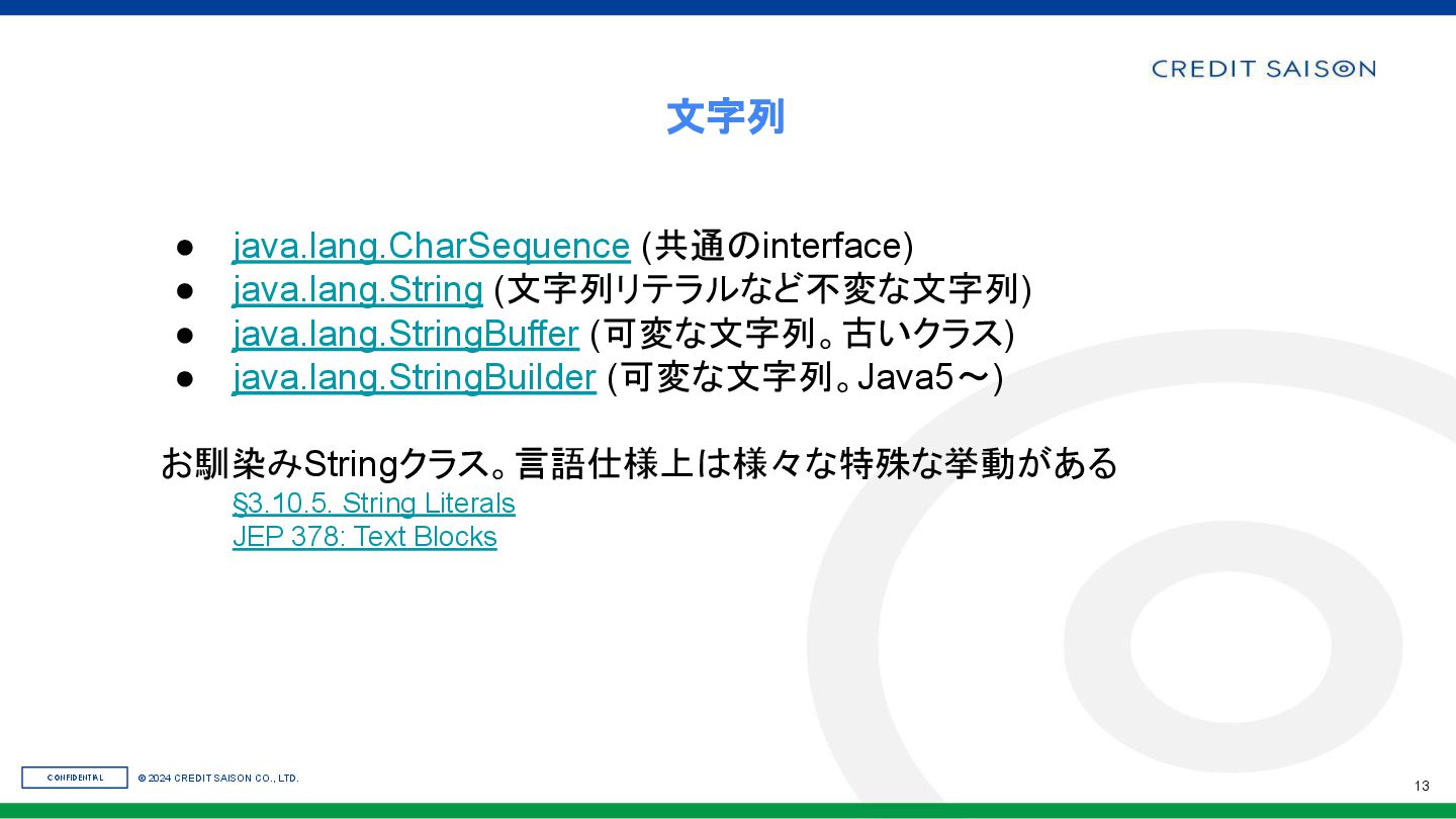 14. 14 © 2024 CREDIT SAISON CO., LTD. CONFIDENTIAL java.lang.String お馴染みStringクラス。言語仕様上は様々な