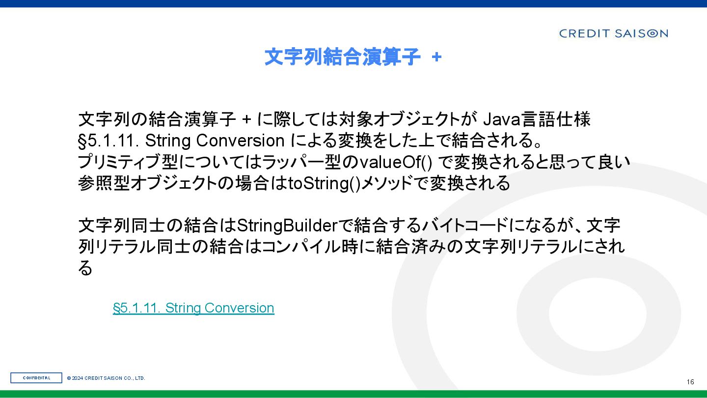 文字列の結合演算子 + に際しては対象オブジェクトが Java言語仕様 §5.1.11. String Conversion による変換をした上で結合される。 プリミティブ型についてはラッパー型のvalueOf() で変換されると思って良い 参照型オブジェクトの場合はtoString()メソッドで変換される 文字列同士の結合はStringBuilderで結合するバイトコードになるが、文字 列リテラル同士の結合はコンパイル時に結合済みの文字列リテラルにされ る §5.1.11. String Conversion