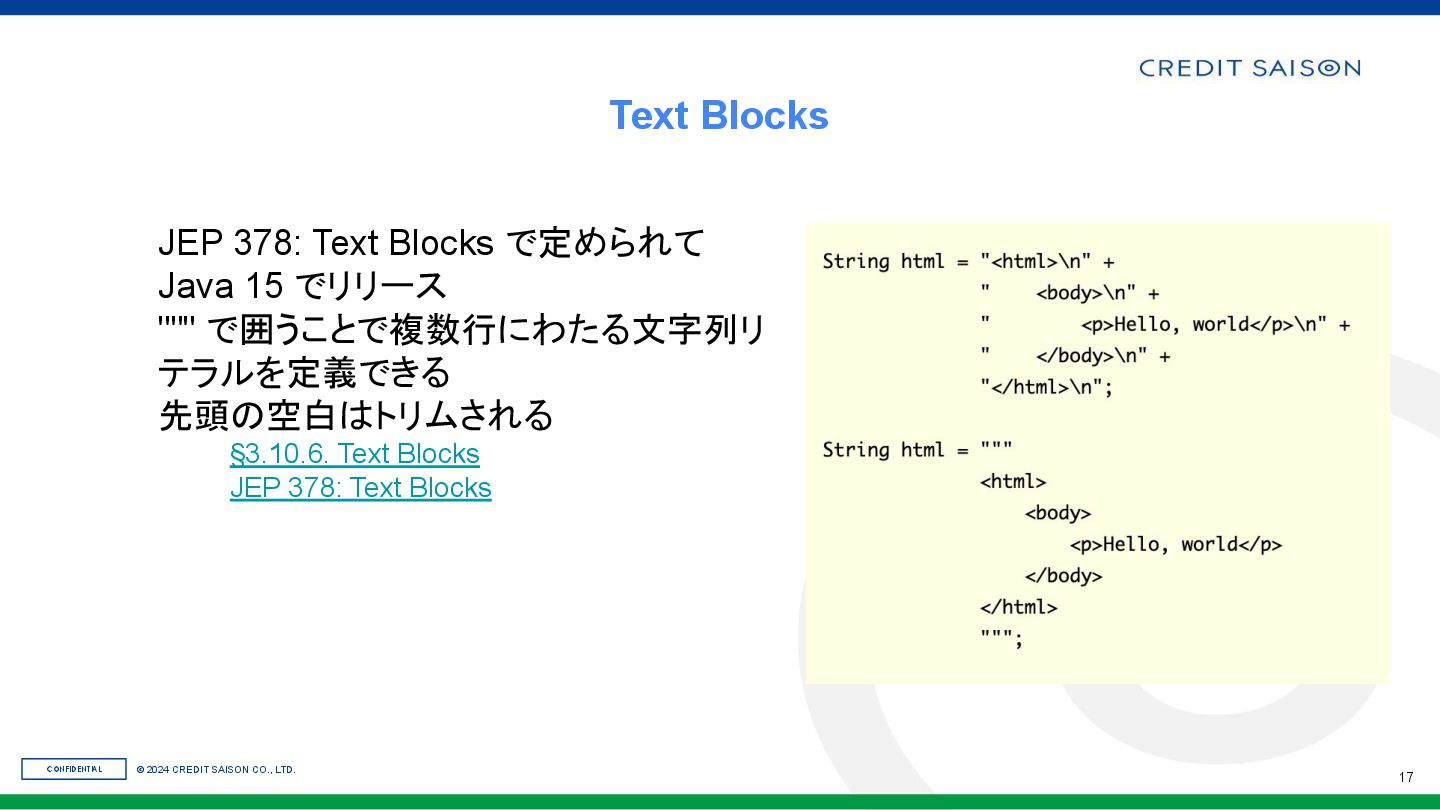JEP 378: Text Blocks で定められて Java 15 でリリース """ で囲うことで複数行にわたる文字列リ テラルを定義できる 先頭の空白はトリムされる §3.10.6. Text Blocks JEP 378: Text Blocks