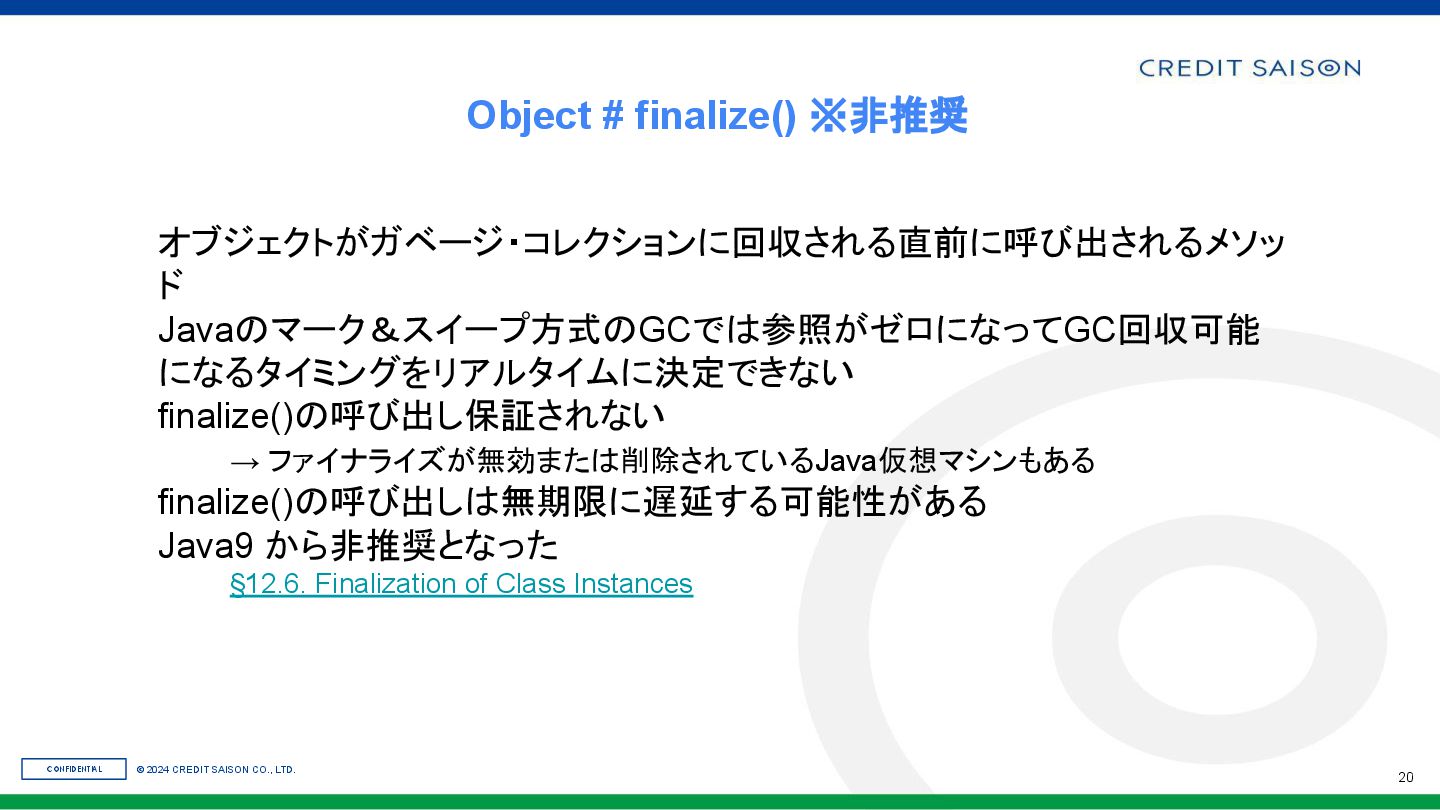 finalize() ※非推奨 オブジェクトがガベージ・コレクションに回収される直前に呼び出されるメソッ ド Javaのマーク&スイープ方式のGCでは参照がゼロになってGC回収可能 になるタイミングをリアルタイムに決定できない finalize()の呼び出し保証されない → ファイナライズが無効または削除されているJava仮想マシンもある finalize()の呼び出しは無期限に遅延する可能性がある Java9 から非推奨となった §12.6. Finalization of Class Instances