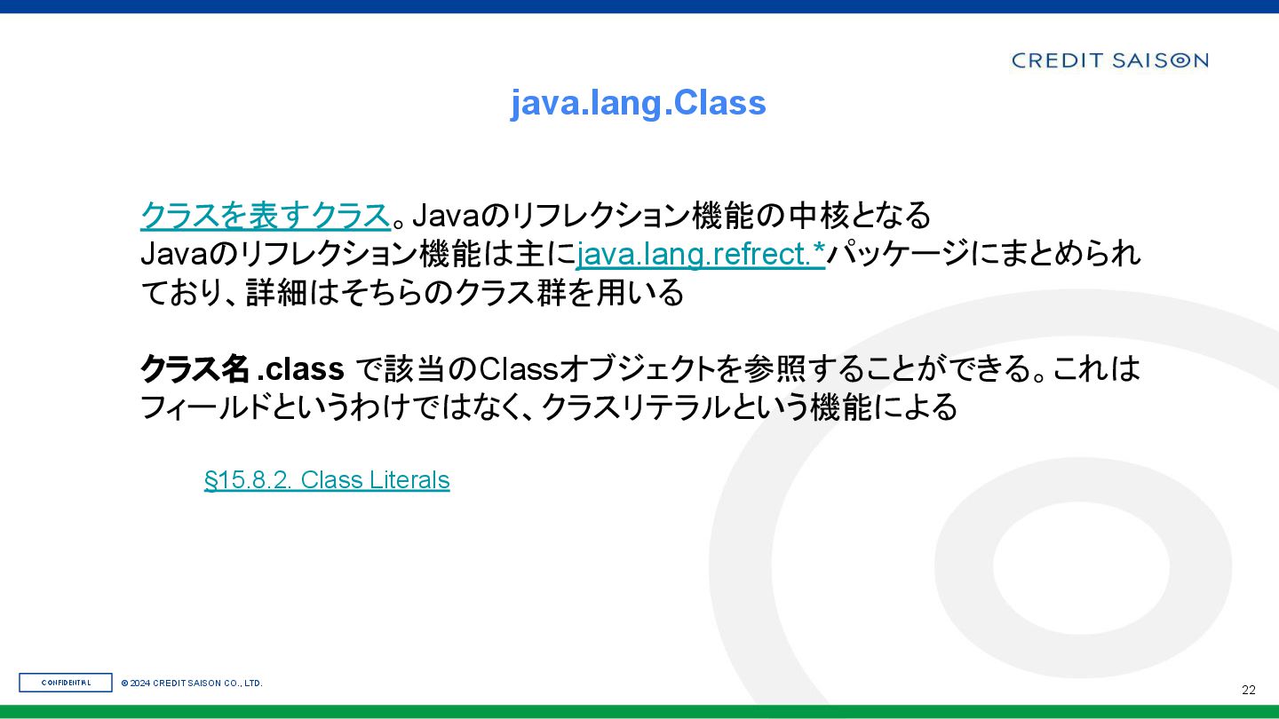 22. 22 © 2024 CREDIT SAISON CO., LTD. CONFIDENTIAL java.lang.Class クラスを表すクラス。Javaのリフレクション機能の中核となる