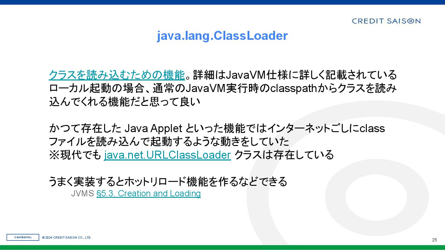 25. 25 © 2024 CREDIT SAISON CO., LTD. CONFIDENTIAL java.lang.ClassLoader クラスを読み込むための機能。詳細はJavaVM仕様に詳しく記載されている