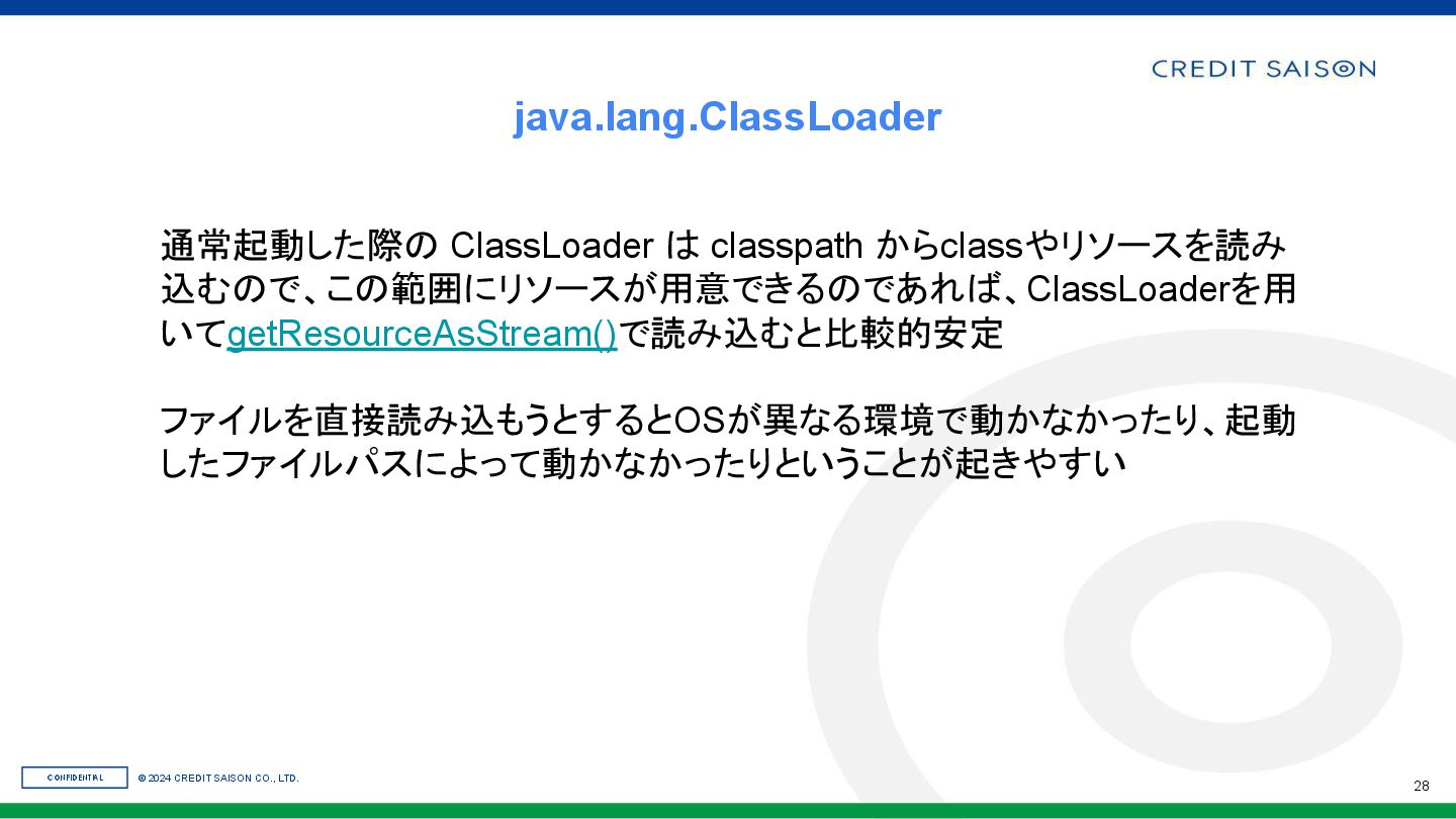 ClassLoader は classpath からclassやリソースを読み 込むので、この範囲にリソースが用意できるのであれば、ClassLoaderを用 いてgetResourceAsStream()で読み込むと比較的安定 ファイルを直接読み込もうとするとOSが異なる環境で動かなかったり、起動 したファイルパスによって動かなかったりということが起きやすい