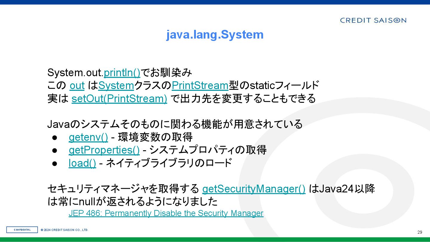 この out はSystemクラスのPrintStream型のstaticフィールド 実は setOut(PrintStream) で出力先を変更することもできる Javaのシステムそのものに関わる機能が用意されている • getenv() - 環境変数の取得 • getProperties() - システムプロパティの取得 • load() - ネイティブライブラリのロード セキュリティマネージャを取得する getSecurityManager() はJava24以降 は常にnullが返されるようになりました JEP 486: Permanently Disable the Security Manager