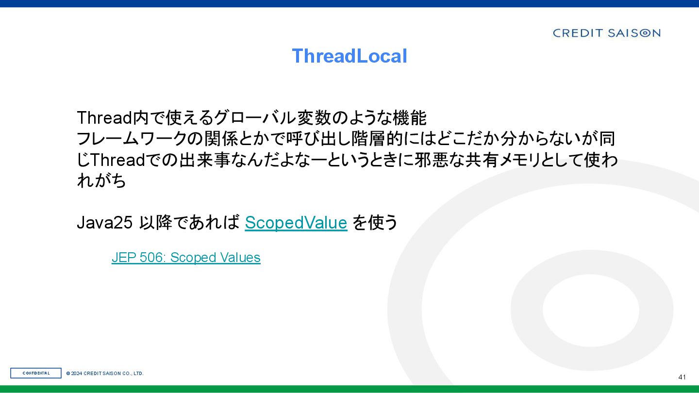 41. 41 © 2024 CREDIT SAISON CO., LTD. CONFIDENTIAL ThreadLocal Thread内で使えるグローバル変数のような機能